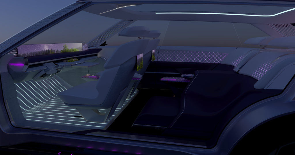 Using the area no longer occupied by a gas engine, a front trunk allows for ample storage, expanding the feeling of spaciousness inside. With electro-chromatic glass that changes from transparent to opaque, the front trunk is instantly recognizable, allowing light in when the vehicle is in motion and darkening to hide stored valuables when parked. Under the front trunk, illuminated first-row floors flow uninterrupted into the interior, creating an airy, open cabin.
