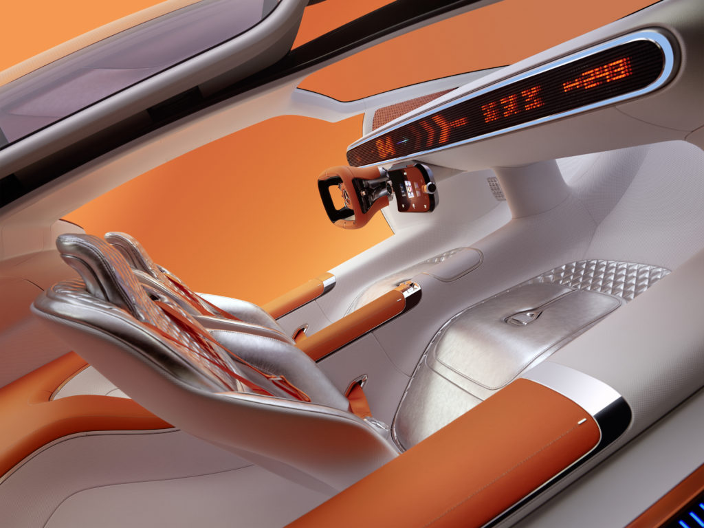 The interior design of the Vision One-Eleven reflects future luxury based on a progressive colour concept and extraordinary material combinations. The richly contrasting colours and materials attract attention at first glance: Large surfaces such as the dashboard are upholstered in white fabric displaying a tech-look honeycomb structure. The material is made from 100-percent recycled polyester. Other elements such as the armrests on the sills and centre console, as well as the rear parcel shelf beneath the expansive rear windscreen, are clad in bright orange leather. This creates a smooth transition from interior to luggage compartment. The sustainably processed leather was tanned using coffee bean husks. Polished aluminium in the steering-wheel spokes and inlaid as straps across the armrests underscore the tech look and feel. The same applies to the brake and accelerator pedals, both of which are made from polished aluminium and floor mounted.
