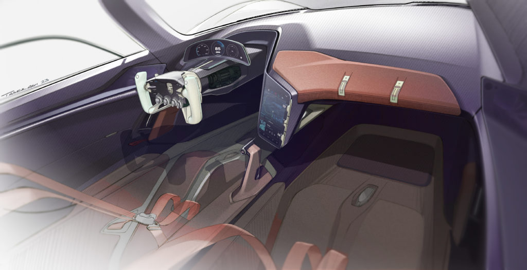 The driver focus can also be seen in the asymmetry of the interior and its colour concept: the two seats are coloured differently. Apart from the customisable parts of the 3D-print bodyform full bucket seats, the driver’s seat is Kalahari Grey and matches the colour of the centre console and instrument panel. The passenger seat, meanwhile, is finished in contrasting Andalusia Brown. An LED light strip is integrated in the centre of both seats. This greets the occupants with a ‘welcome’ gesture.