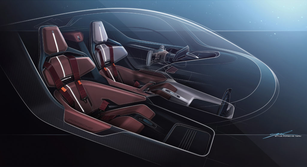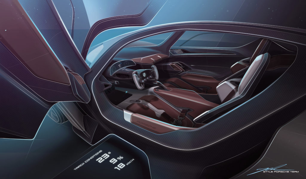 Equally sensational: the Le Mans-style doors are attached to the A-pillars and the roof, and they open forwards and upwards. This type of door was previously used in the legendary Porsche 917 racing car. There is a projector integrated in the driver’s door. This underscores the performance-oriented approach yet again: the current conditions on the racetrack are projected onto the ground: outside temperature, relative humidity and wind speed are displayed digitally to the driver before they climb into the car.