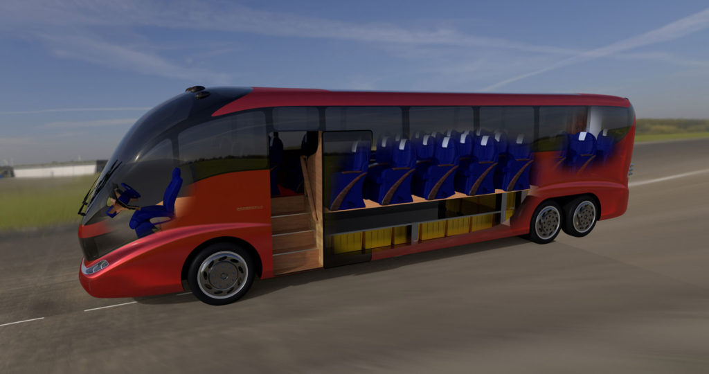 Since aerodynamics on a long distance zero emission coach are from the utmost importance to extend the range and reduce the drag coefficient, Steenstra suggested a central driving position to reduce the initial frontal impact of the coach, allowing it to improve its drag coefficient substantially compared to all major competitors. The coach would be built for the Chinese as well as the US markets, so the central driving position would prove to be of importance in that area as well, since it reduces the cost for making special LHD and RHD version of the coach.