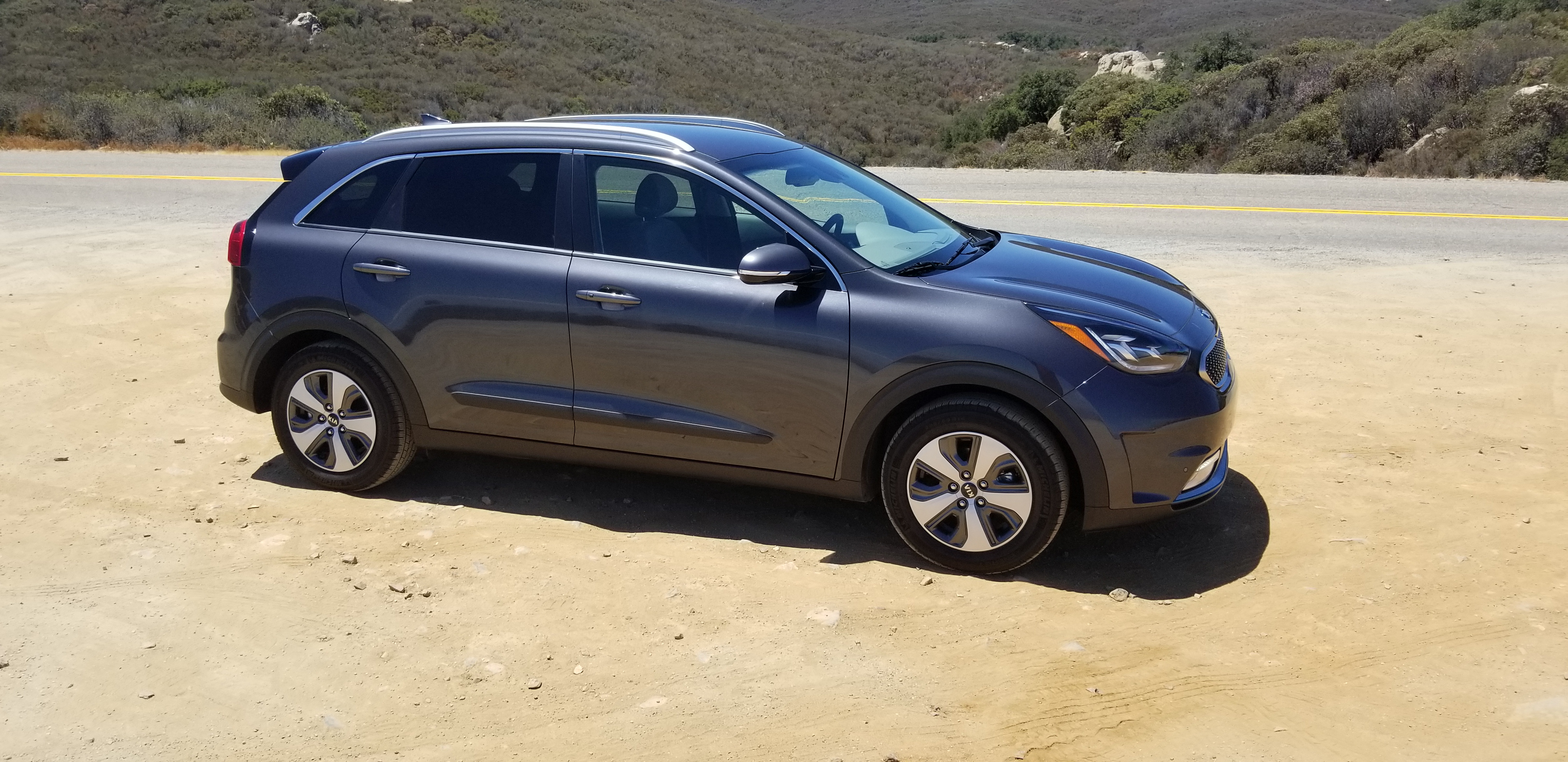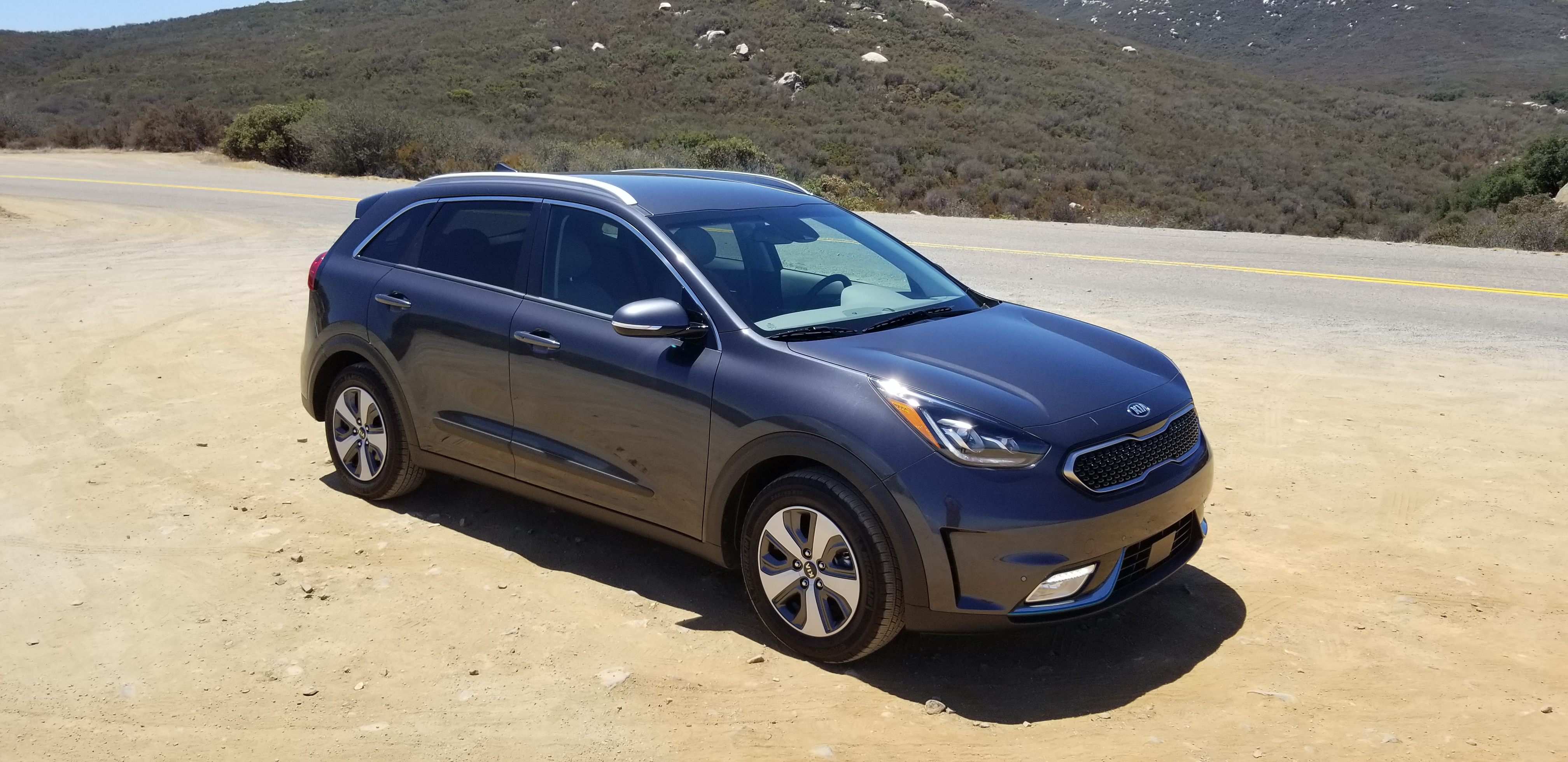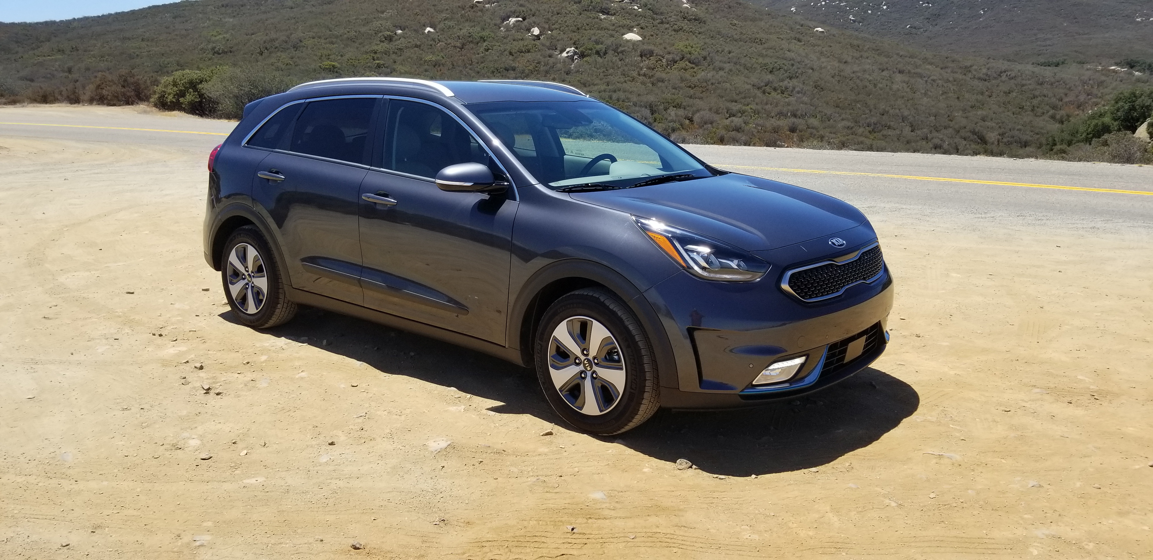 So I could try it out for myself here in this Kia Niro, and indeed, with a full charge and a full tank my range was well close to the 500 miles range, which is perfect in my opinion. Of course it shares a lot of the technology with the Hyundai Ioniq, and I have been really enthsiastic about that one already, but this is a different vehicle all together. It is not sleek and round like the Ioniq, it is functional and aesthetically more conservative, but also in its build it seems to have more substance, be built with better materials, thicker, more quiet. Perceived quality level is a lot higher to me. With the Ioniq I heard a lot of noise from the rear wheel wells, in the Kia Niro I did not have that issue at all.