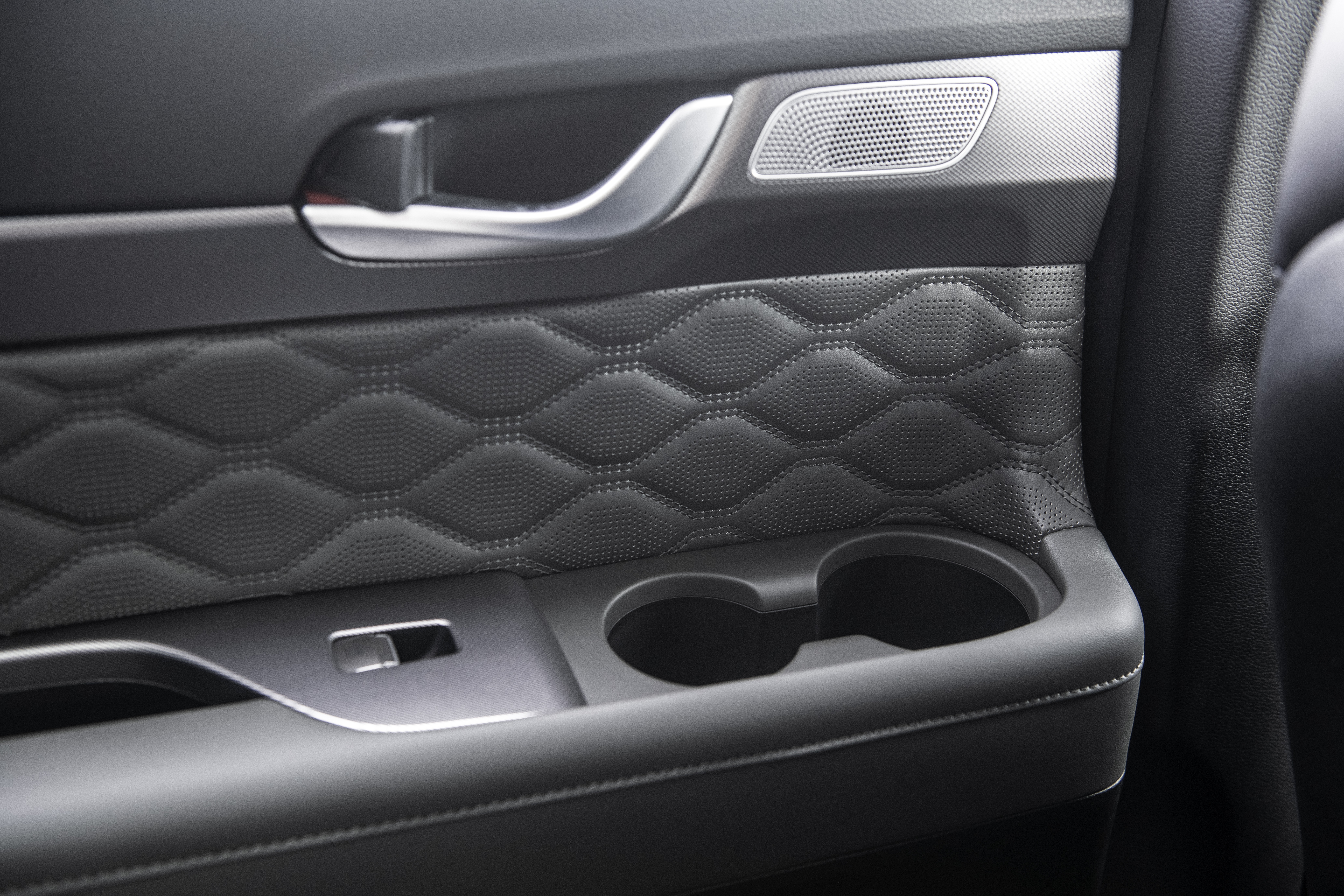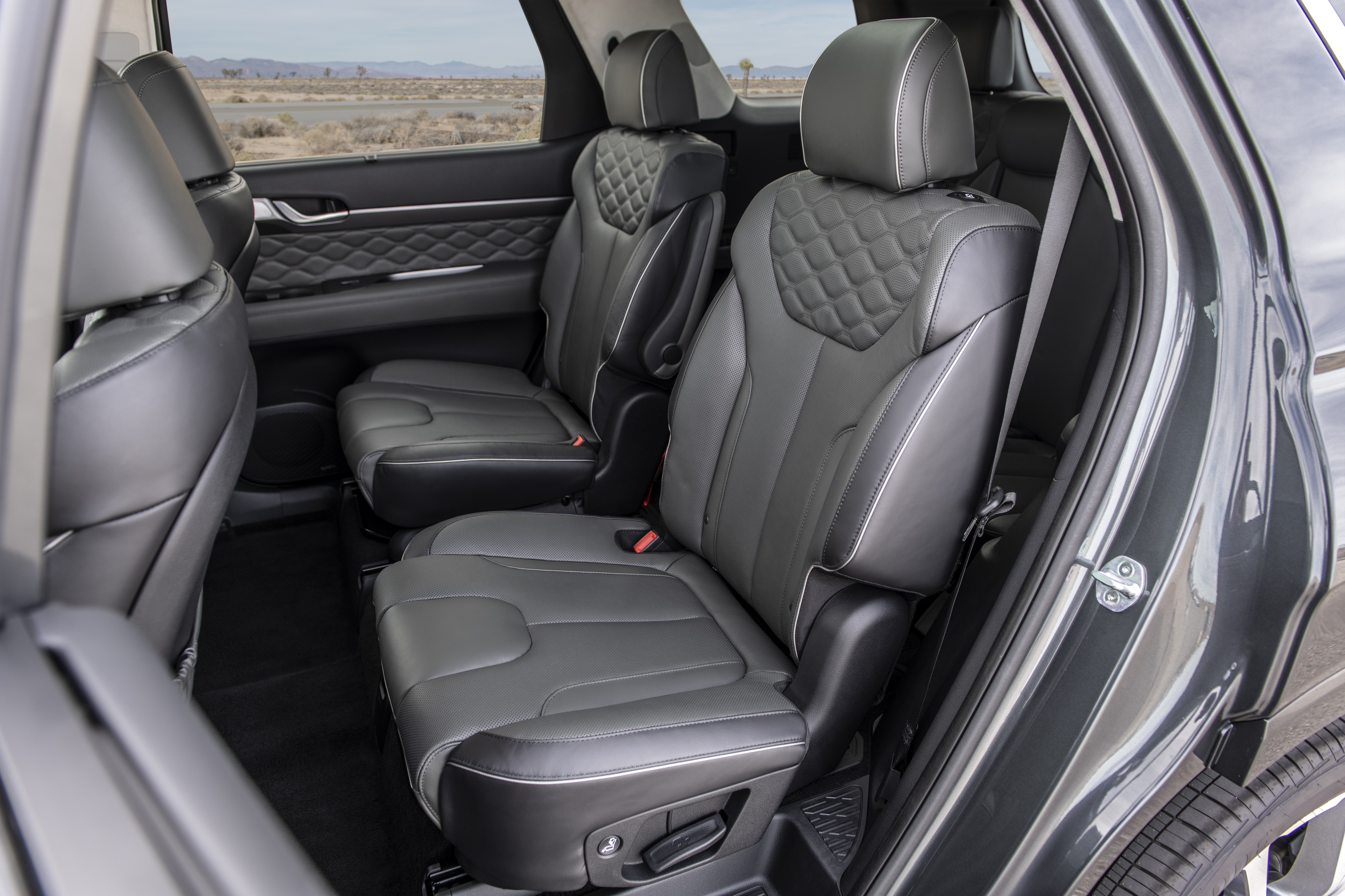 The interior design combines a sense of relaxation and comfort creating a serene environment with eight-passenger seating standard for family adventures. Leather-equipped models offer a premium, quilted Nappa leather, while on the instrument panel, smooth woodgrain trim in a wraparound interior design create a spacious, comfortable ambience. The One-Touch second row seat allows for one-touch operation of the seat forward and out of the way for easy access into and out of the third-row seat. For more convenience, the third row offers power-folding/unfolding and reclining seats. Second-row captain’s chairs are also available with ventilated seating surfaces. Every Palisade seating row offers USB outlets for convenience for all passengers, for a total of seven available USB outlets. Even more, a conversation mirror allows the driver to clearly see passengers in the rear.