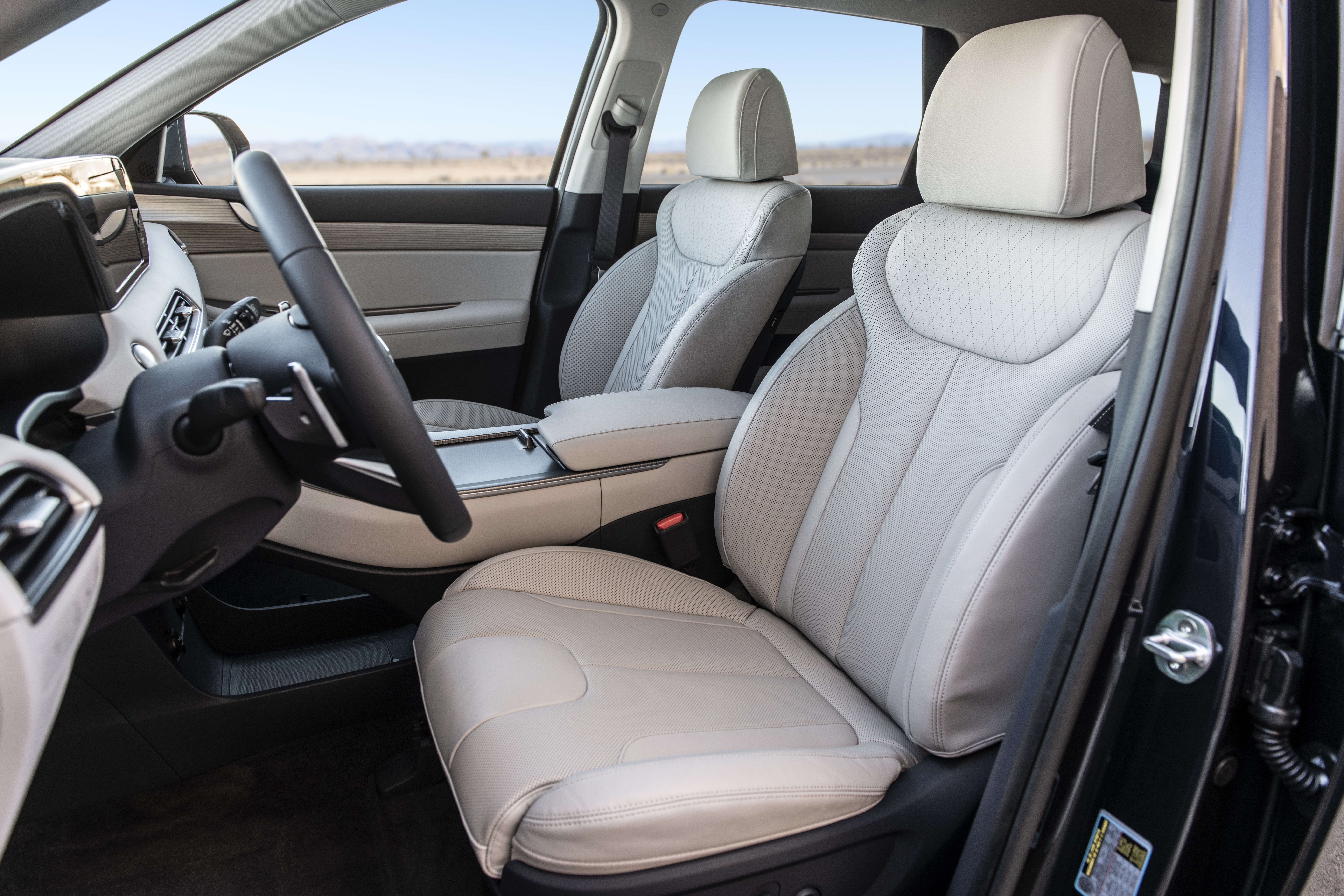Palisade also offers a class-exclusive Blind View Monitor that complements the standard Blind Spot Collision Avoidance Assist, which provides easy-to-see body-side views whenever the turn signal is activated. The audio and navigation display is a generous 10.25 inch touchscreen in widescreen format, coupled with a 12.3-inch fully-digital TFT center instrument cluster offering various view modes and differentiated drive mode illumination. Two Bluetooth® devices can be connected simultaneously, with one for a mobile phone connection and the other for audio streaming. The single instrument panel gauge cluster integrated with navigation offers exceptional legibility and ease of use, coupled with an available head-up display feature. Center console innovations such as shift-by-wire controls free up valuable control space for the features drivers use most. The shift-by-wire system also includes automatic park logic that shifts the vehicle into park when the engine is off and the driver opens the door. Palisade’s center console bridge design also frees up convenient storage space underneath the center console control area with driver and passenger access. The interior features seven available USB outlets, including front-seatback-based USB outlets for the second row occupants and mini-pockets for digital devices of all kinds. A generous 16 cupholders means there’s always a place to stow a beverage at any seating position. Seatbelt connection notification to the driver is active in every seating position.