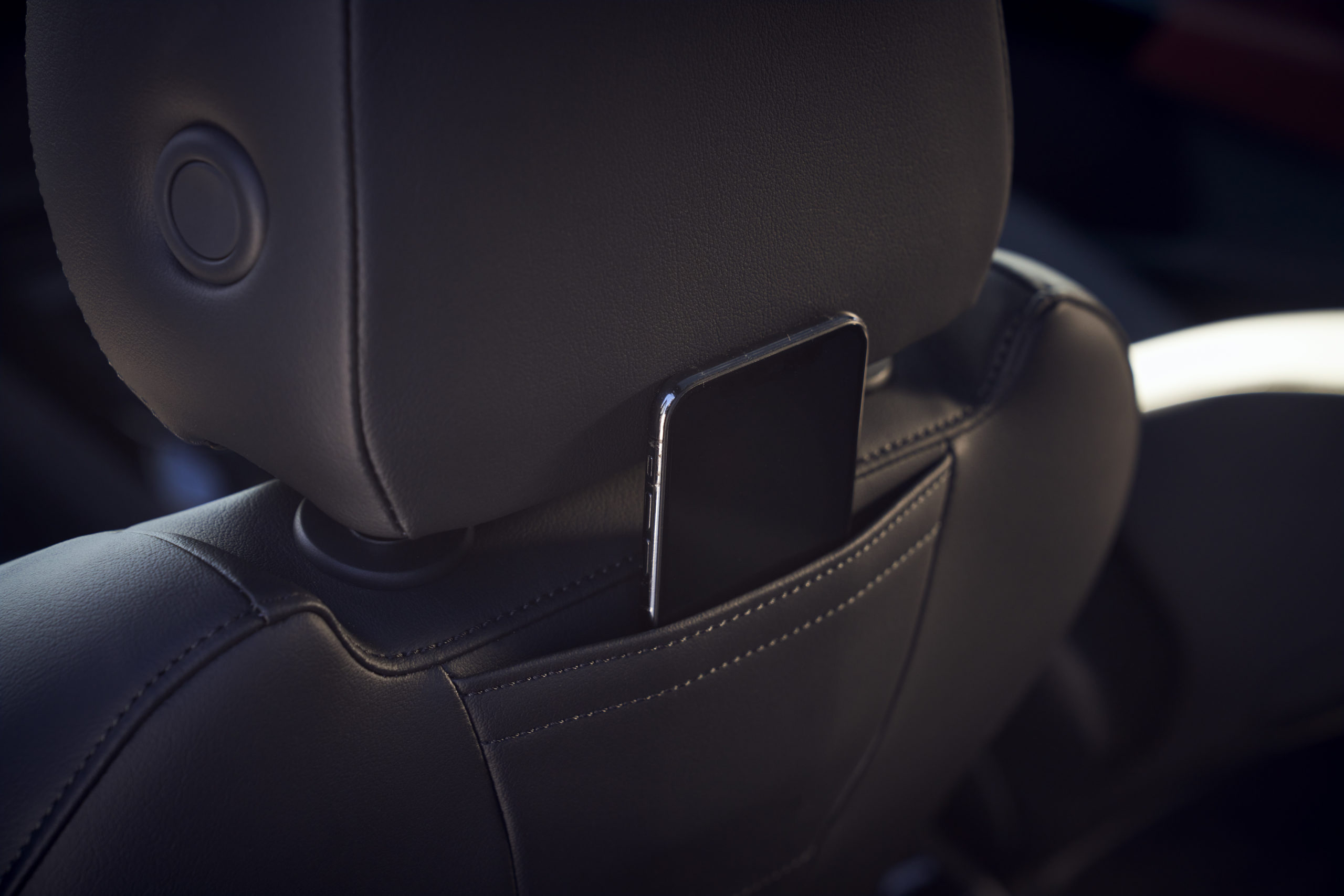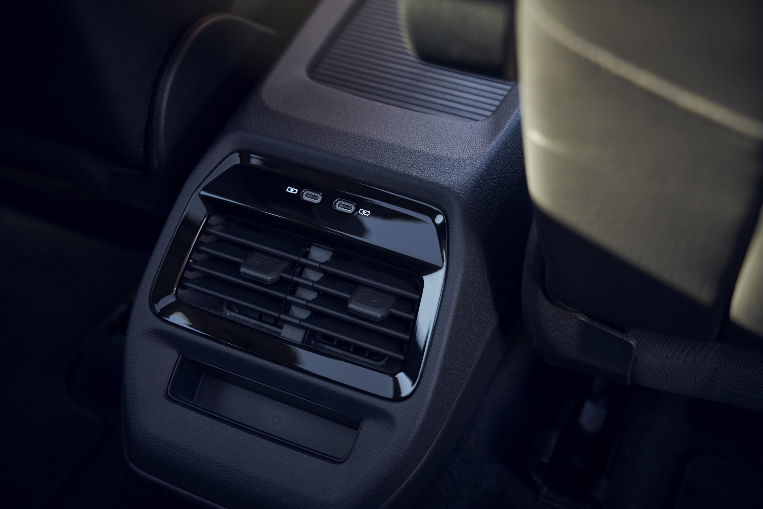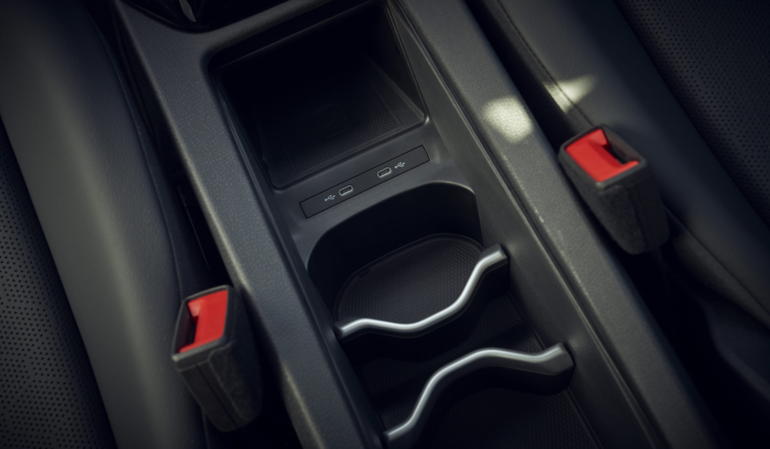Running between the front seats is a long, spacious center console. Both the front portion, with cupholders, and the rear, with a roller shutter, are modular in design and can be reconfigured with adaptable inserts. Inside the rear compartment is an illuminated wireless charging pad for compatible mobile phones and two USB-C ports. On the backside are two more USB-C charging ports for rear-seat passengers.