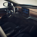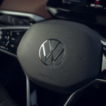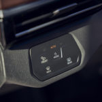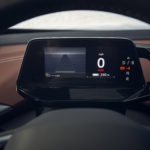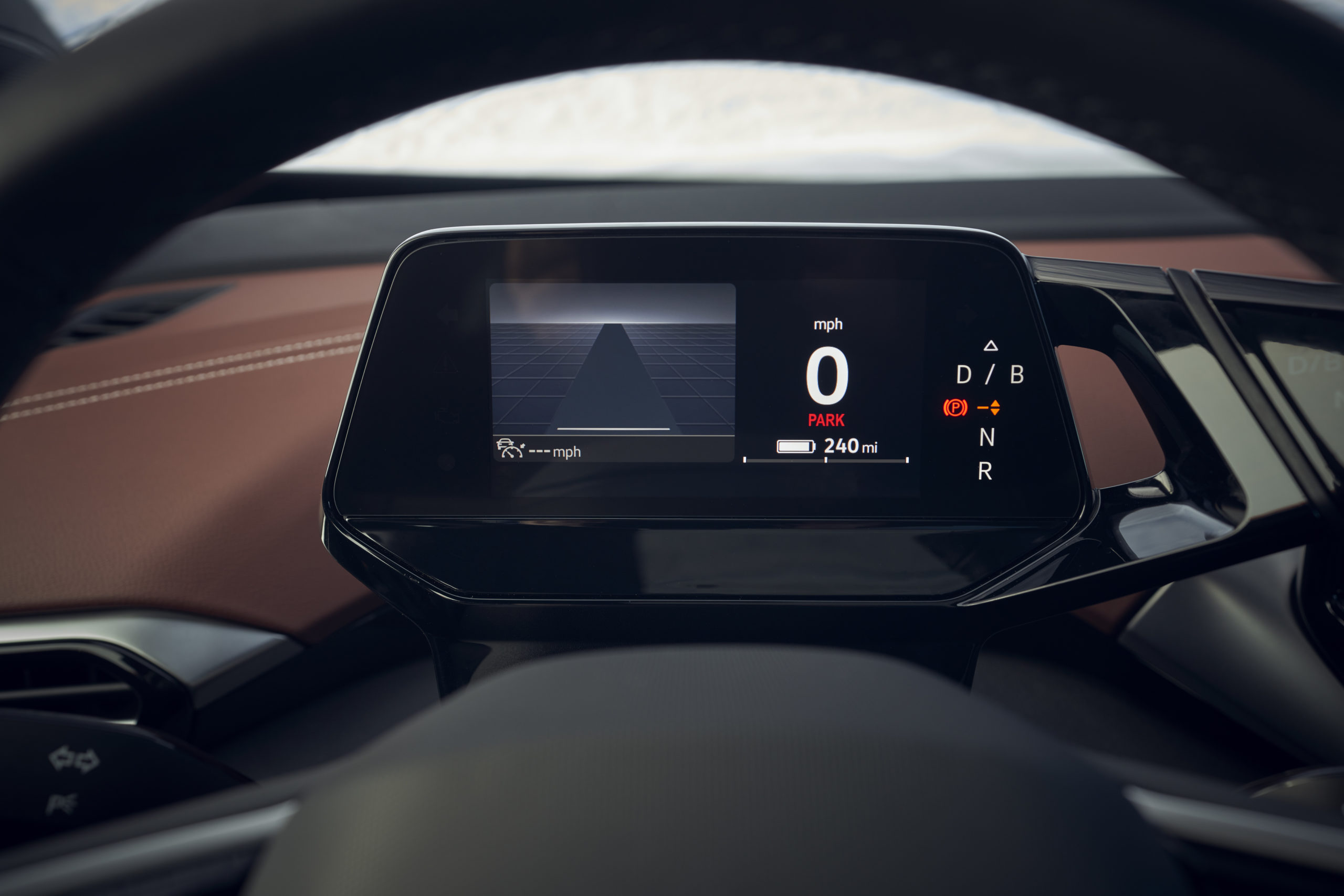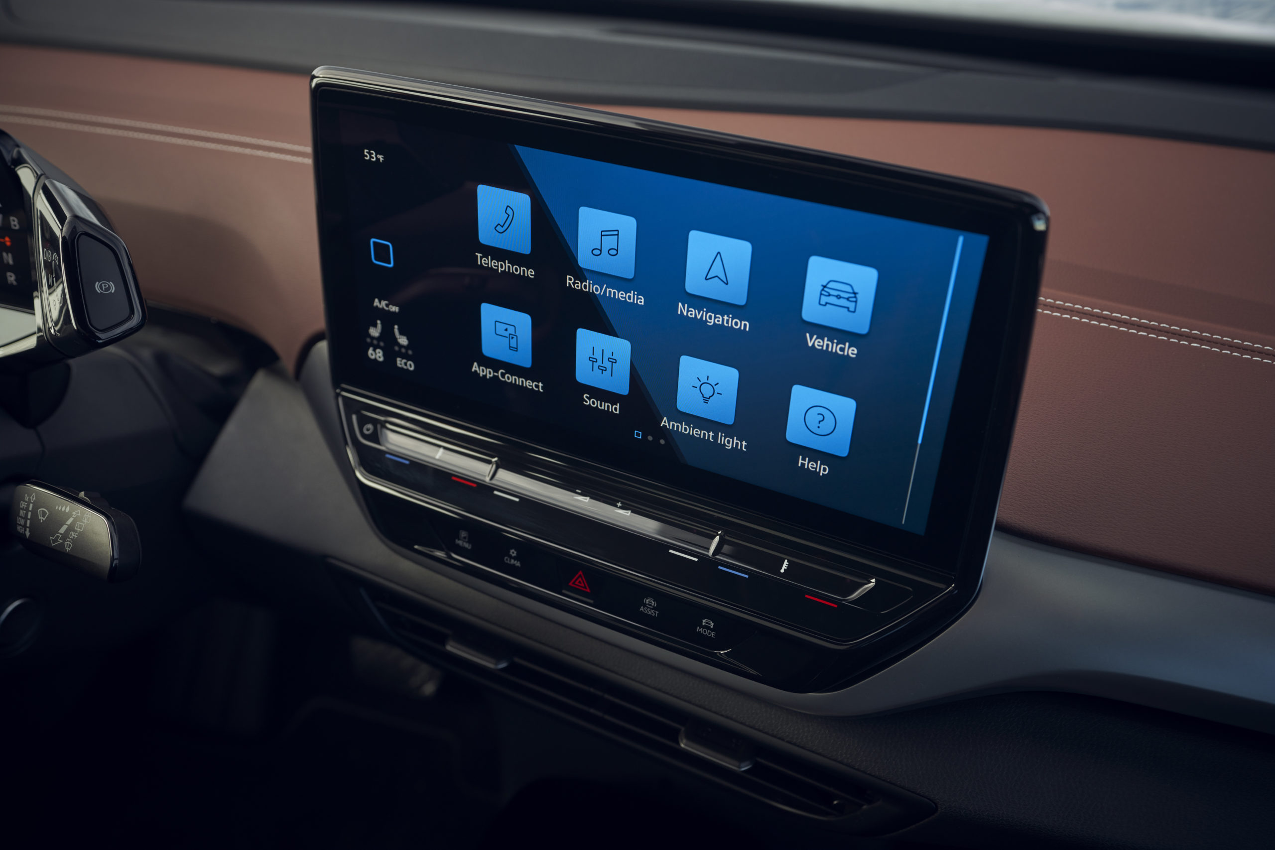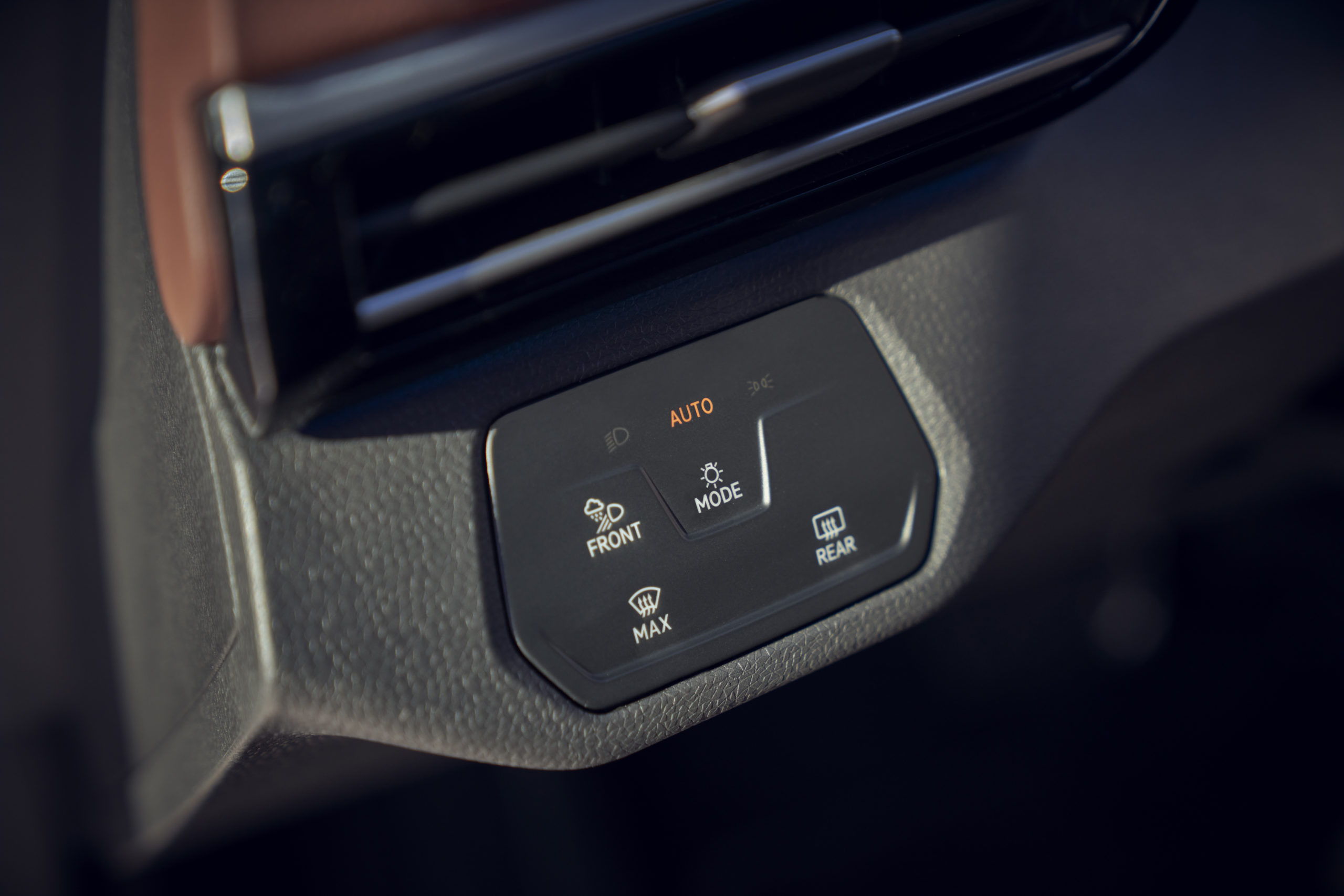 The interior of ID.4 mirrors the futuristic look of the exterior, with functionality almost completely controlled by touch or voice control—there are very few actual buttons. The ID.Cockpit display in front of the driver is operated with touch-sensitive controls on the leather-wrapped multifunction heated steering wheel which provide haptic feedback. Up to three tiles show the most important information, with the display for battery status and range underneath. A control panel to the left of the steering wheel integrates the lighting functions, including the automatic headlights and defrosters.