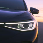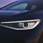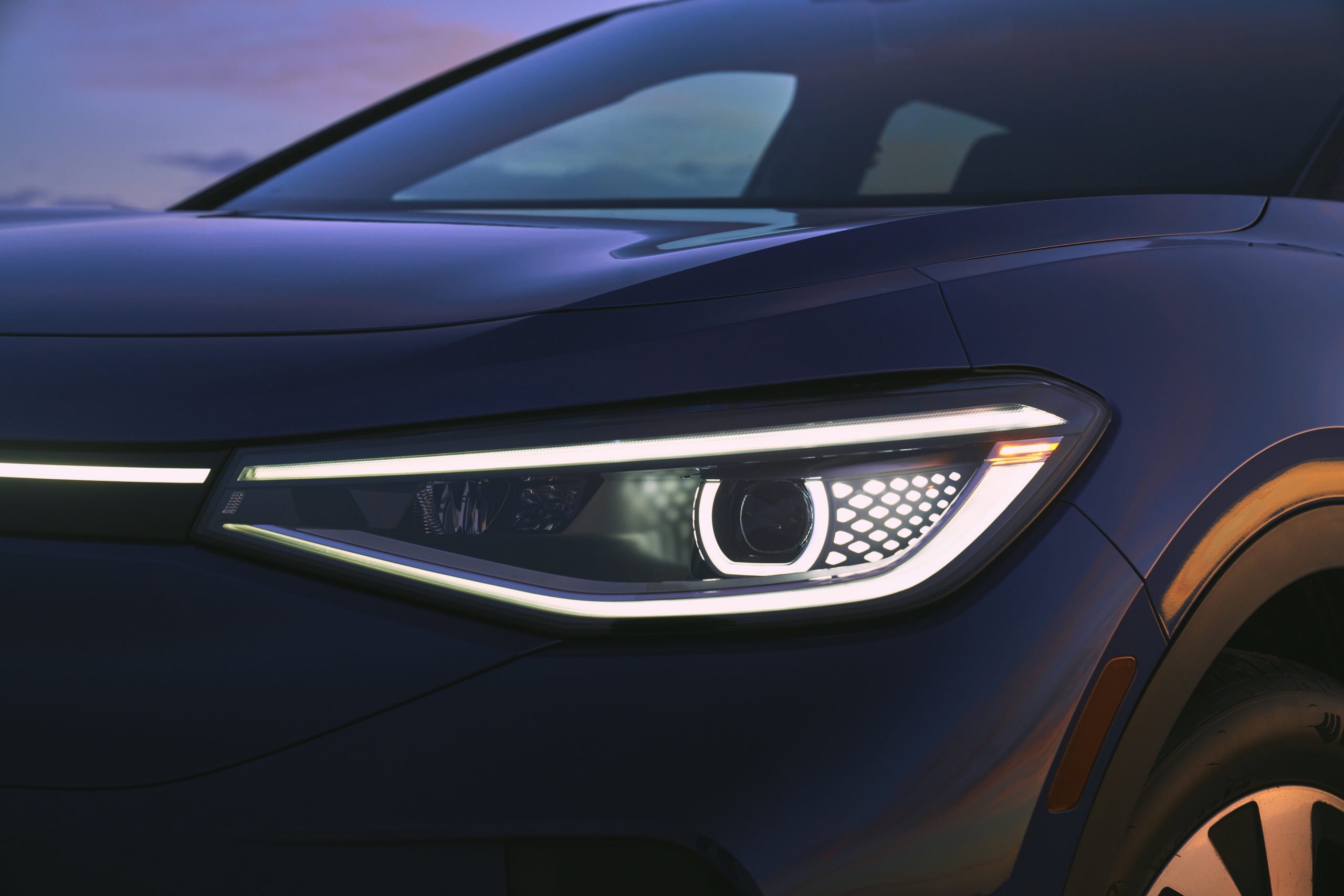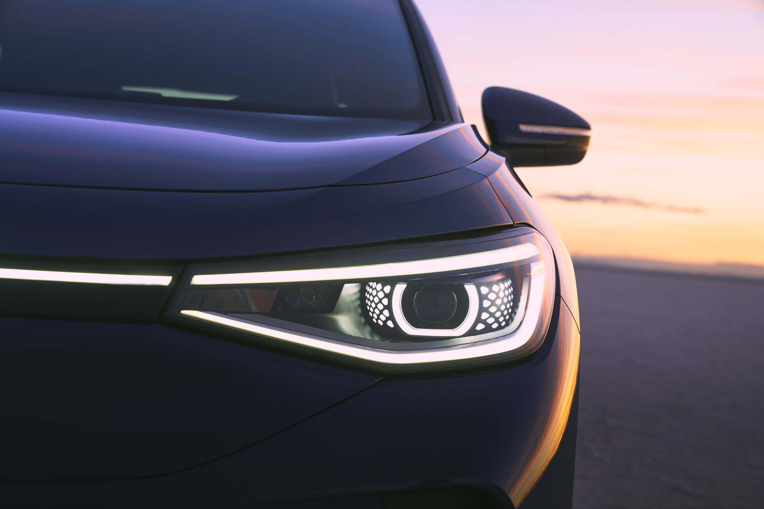 Large LED headlights give the electric SUV a friendly but focused expression. An LED strip at the top of the headlight functions as the Daytime Running Lights (DRLs). Pro S and 1st Edition models add premium LED projector headlights with Volkswagen’s Adaptive Front-lighting System (AFS) and an illuminated light line stretching towards the center of the vehicle, creating a striking light signature. The headlights feature a diamond-pattern design on the housing, and are framed by illuminated rings that are flattened at the bottom. Pro S models also sport an illuminated Volkswagen logo.