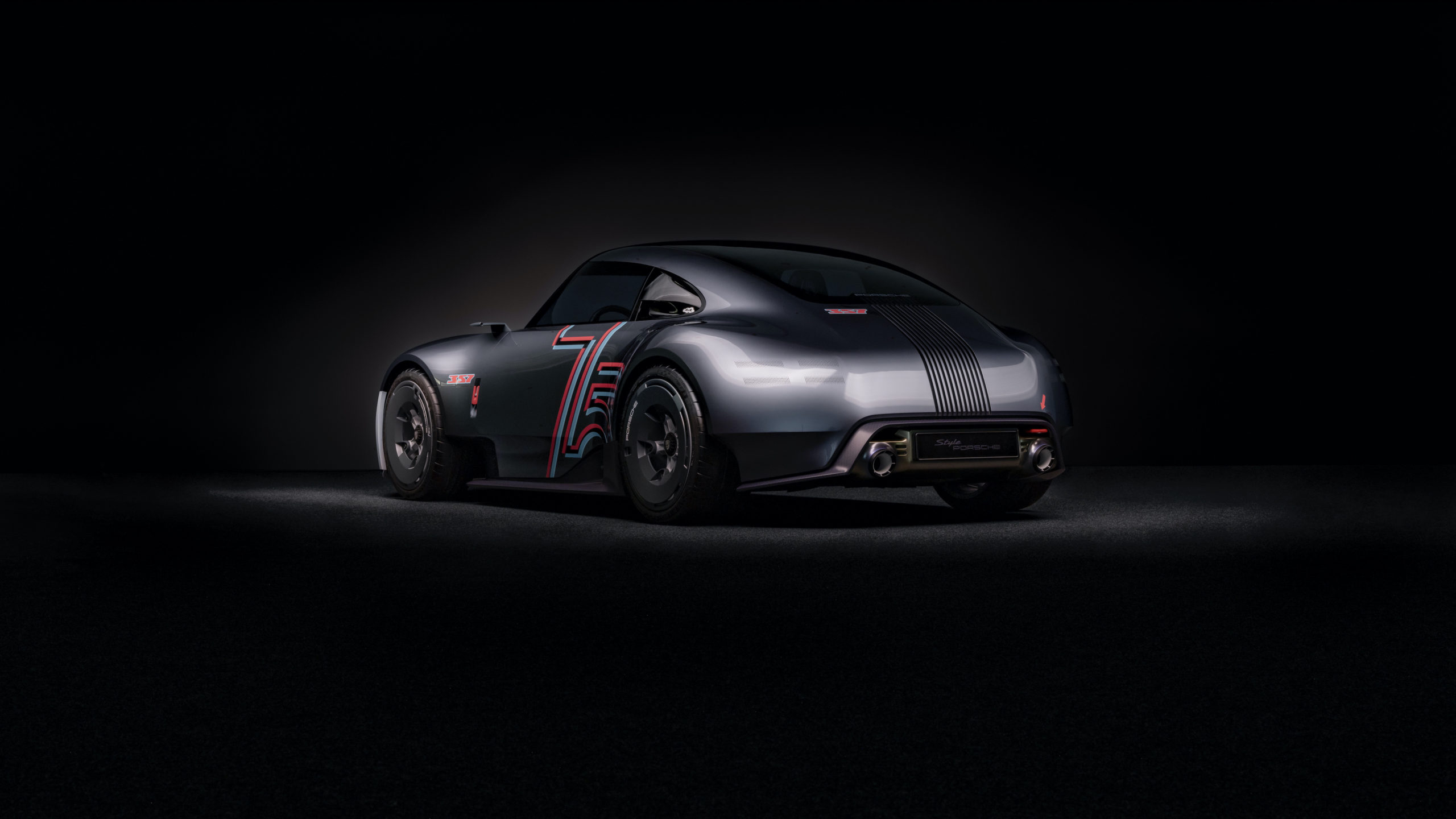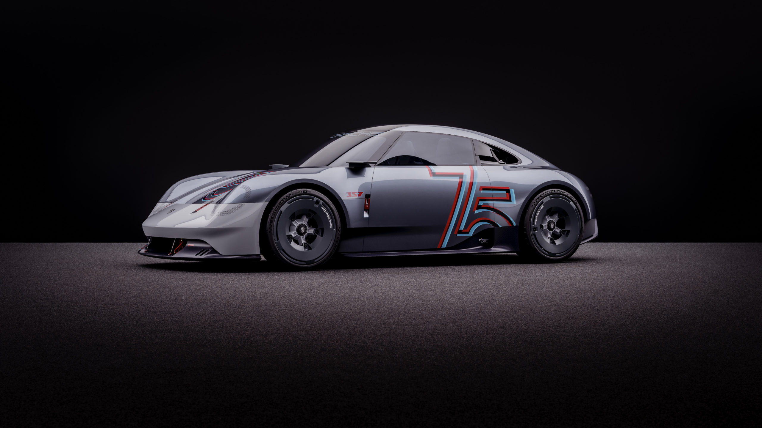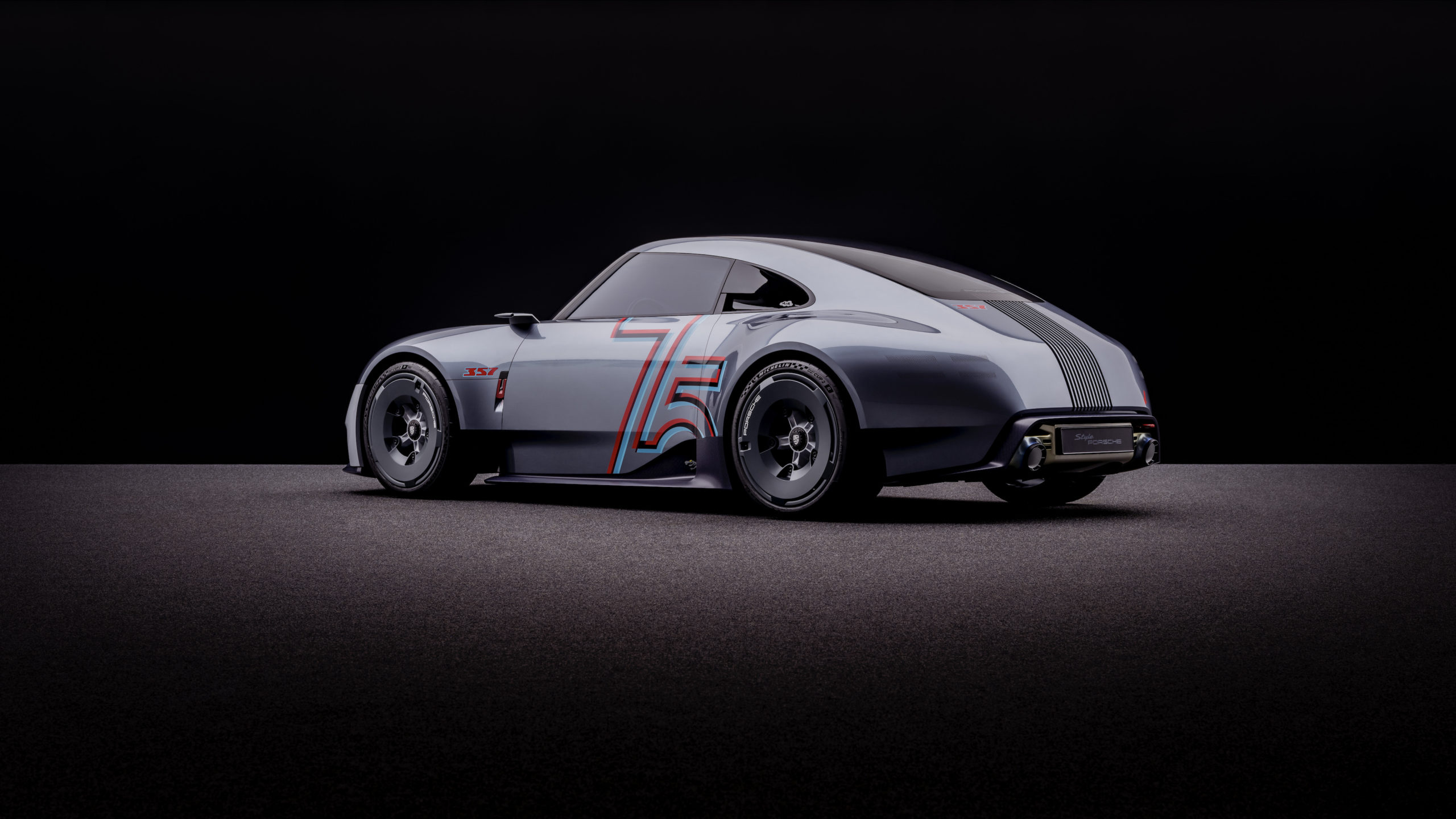 The “75” anniversary logo adorns the doors and the front of the concept car like a start number. And that is far from the only detail from the world of racing: there’s nothing behind the lower area of the front wheels, which allows better ventilation of the wheel arches. The wrap-around, jointless front hood is fastened with quick-release mechanisms. Threaded rods stabilize the large front spoiler. On the side sills, the Porsche designers employed natural fiber-reinforced plastic (NFRP) – as in the Porsche Mission R, the concept study for an all-electric GT racing car presented in 2021. The basis for the sustainable materials is provided by flax fibers from agriculture. Instead of traditional exterior mirrors, the concept car is equipped with cameras on the edge of the roof. The visible tailpipe trim in the rear is made of a blueish-looking titanium, while the inside of the tailpipe is made of ceramic.