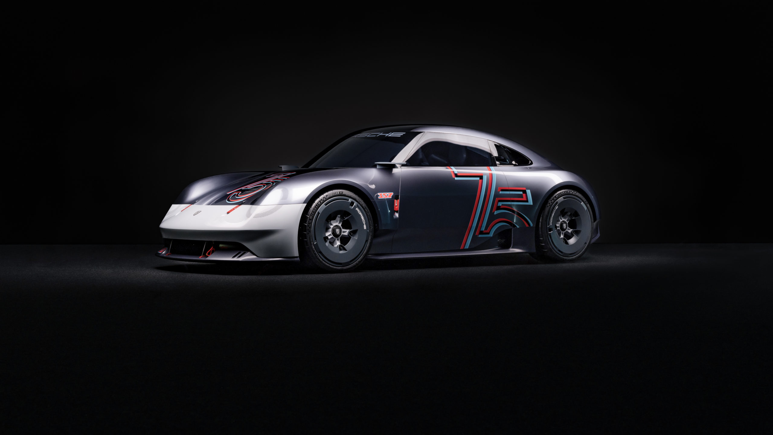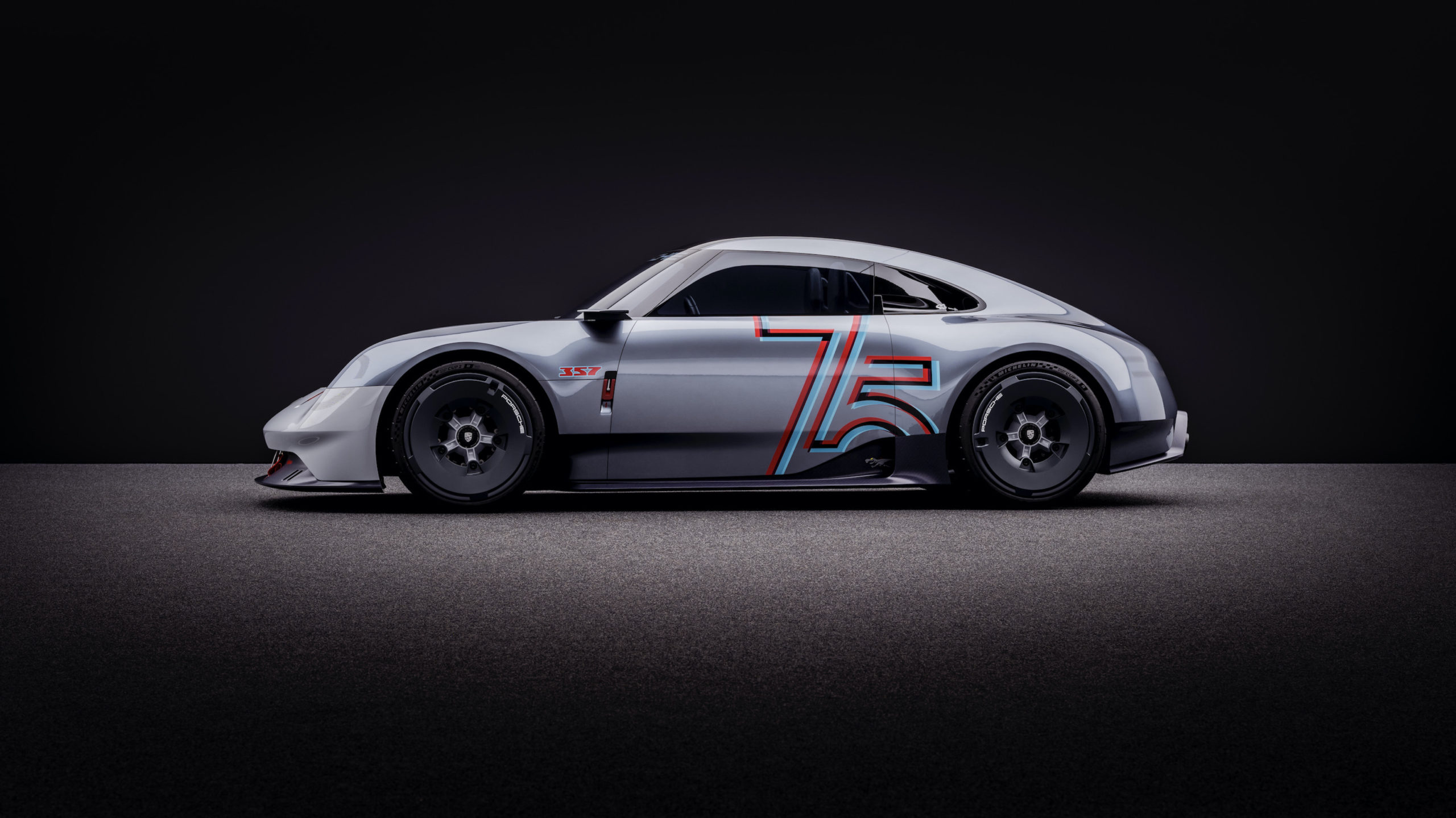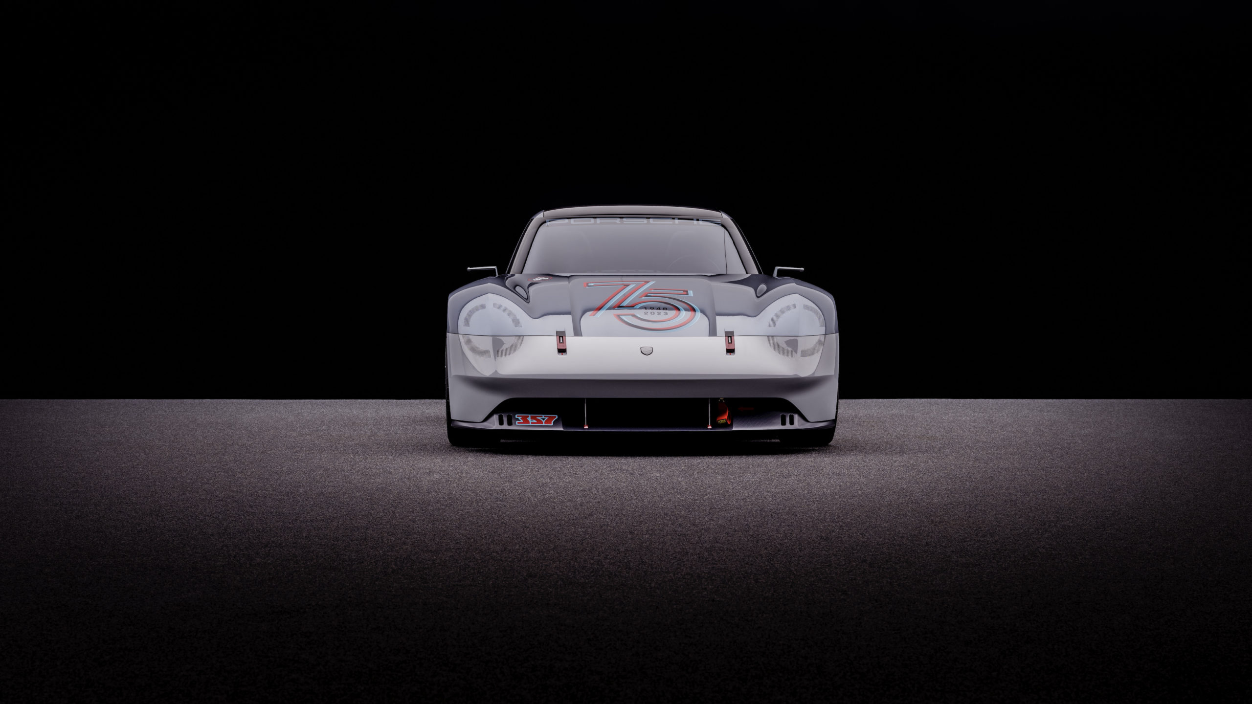 The “75” anniversary logo adorns the doors and the front of the concept car like a start number. And that is far from the only detail from the world of racing: there’s nothing behind the lower area of the front wheels, which allows better ventilation of the wheel arches. The wrap-around, jointless front hood is fastened with quick-release mechanisms. Threaded rods stabilize the large front spoiler. On the side sills, the Porsche designers employed natural fiber-reinforced plastic (NFRP) – as in the Porsche Mission R, the concept study for an all-electric GT racing car presented in 2021. The basis for the sustainable materials is provided by flax fibers from agriculture. Instead of traditional exterior mirrors, the concept car is equipped with cameras on the edge of the roof. The visible tailpipe trim in the rear is made of a blueish-looking titanium, while the inside of the tailpipe is made of ceramic.