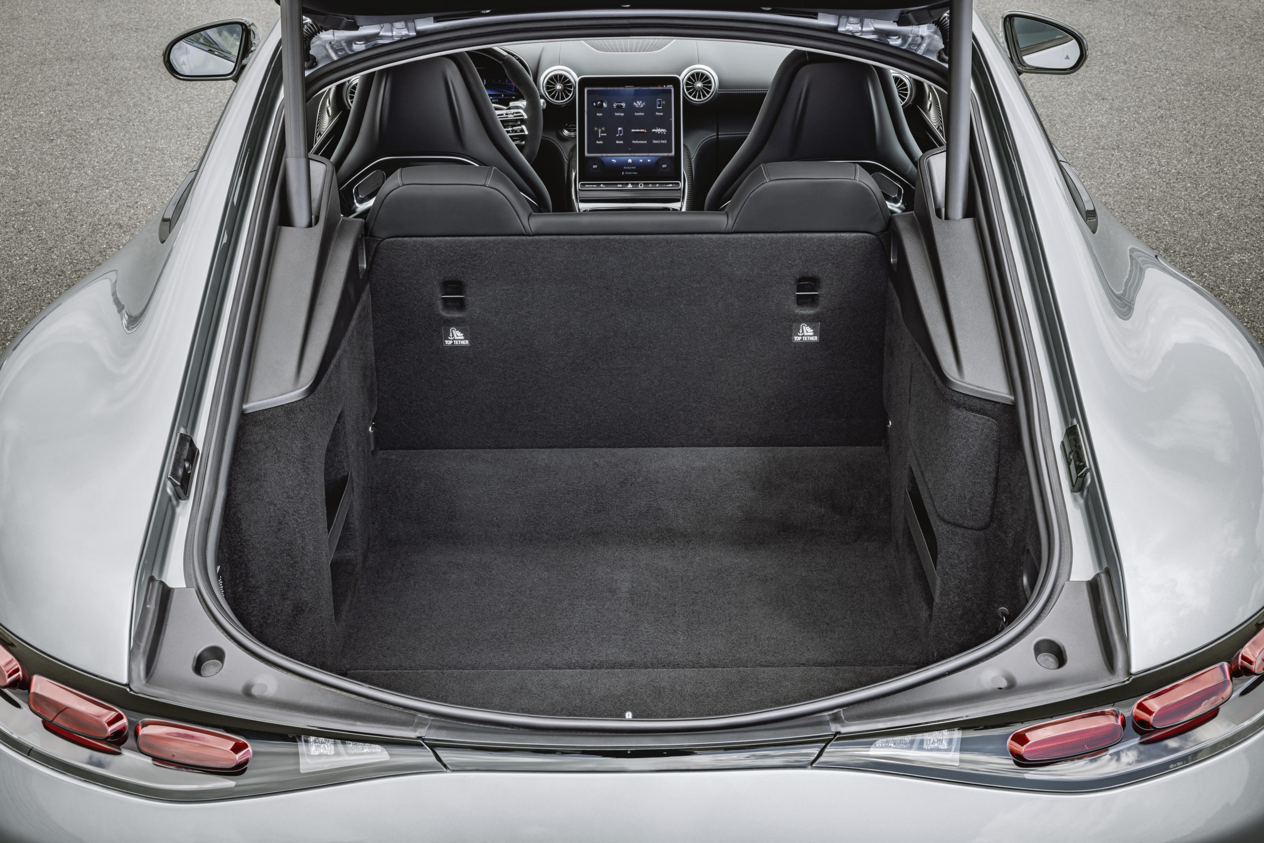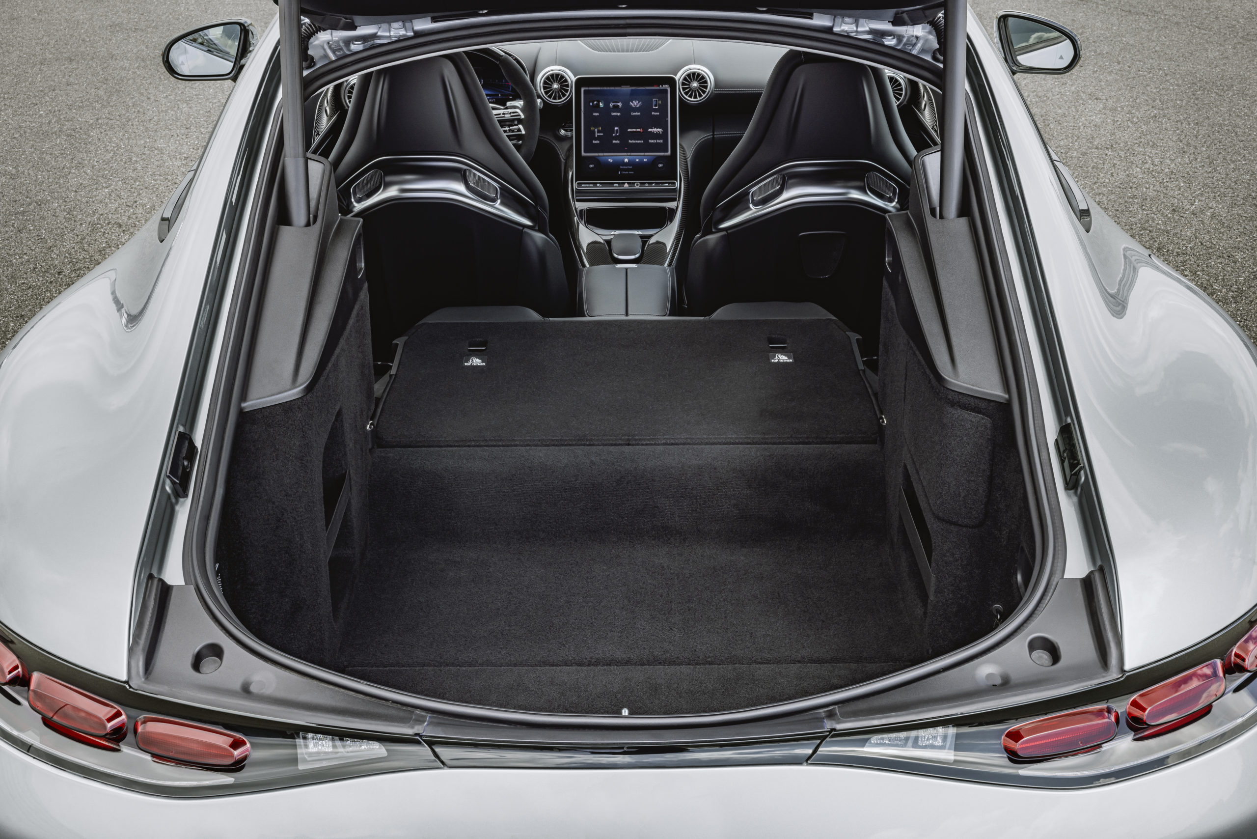 The expanded dimensional concept with optional 2+2 seats offered the designers completely new design options for the exterior. The long wheelbase, short overhangs and steeply raked windscreen make the new AMG GT Coupé appear compact and powerful. The balanced proportions with an exciting greenhouse, voluminous wheel arches and the expressive front view signal the appearance of a powerful sports car that is also suitable for everyday use. The side view is characterised by smoothly modelled surfaces without beads or edges, right down to the recessed door handles. The expressively modelled rear shoulder area gives the vehicle additional sports car appeal. The light-alloy wheels, which are almost flush with the body, emphasise power and dynamics. The active rear spoiler is seamlessly integrated into the large tailgate.