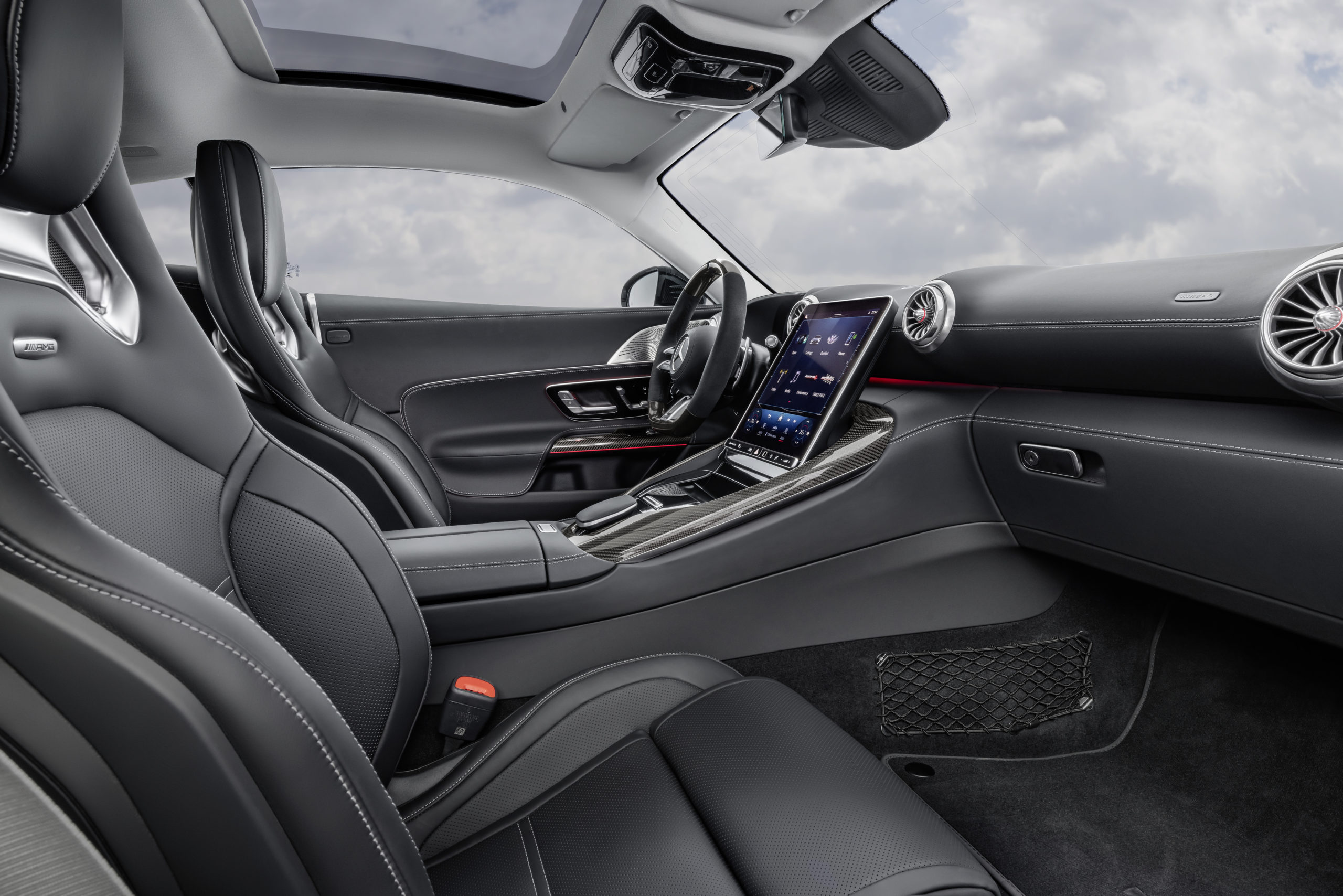 The interior design of the new AMG GT Coupé uses AMG’s high-performance sports car genes, which have been skillfully translated into a digital world and consistently further developed. Materials, workmanship and “attention to detail” underscore the vehicle’s claim to luxury in the interior. The cockpit design, right down to the central display in the centre console, is focused on the driver and impresses with a harmonious overall look. The fully digital instrument cluster is integrated into a three-dimensional visor.