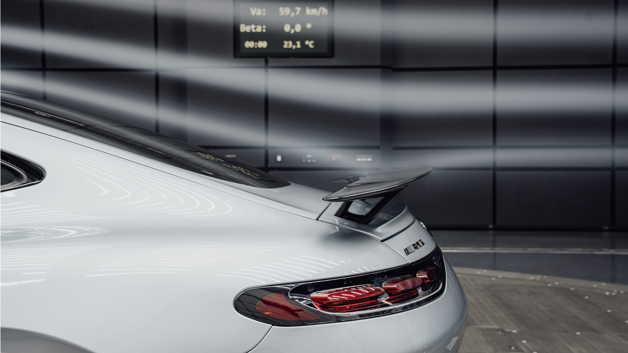 A key development focus of the new AMG GT Coupé was high aero efficiency, specifically: a perfectly balanced relationship between low air resistance and reduced lift. Here, the sporty coupé benefits from the extensive active aerodynamic elements at the front and rear. All flow-optimising elements are seamlessly integrated into the exterior design. The aerodynamics of the AMG GT Coupé meet the complex requirements of driving stability, air resistance, cooling and wind noise. The aero balance makes it possible to defuse critical driving situations, such as sudden evasive manoeuvres at high speed.