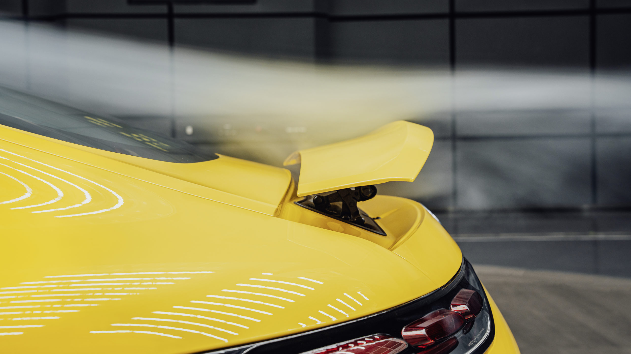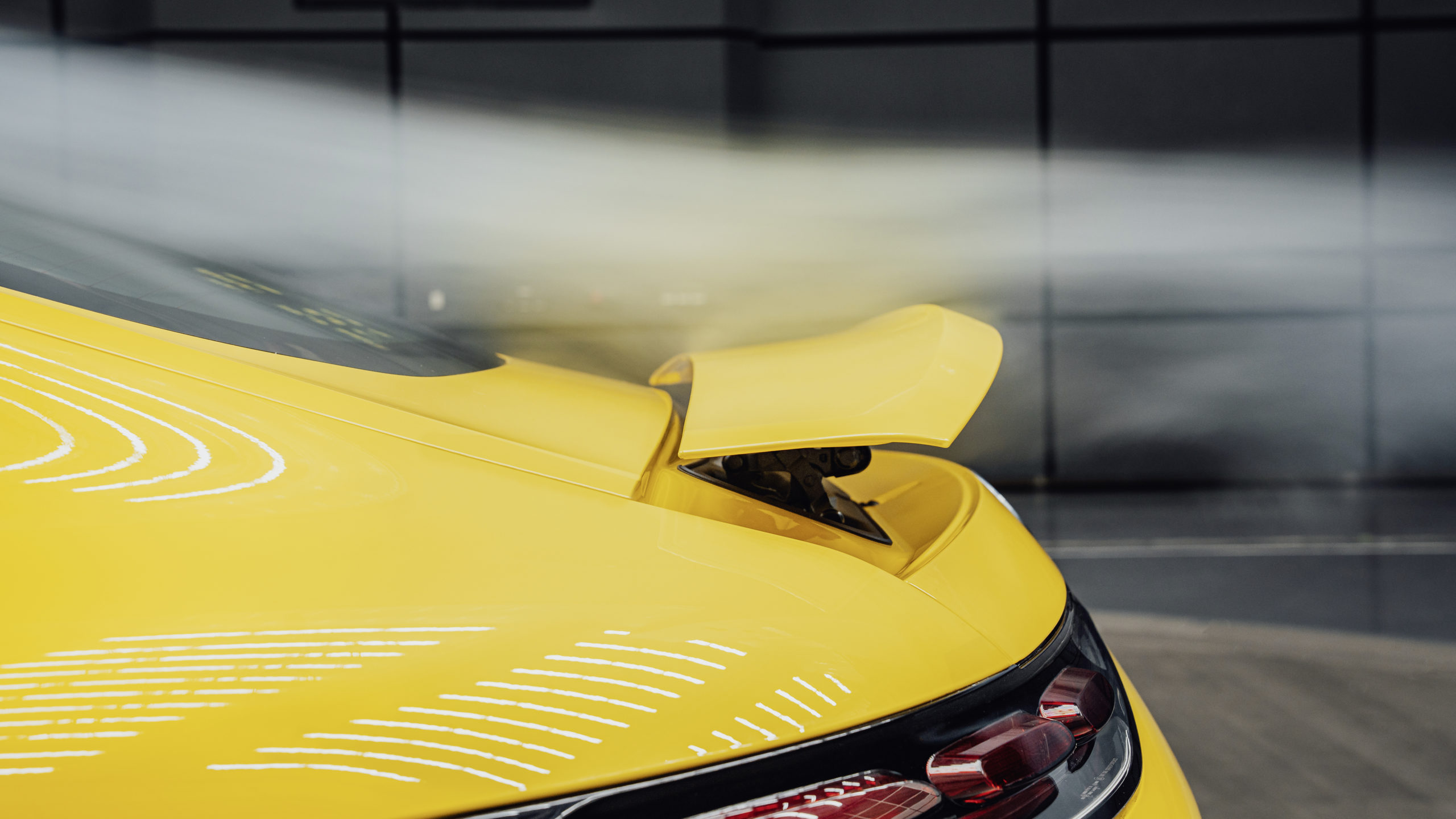 An aerodynamic package is also available as an option. This includes additional flics on the outer air intakes and on the wheel arches. At the rear, the airflow is optimised by side flics on the rear apron, a larger diffuser attachment and a fixed rear wing. All in all, the aerodynamics package reduces lift on the front axle and increases downforce on the rear axle.