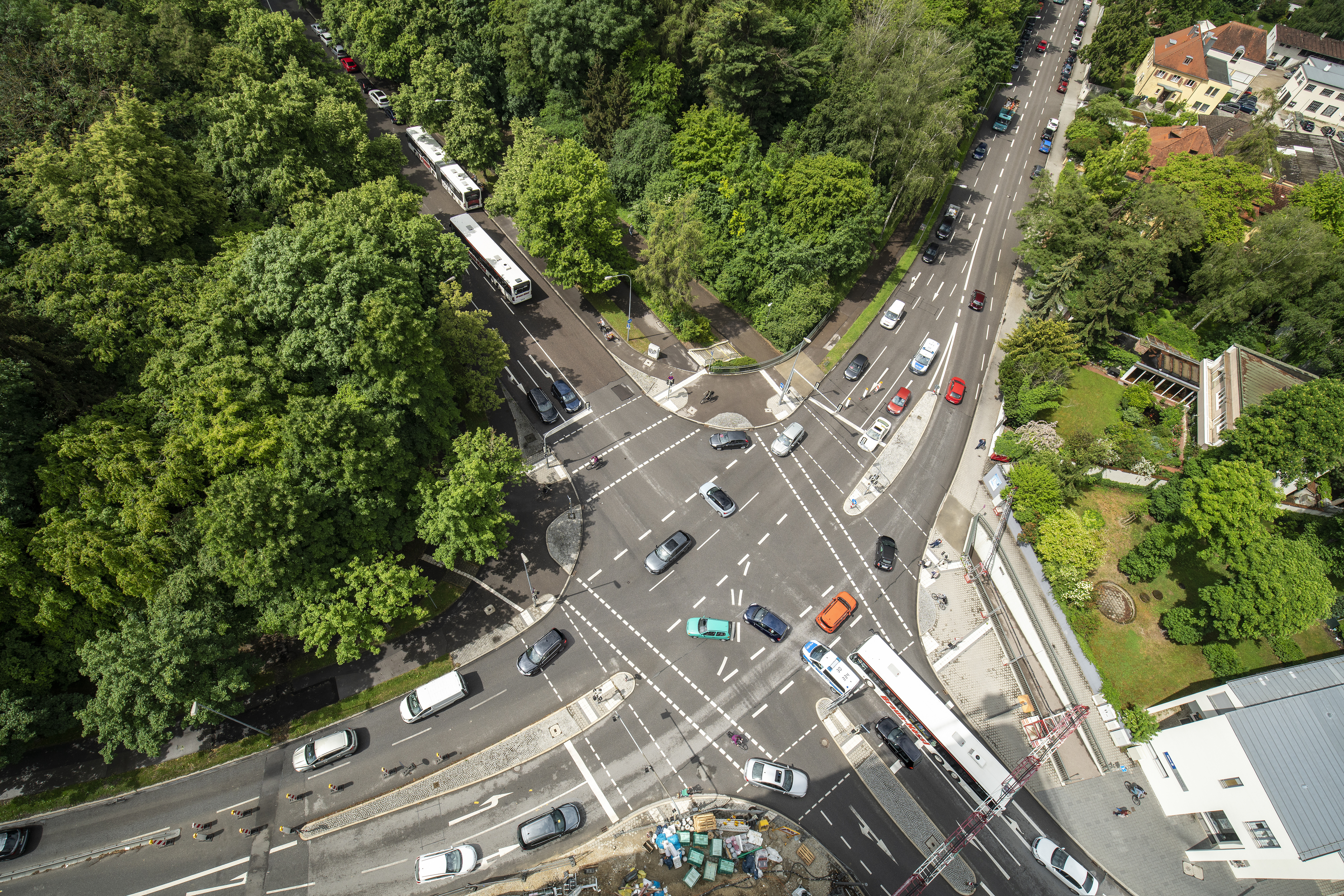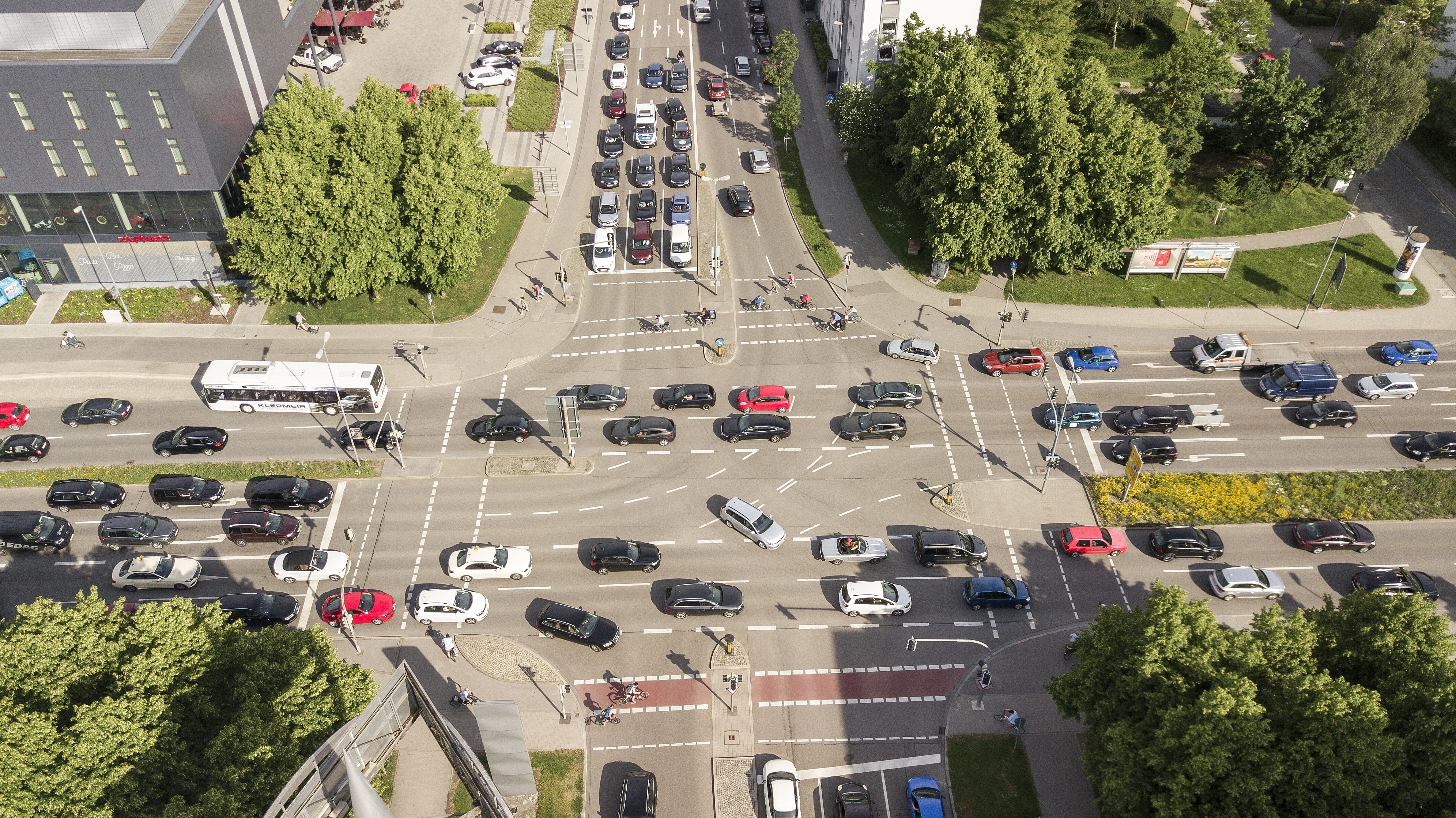 Fleets of self-driving cars will help to solve traffic problems in cities in the long term. These benefits become even more apparent when coupled with smarter traffic management and a higher occupancy rate, i.e. increasing the average number of persons per car. If this figure rises moderately from 1.1 to 1.3 persons, because more people share a car, there is no more congestion during rush hour. In a fully automated, networked traffic system, more people (+12%) can be transported much more quickly (-33%) in commuter traffic (see animation).