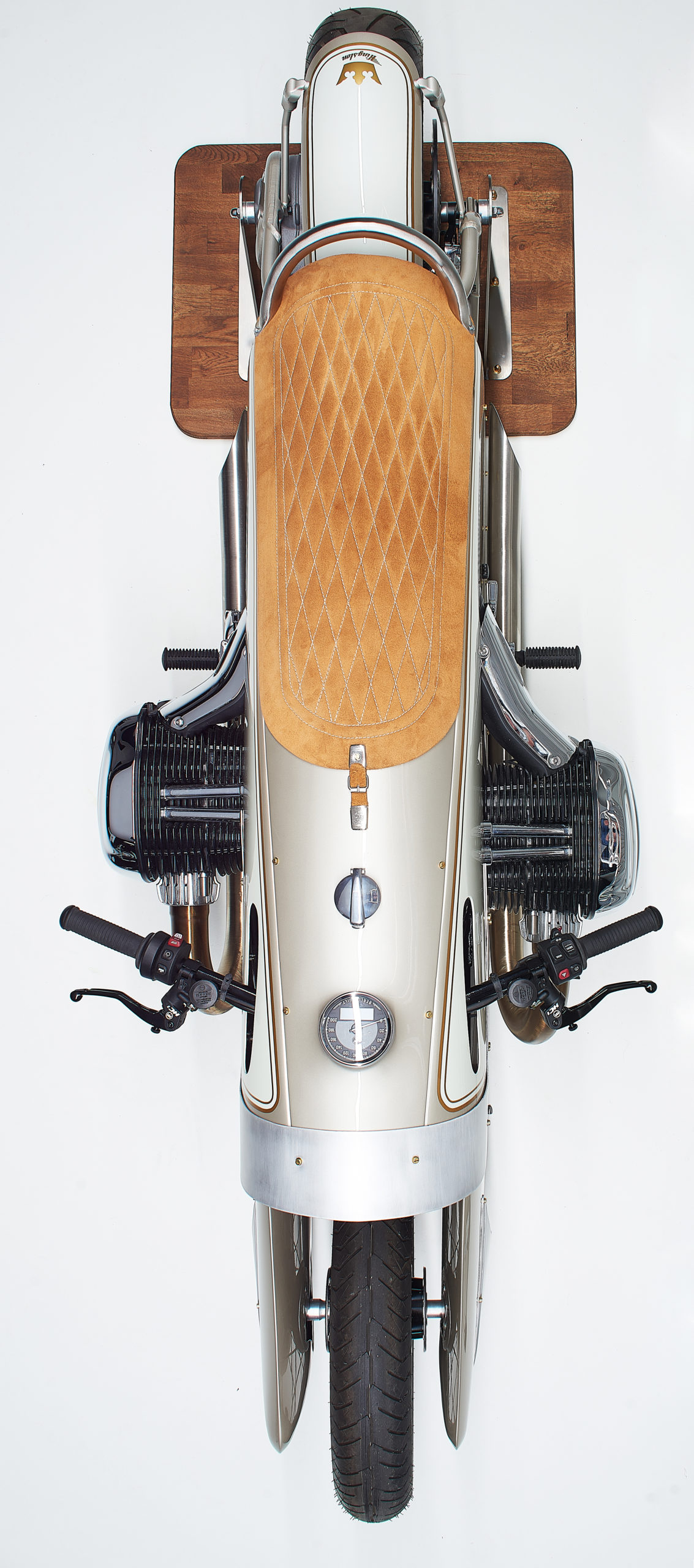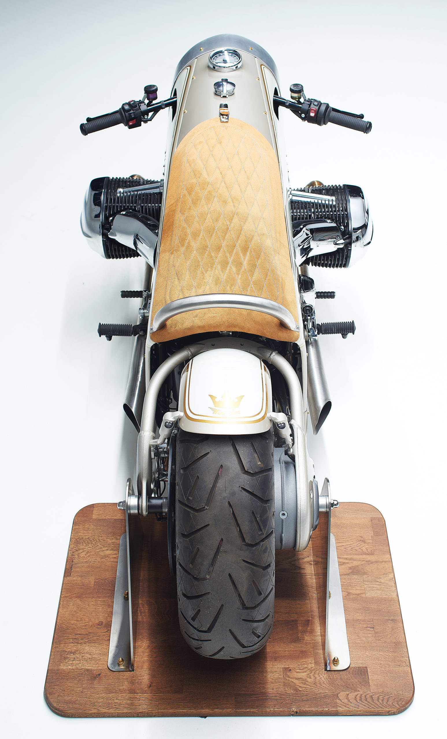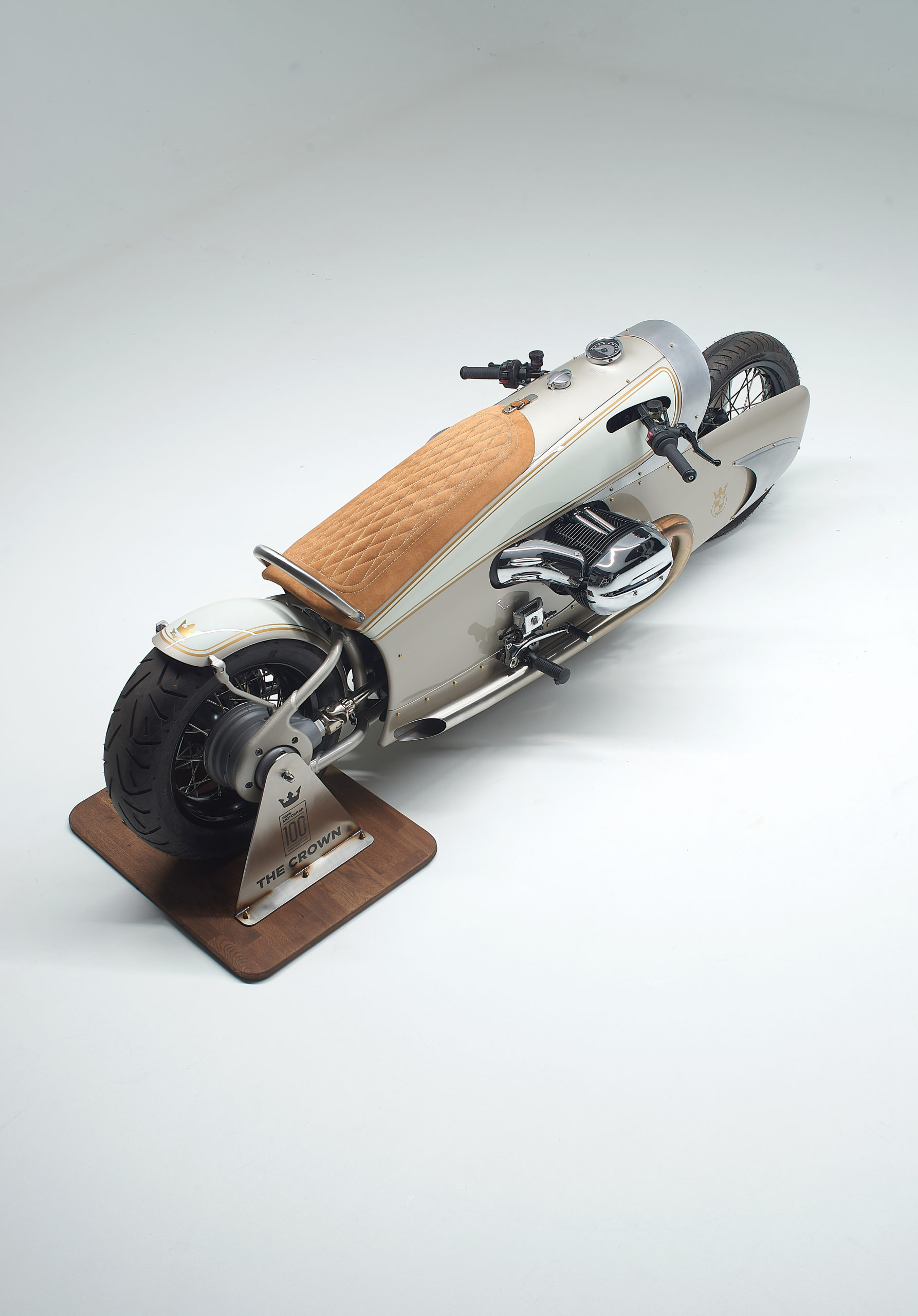 Numerous standard components such as the headlight, instrument, switch units and footrest system have been integrated perfectly into the spectacular concept of the R 18 The Crown. The clutch and handbrake fittings from Magura, the rear mudguard and brackets from Wunderkind and the saddle made from 2 mm thick aluminium sheet metal and covered with genuine leather are all harmonious additions.