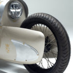 Self-designed body made of aluminium sheet metal and front wheel suspension with double-sided swinging arm with central suspension strut.