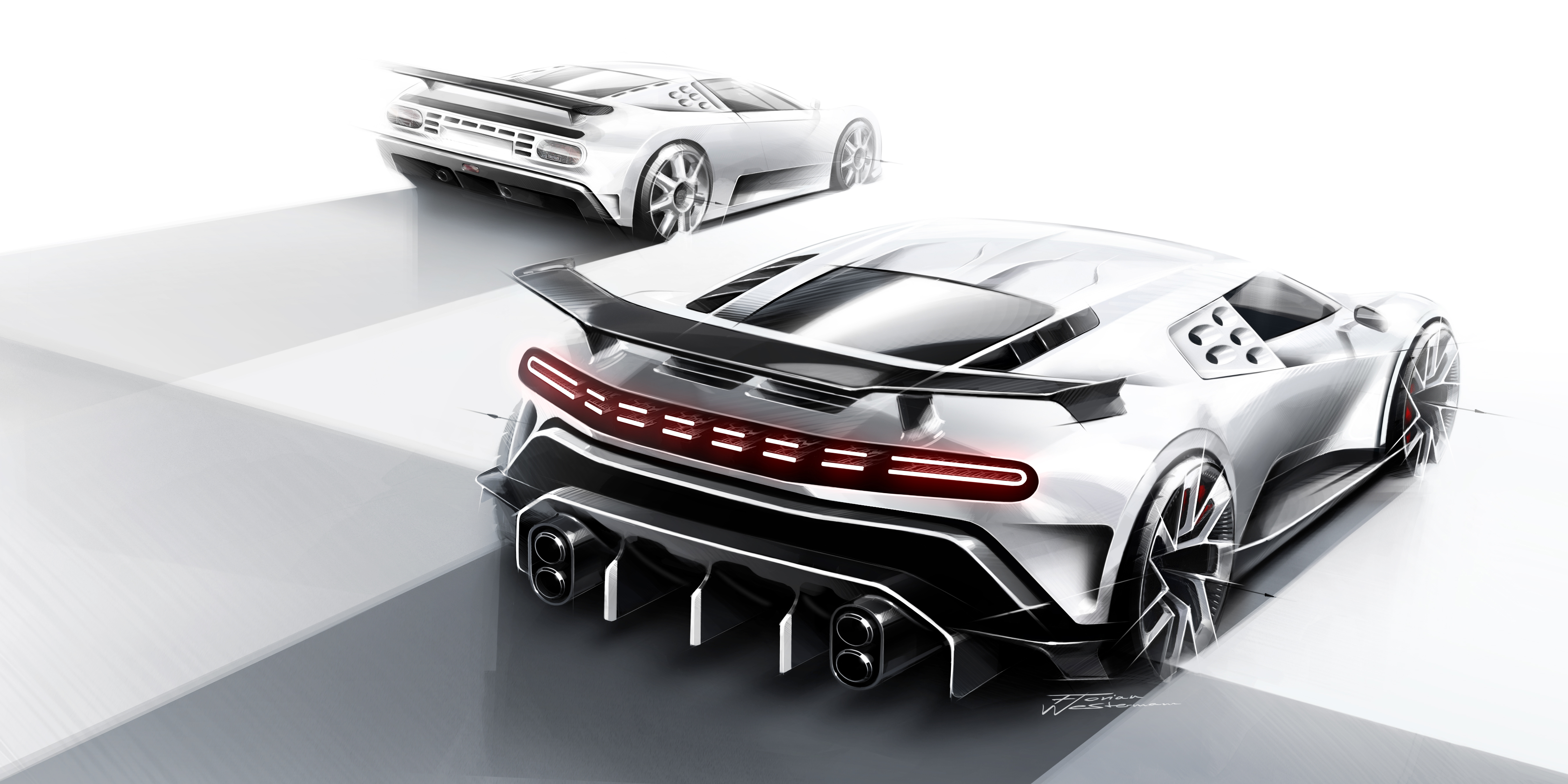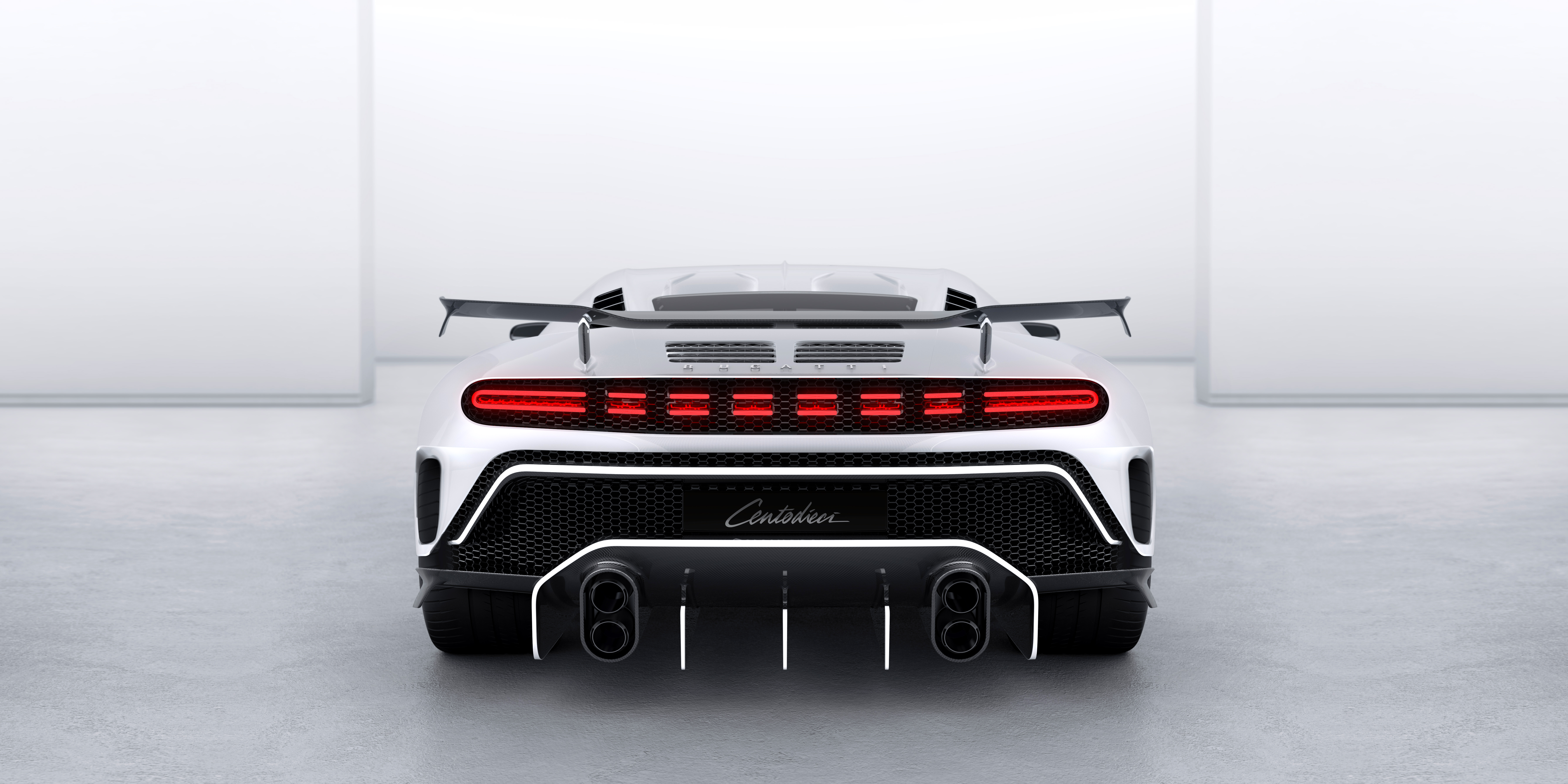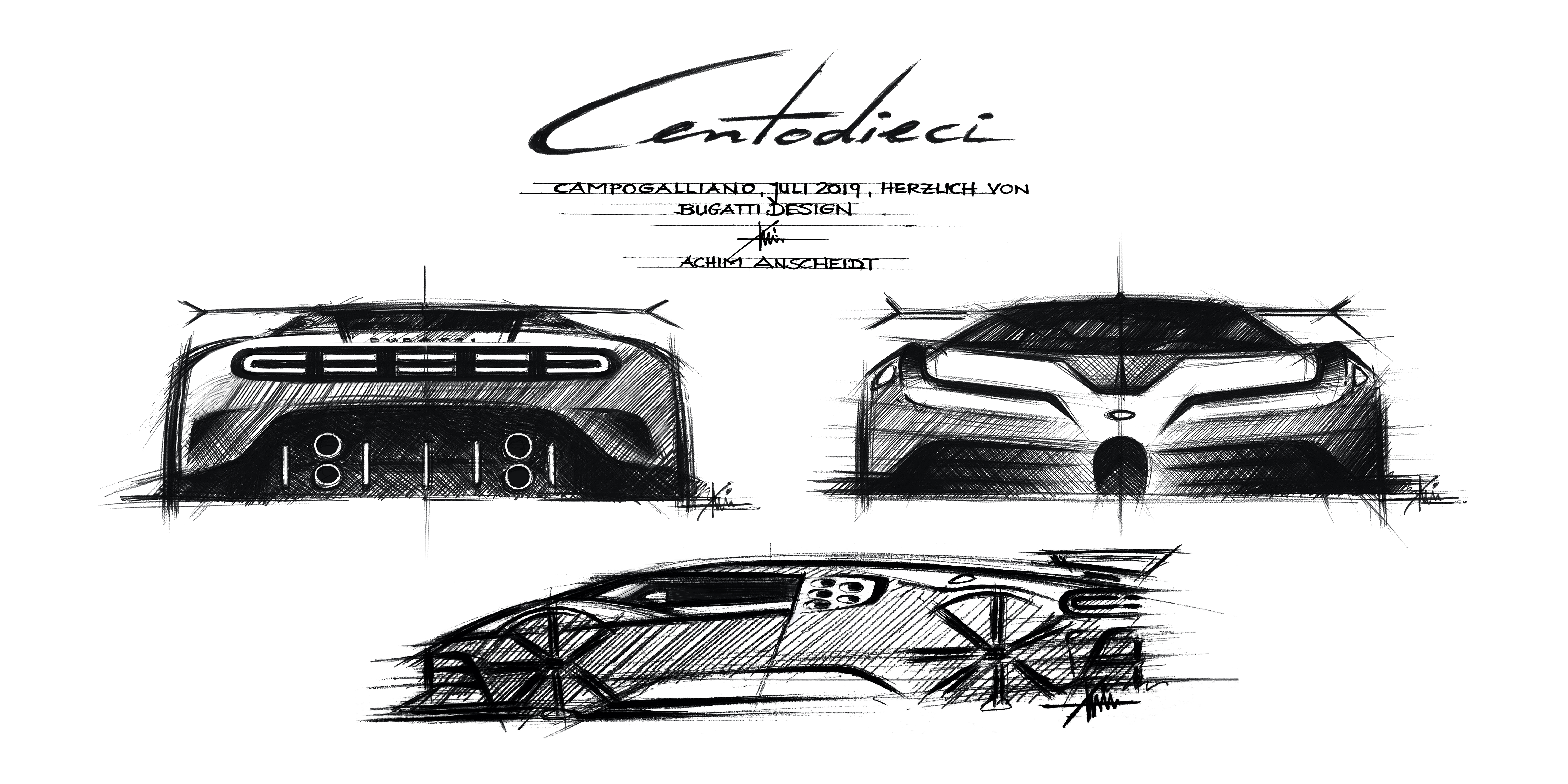 “We faced a number of technical challenges in terms of the development and design of the Centodieci,” says Achim Anscheidt. The EB110 is a very flat, wedge-shaped and graphically quasi two-dimensional super sports car of the late 1980s. “Transporting this classic look into the new millennium without copying it was technically complex, to say the least. We had to create a new way of combining the complex aerothermal requirements of the underlying Chiron technology with a completely different aesthetic appearance.”