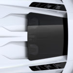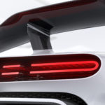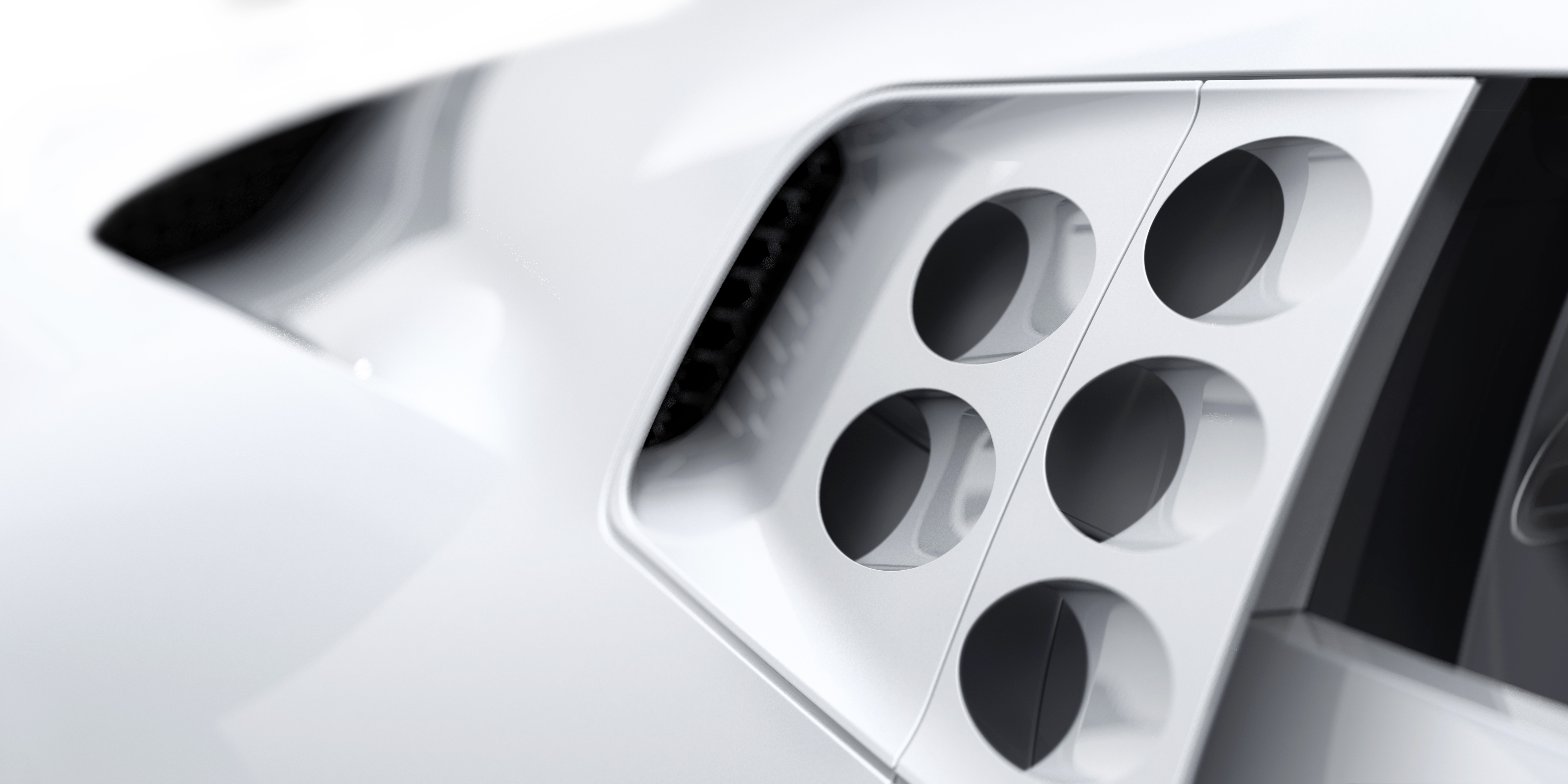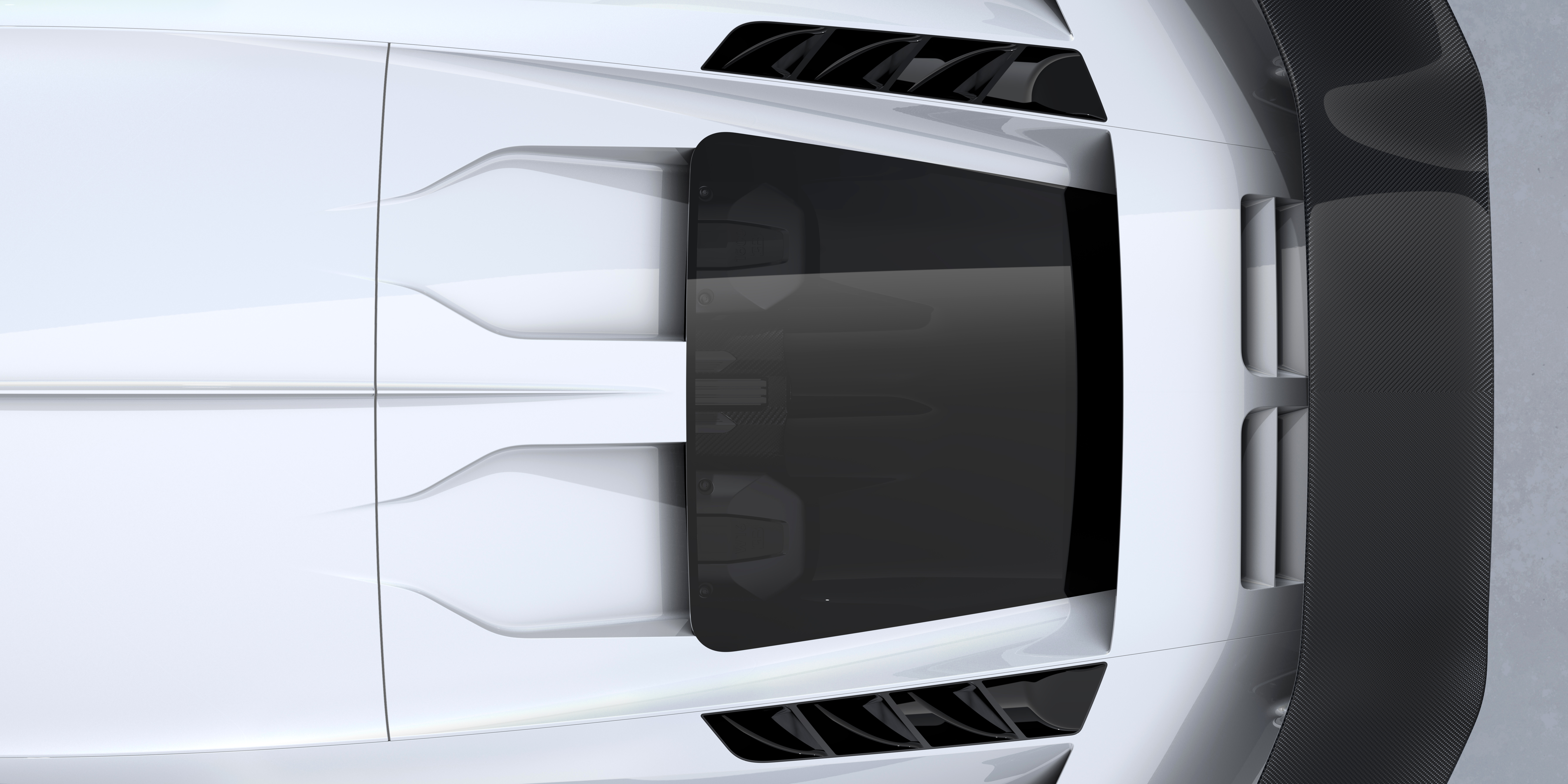 Instead of the graphic two-dimensional rear of the EB110 with its two pill-shaped tail lights, the Centodieci relies on a wide air outlet opening for more efficient engine thermals, bringing to life the flying tail light elements in graphic kinship with the EB110. It took several months to develop solutions to ensure a balanced temperature. As in the EB110, the engine is seen behind a transparent glass surface. The rear is formed into a single ventilation hole, characterised by the eight rear light elements, 2+2 exhaust tailpipes positioned on top of each other in a black matt anodised finish and a performance diffuser to improve downforce. The overhanging rear wing is permanently attached in the style of the original EB110 SS. This increases the downforce. Downforce is supported by the aerodynamic tailgate and a laminar flow-optimised rear window.