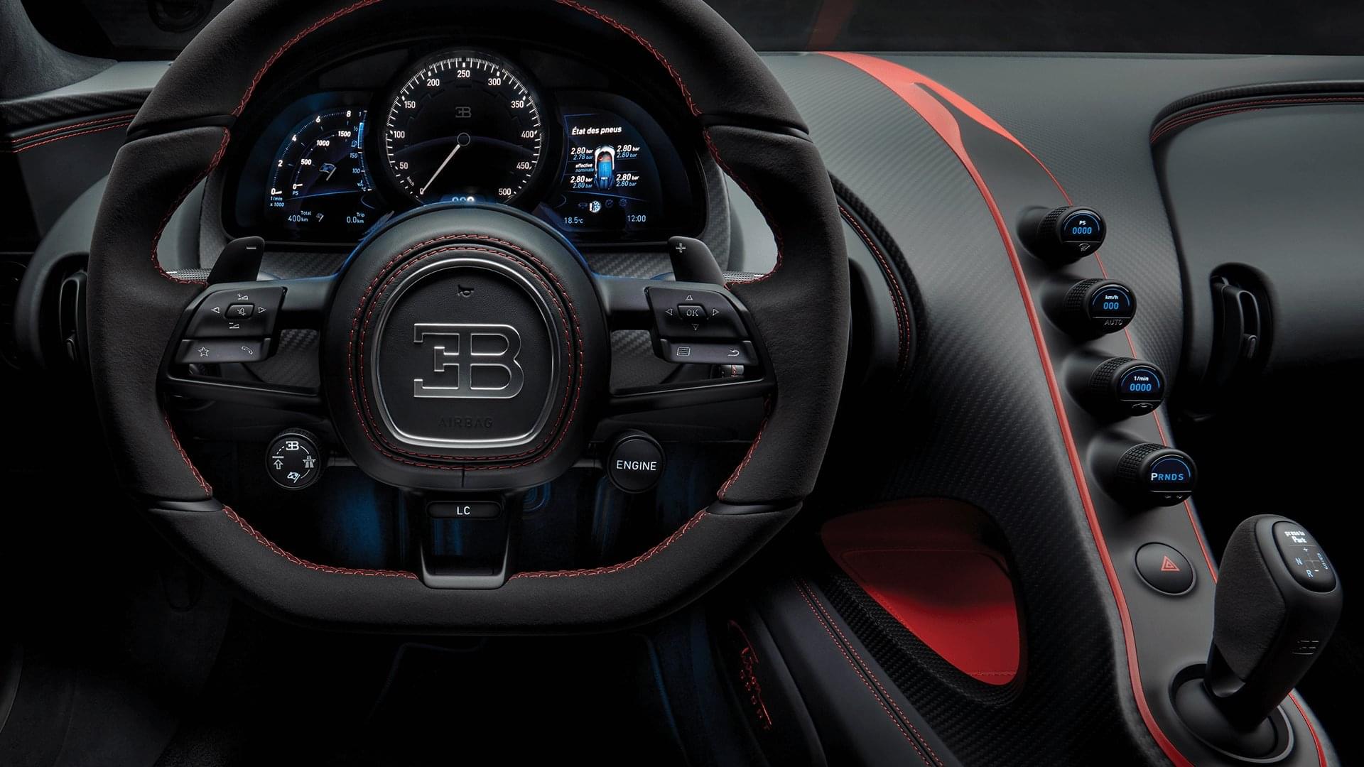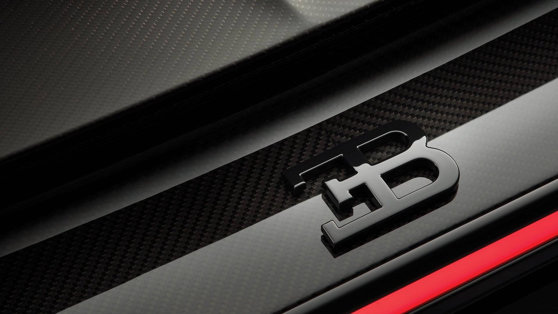Black is the dominant colour of the interior. All the controls of the car have a black anodised finish. The steering wheel and selector lever are covered with suede leather. In addition, Bugatti has used three materials for the styling of the interior: Alcantara for the roof liner including the A-pillar and sun blinds, the rear wall trim, the sill trims, the lower part of the central console, the insides of the seat side cushions and the boot lining. Smooth leather is used for the seats, the inside door trims, the islands on the dashboard including the instrument cluster trim, the airbag container on the steering wheel and the armrest and insert of the central console. Finally, the dashboard itself, the door trims, the rears of the backrests and the steering column housing are made from exposed carbon fibre.