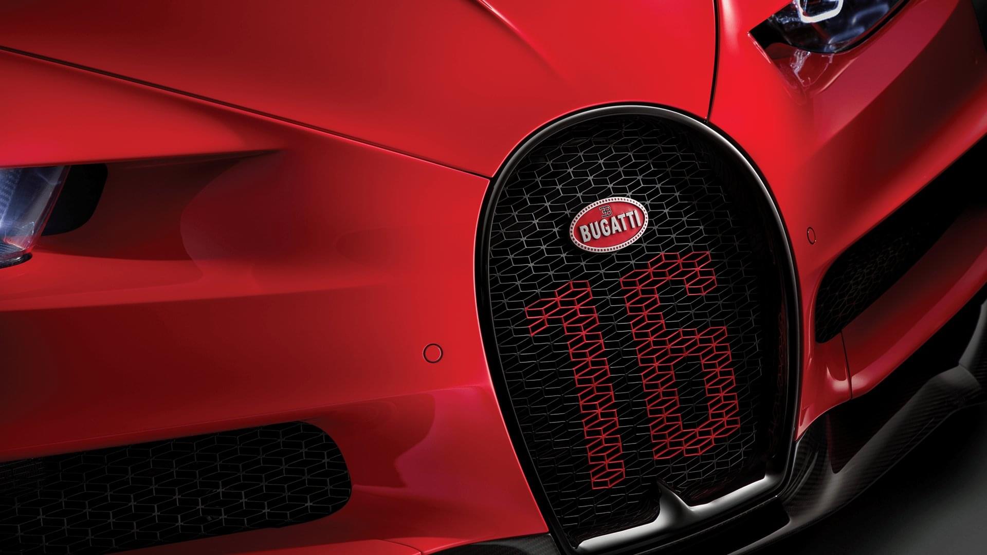 A red “16” is positioned prominently on the black-painted grid of the radiator grille – referring to the number of cylinders which gives the Chiron engine its unique position.