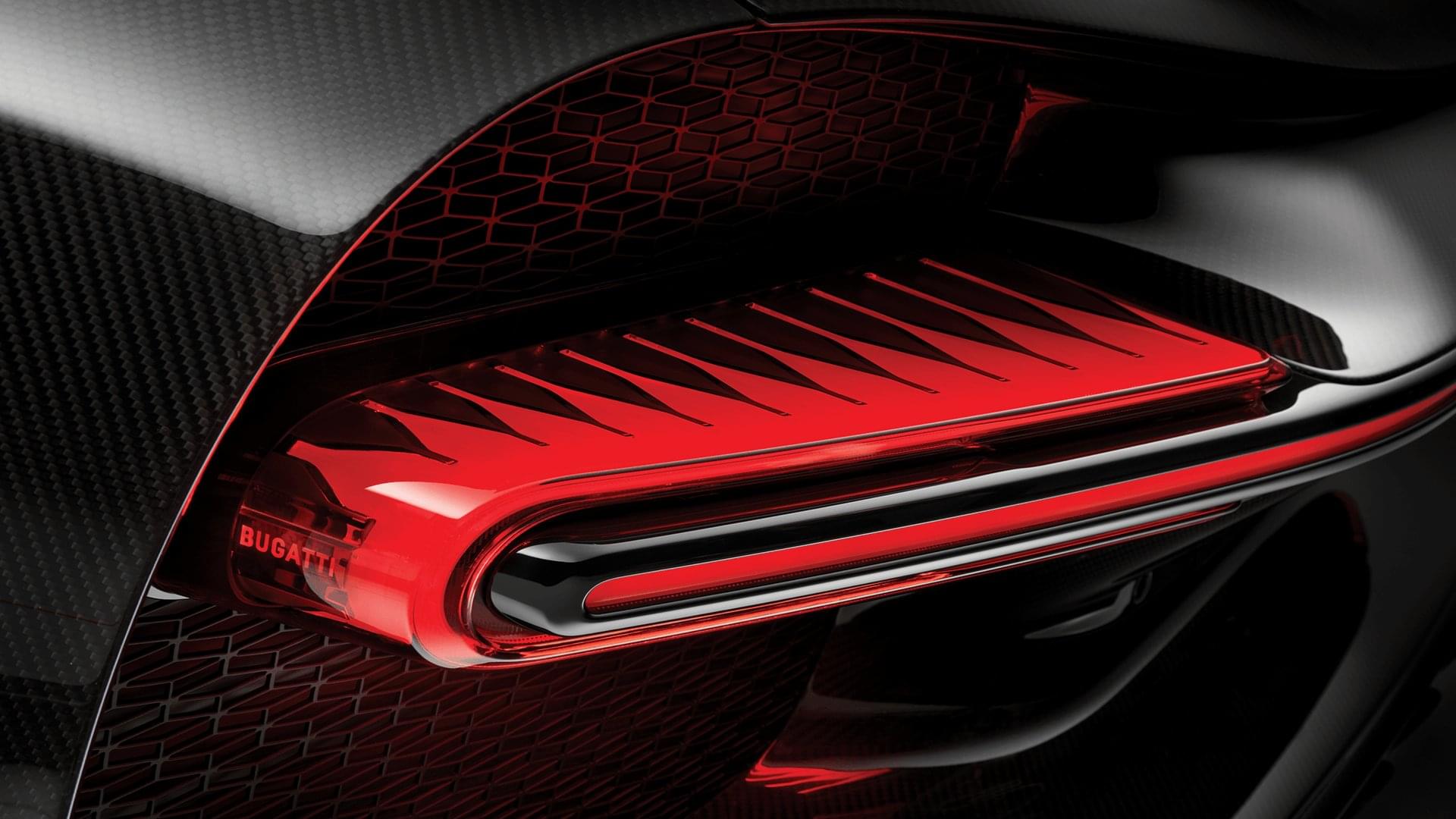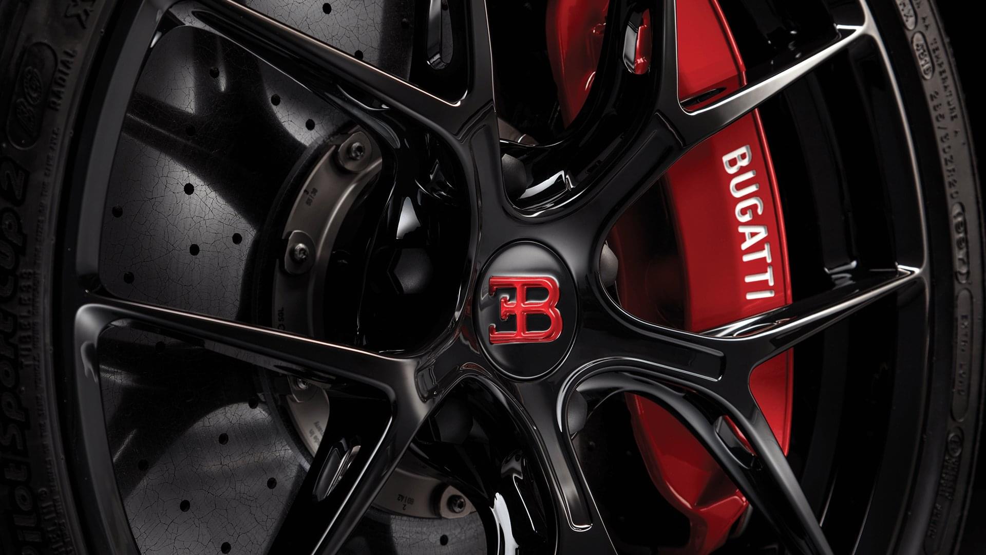 The distinctive Bugatti side line, a C-shaped trim strip made from aluminium alloy, is painted in the B-colour, in this case “Italian Red”. This red tone is also to be found on the brake calipers, the EB logo on the hubcaps, the underside of the rear spoiler and in the labelling on the intercooler cover. Here, it creates an exciting contrast with the “Gun Powder” grey of the carbon fibre intercooler cover and the same tone which is used for paintwork on the wheel rims, the aluminium bezel of the Chiron’s iconic rear lights, the EB logo on the rear and the famous Bugatti horseshoe on the radiator grille.