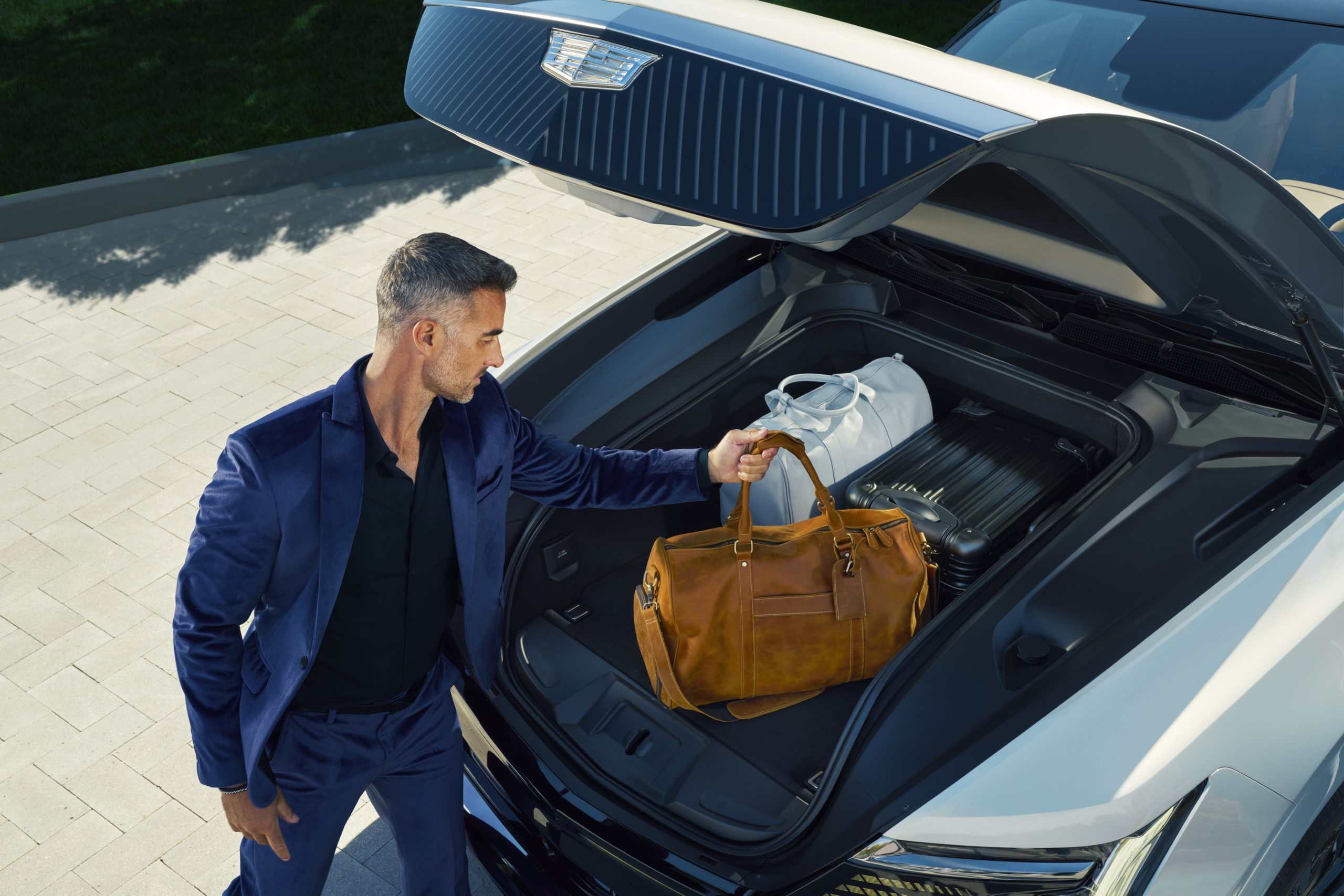 | ‘eTRUNK’ ADDS TO ESCALADE IQ SPACIOUSNESS Among the many benefits of the ESCALADE IQ’s EV architecture is the large front storage compartment enabled by the lack of a combustion propulsion system. It offers a generous 12 cubic feet of cargo room18 with space to fit two golf bags, and additional features to increase convenience and space optimization like the available storage tray. Its size and versatility were optimized by the design team, including incorporating the grille shield in the hood rather than on the front fascia, for a lower liftover threshold that makes it easier to load items. |