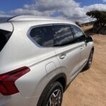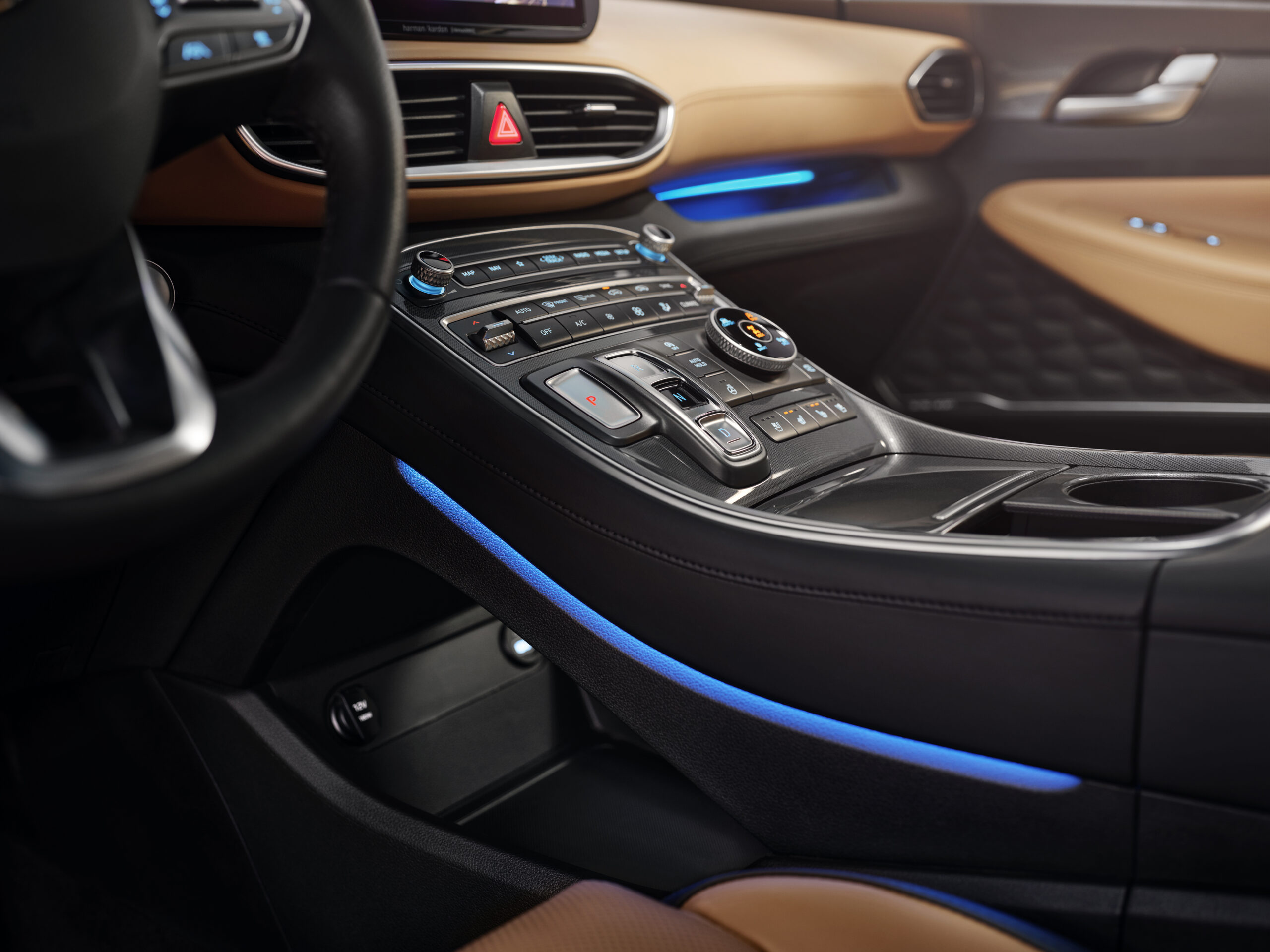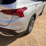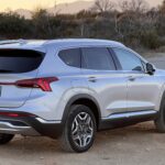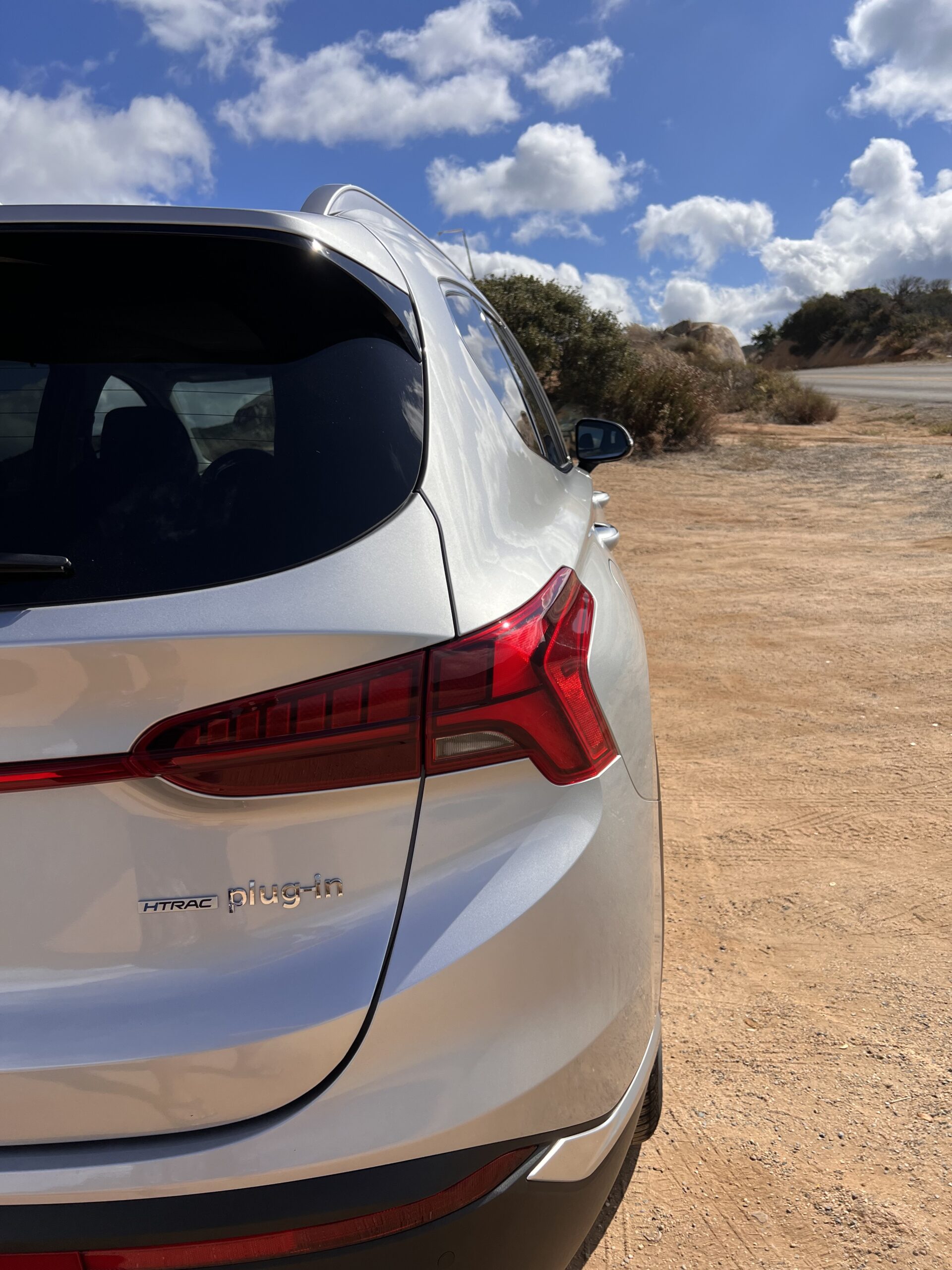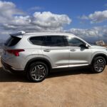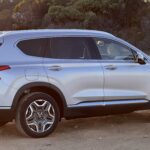 Along the sides, the Santa Fe Plug-in Hybrid’s muscular stance is evident in its wide stance and pronounced wheel arches. The roofline is slightly tapered towards the rear, giving the vehicle a dynamic appearance. The rear end features slim LED taillights that stretch across the width of the vehicle, giving it a modern look.