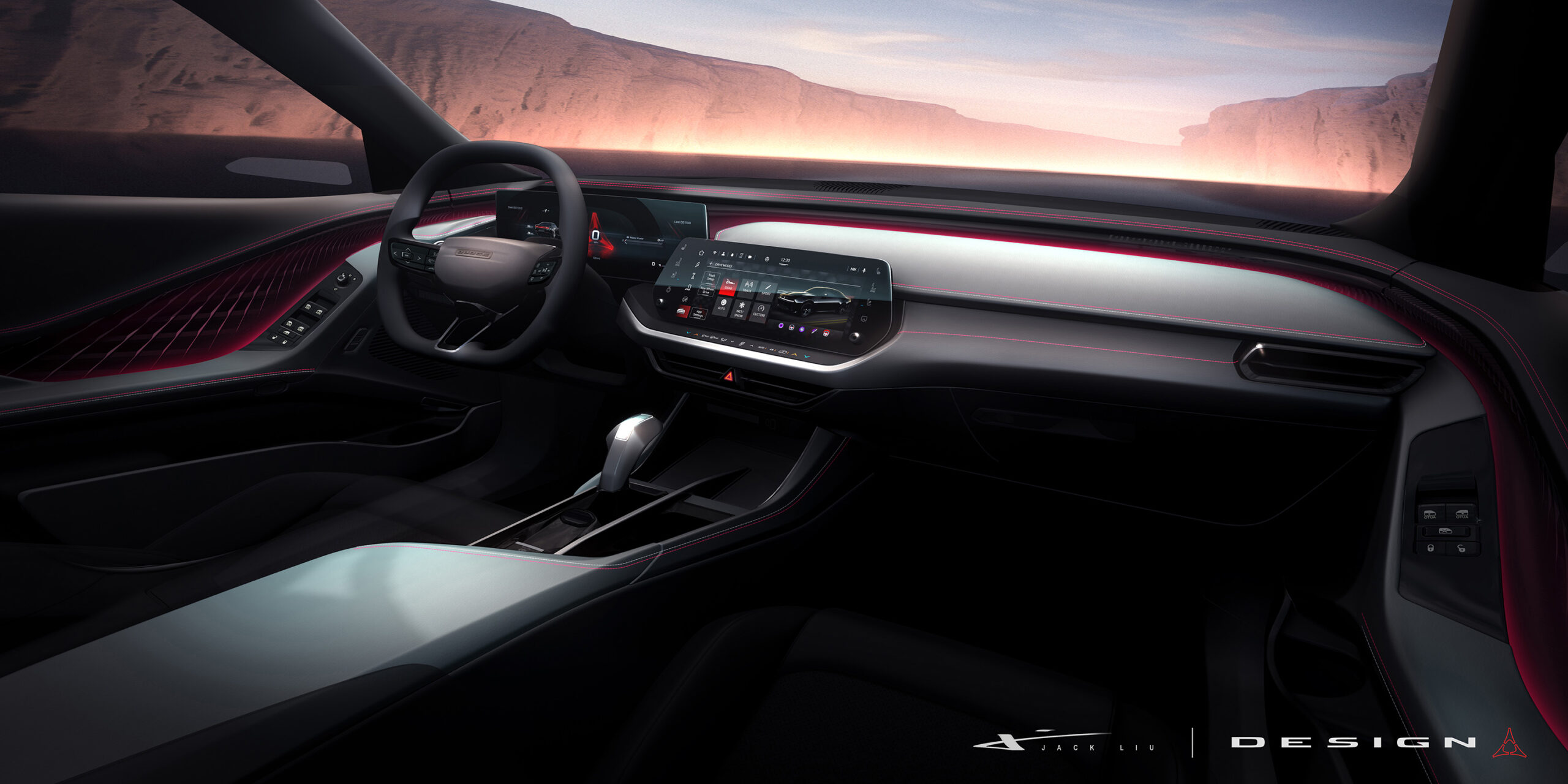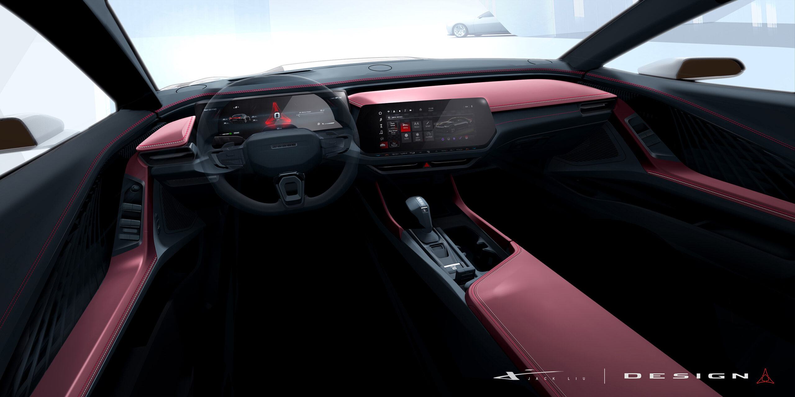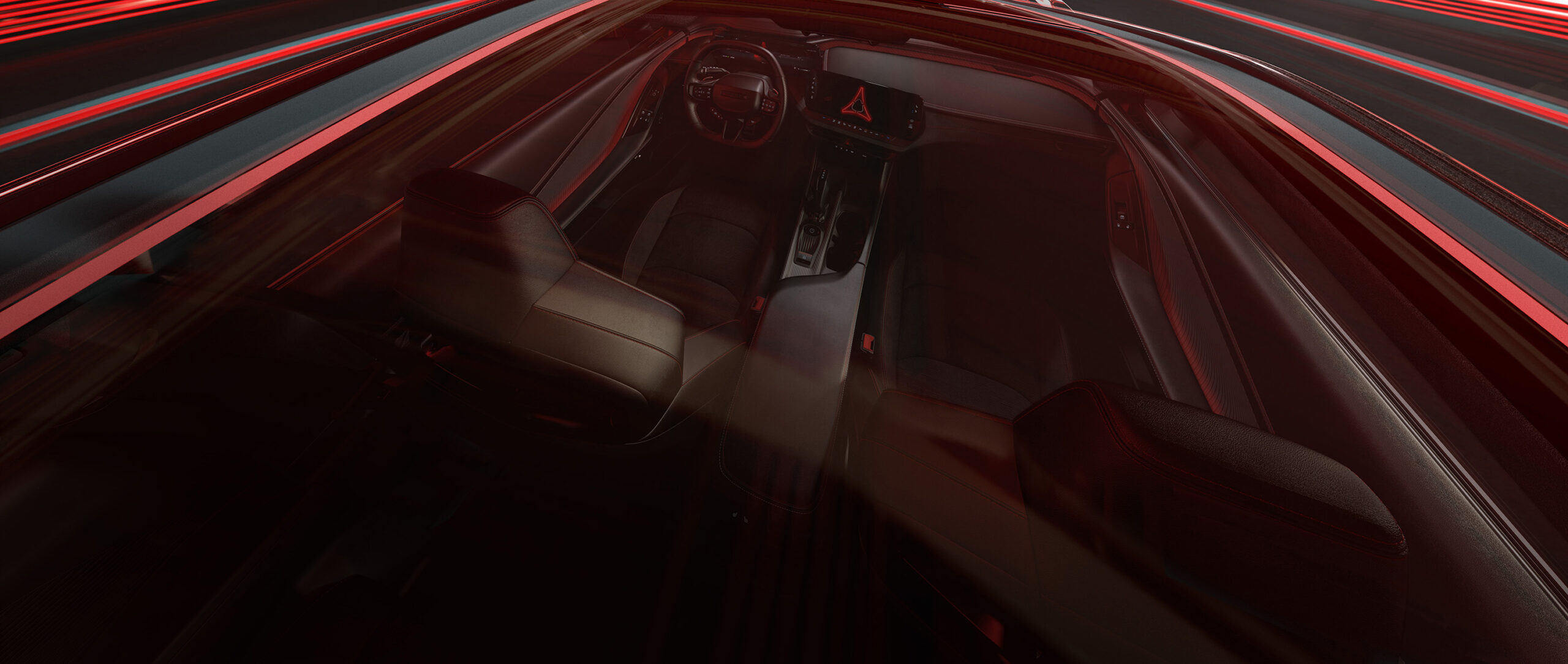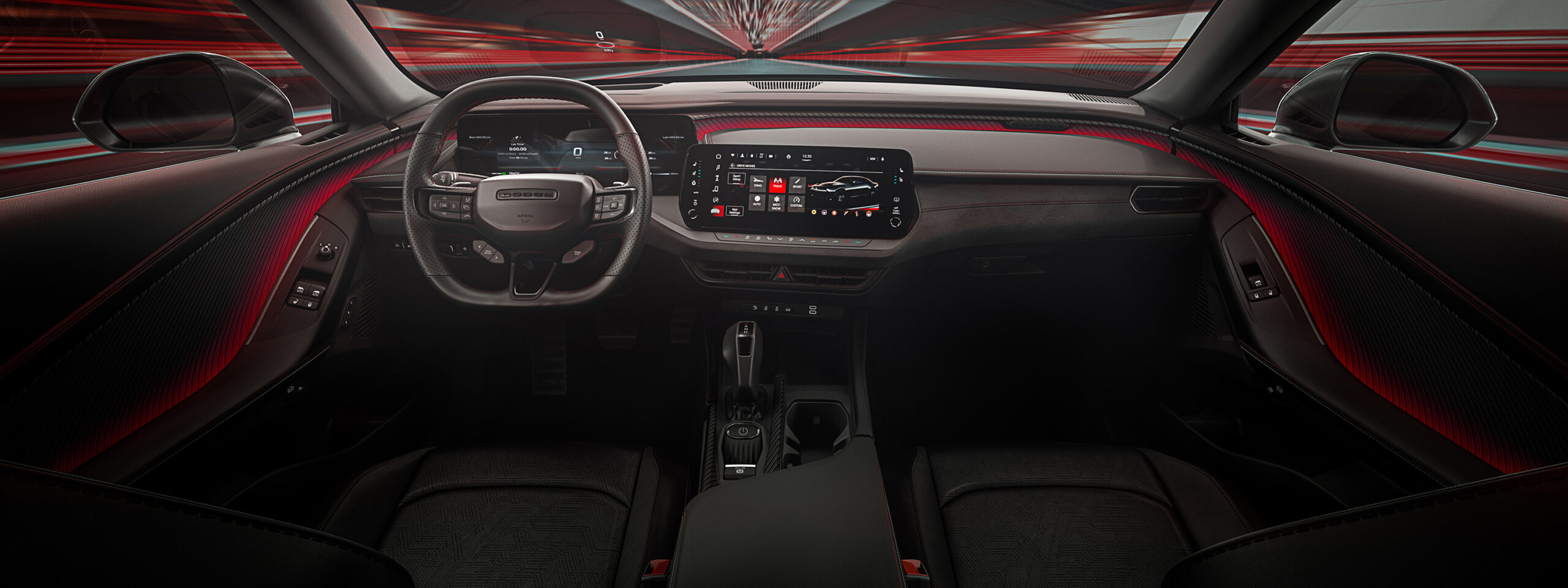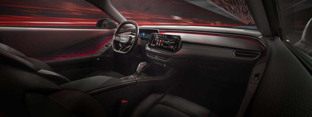 The vehicle’s dynamic, layered instrument panel and console theme are home to free-standing, wide-format 10.25-inch or available 16-inch cluster screens, with a 12.3-inch center display positioned in an angled center stack that provides a unique, sculpted interior with a modern technical feel. Linework and texture are evocative of the iconic 1968 Dodge Charger instrument panel, reproportioned in volumes that feel lighter and support the ideology of a thoroughly modern performance vehicle that only Dodge could build.