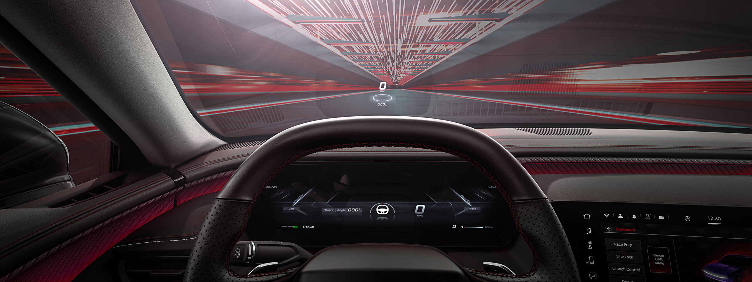 A one-of-a-kind One-button Press Experience allows the driver to instantly switch the vehicle’s personality. A simple push of a steering-wheel button will change the vehicle’s dynamics while the driver information in the cluster and HUD will also change to correspond with the chosen Drive Mode.