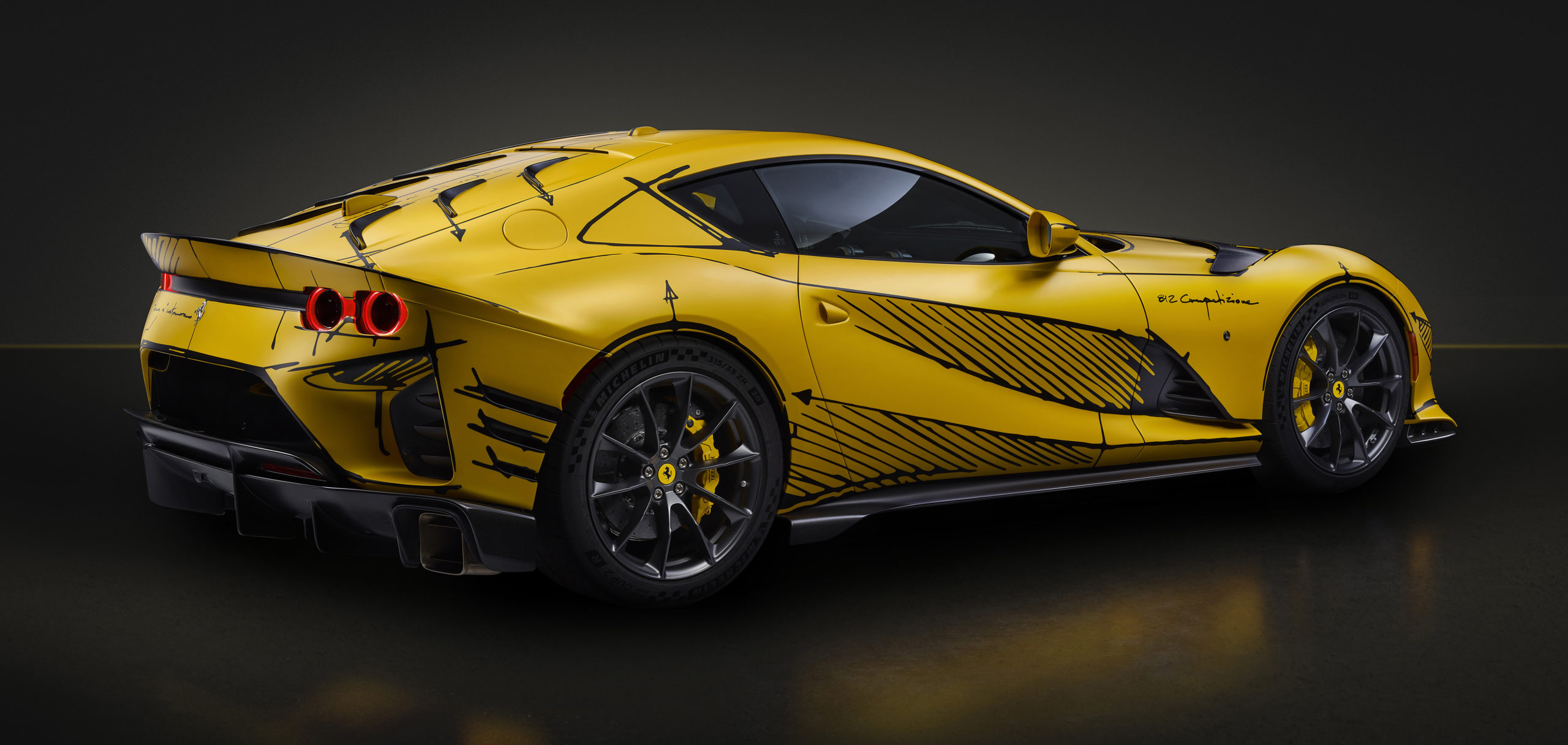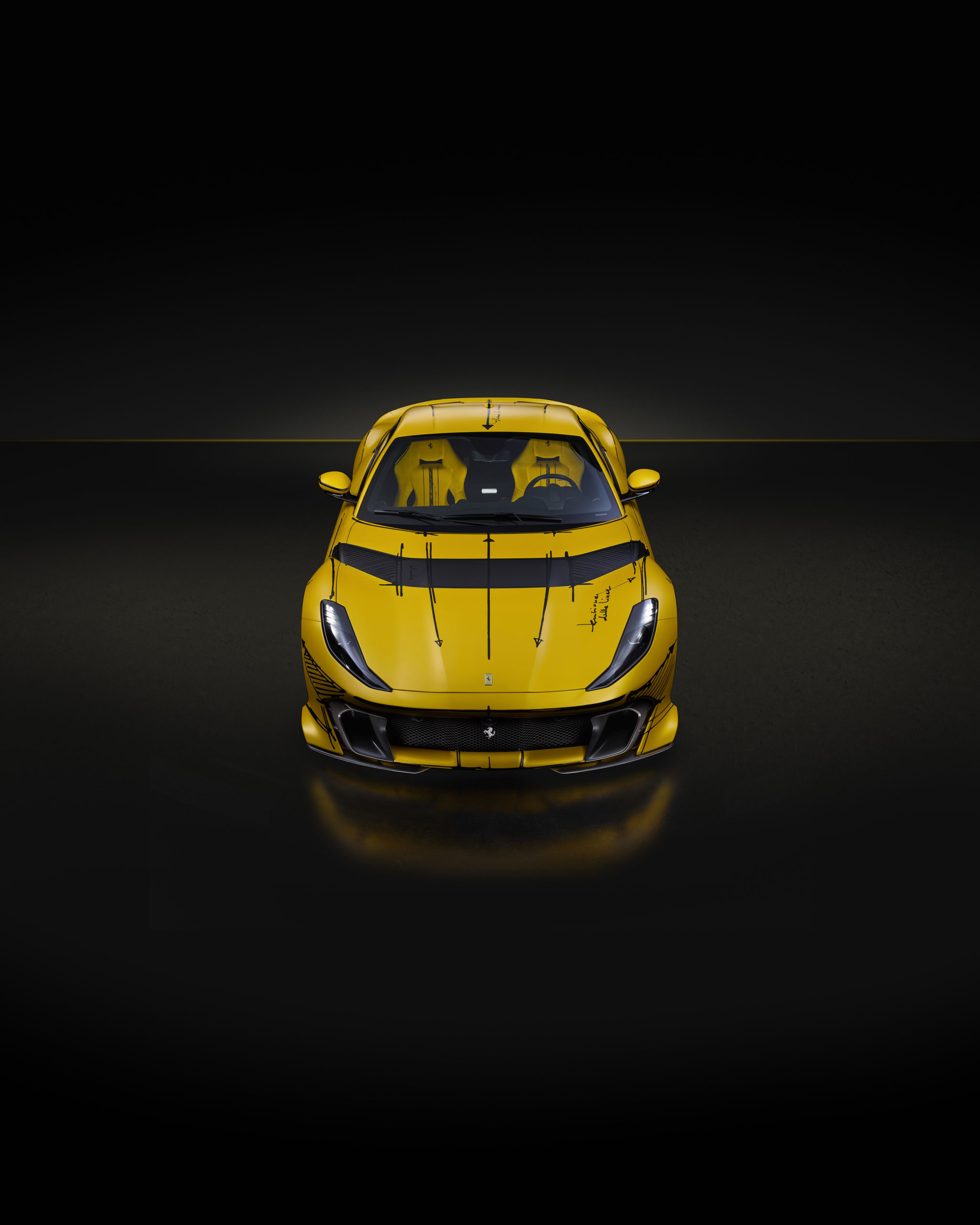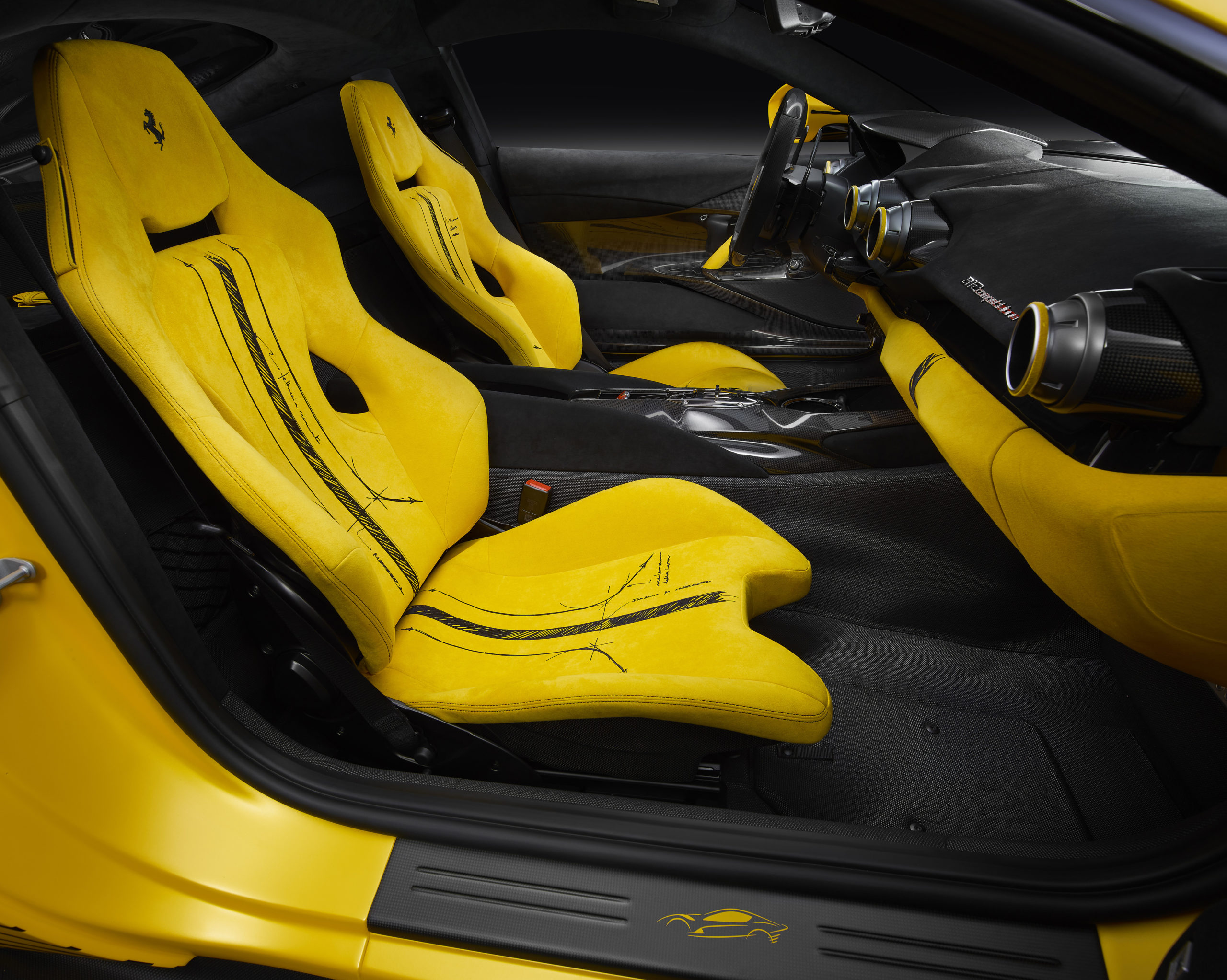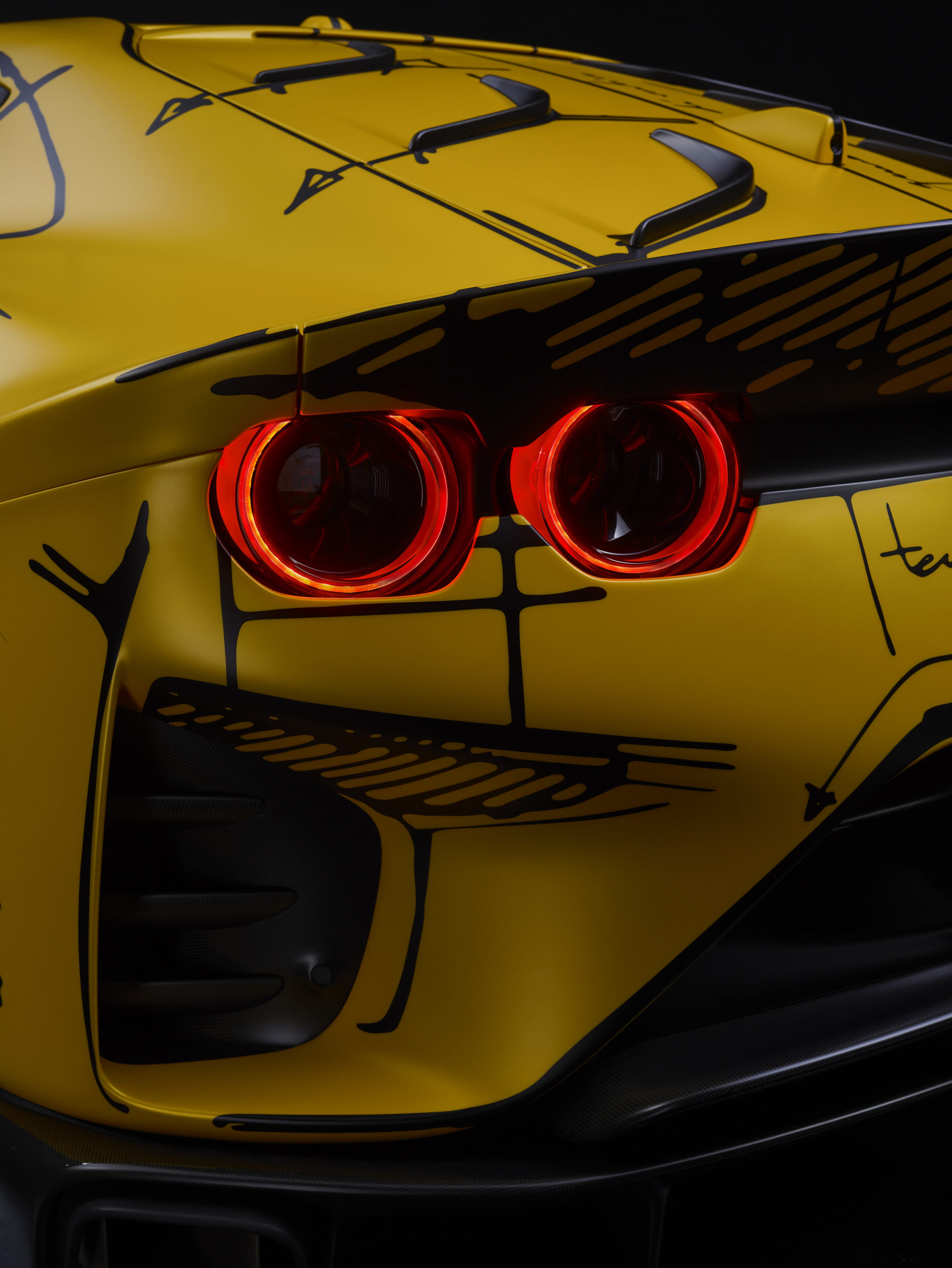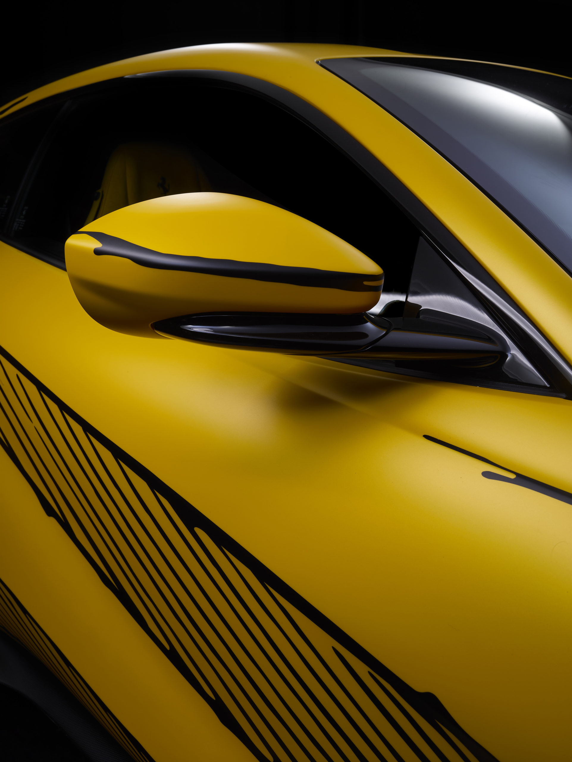 On the car, in matte Giallo Tristrato, the lines composed by the designer who imagined the elegant and sporty forms of the 812 Competizione and its most iconic details have been traced in matte Nero DS Sketch. Notable among them are the carbon fibre blade that cuts across the horizontal plane of the front bonnet acting as an air intake for the engine, the characteristic louvres on the side – a tribute to the best twelve-cylinder Ferrari tradition – as well as the vortex generators on the rear screen devoid of glass, replaced by a concealed rear-view camera.