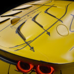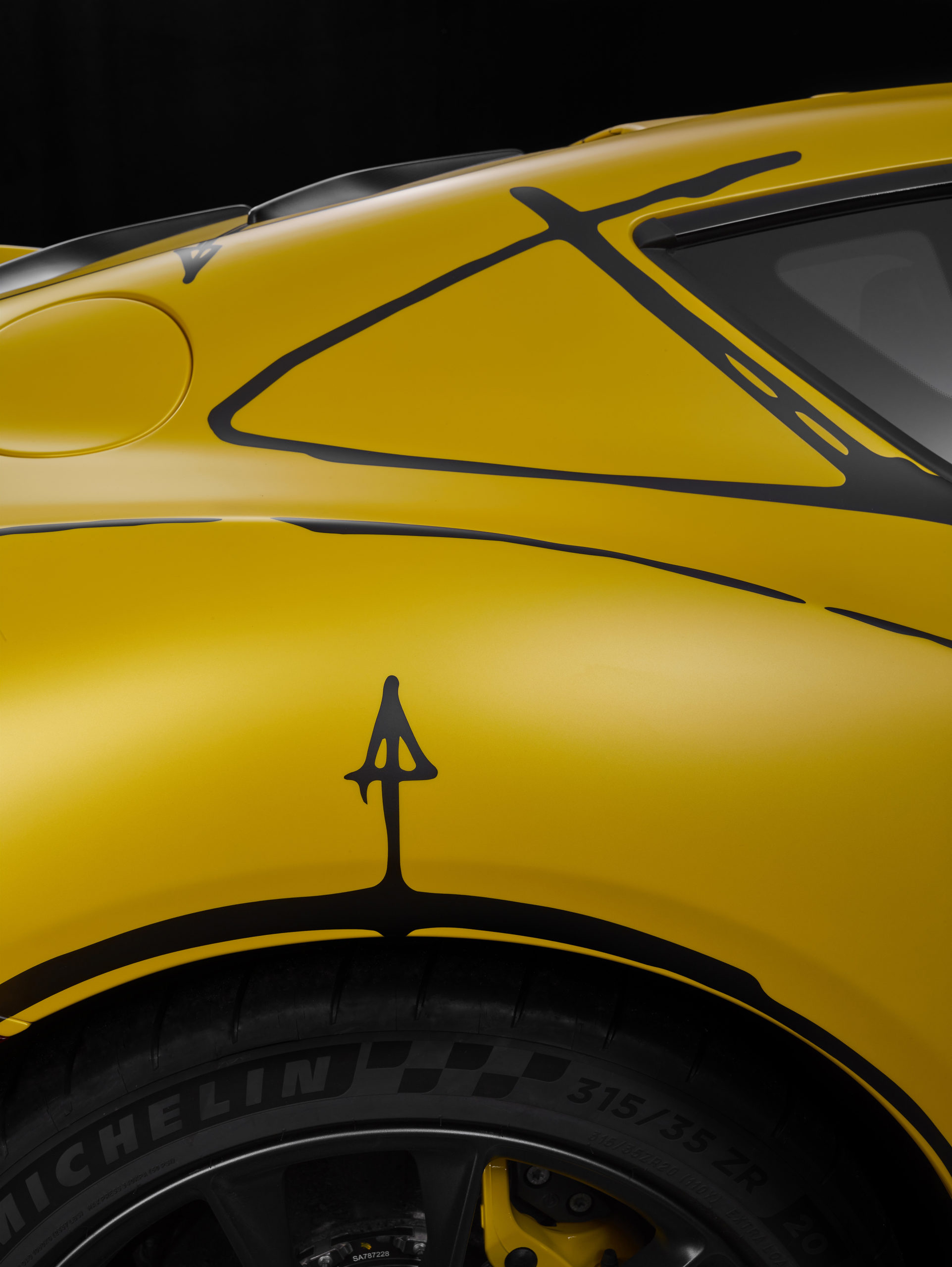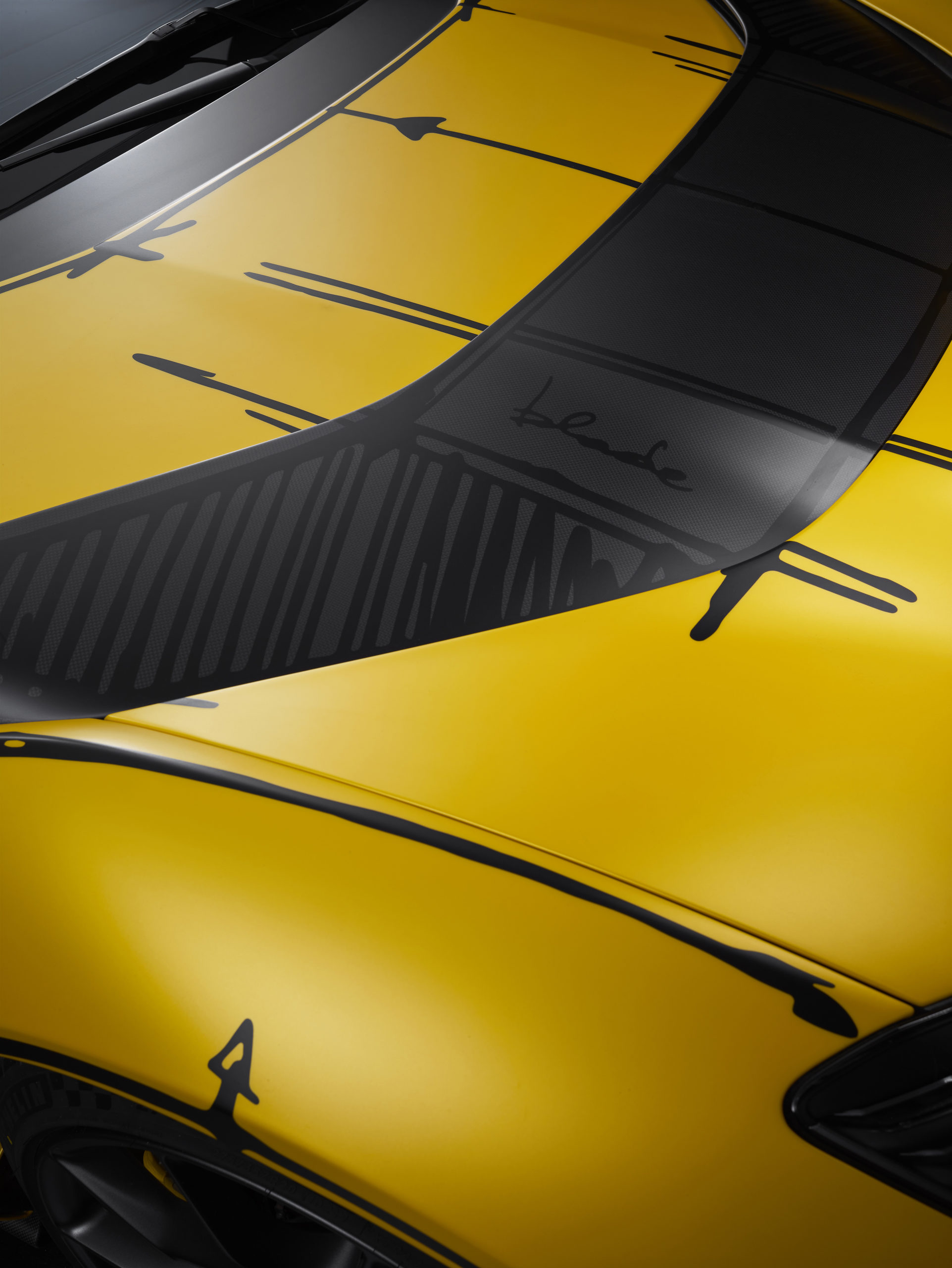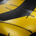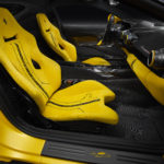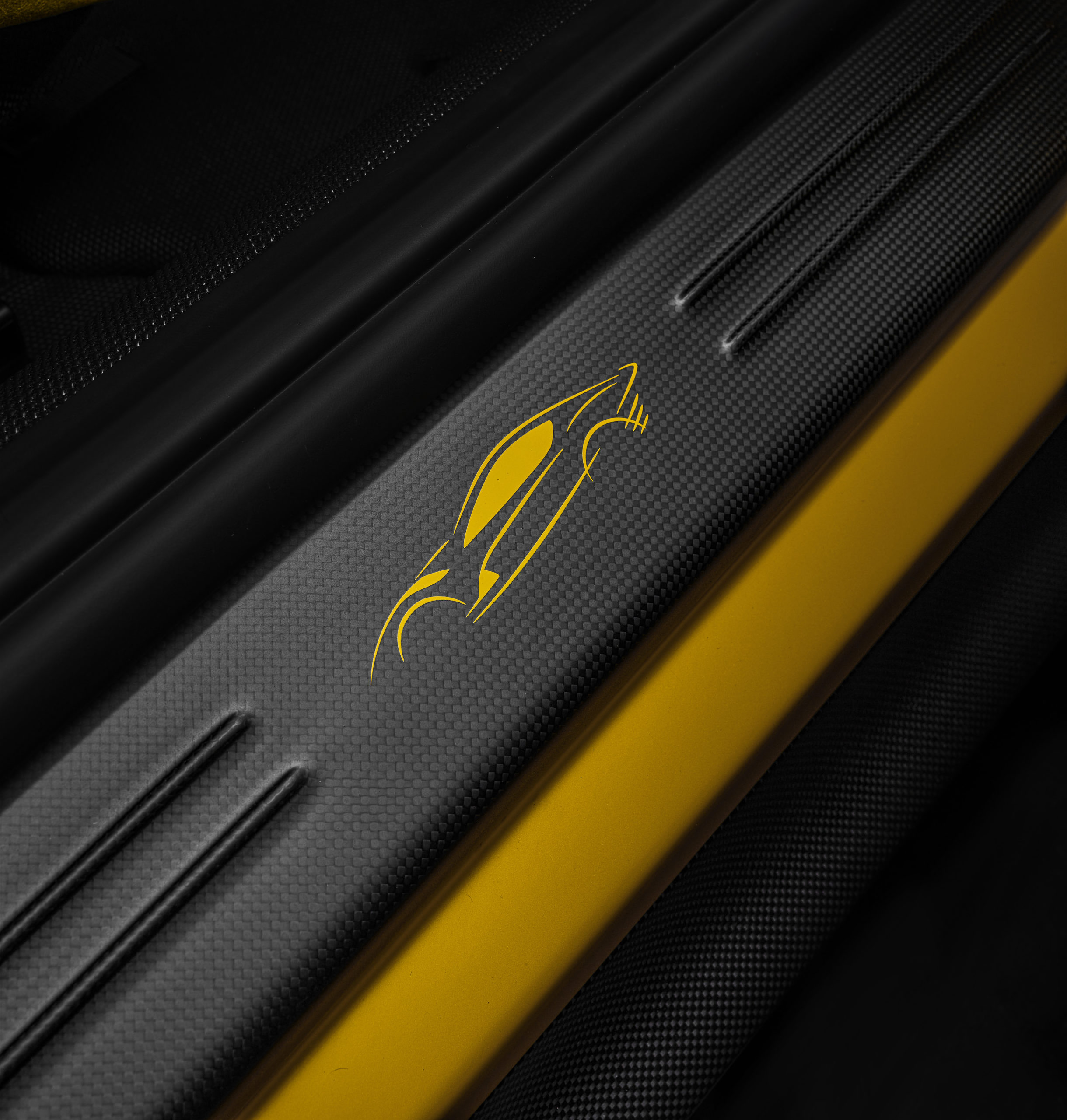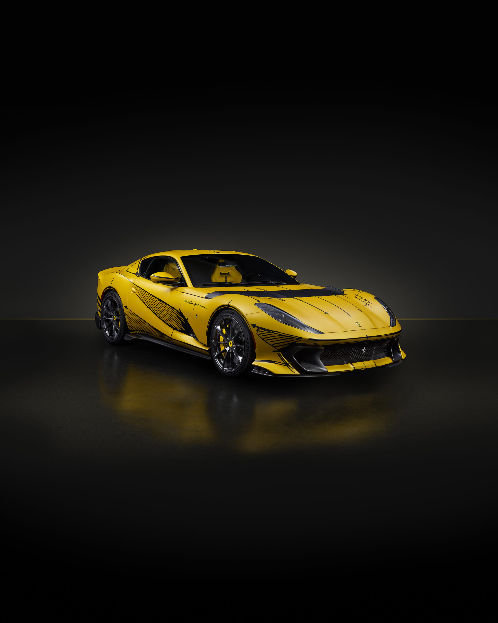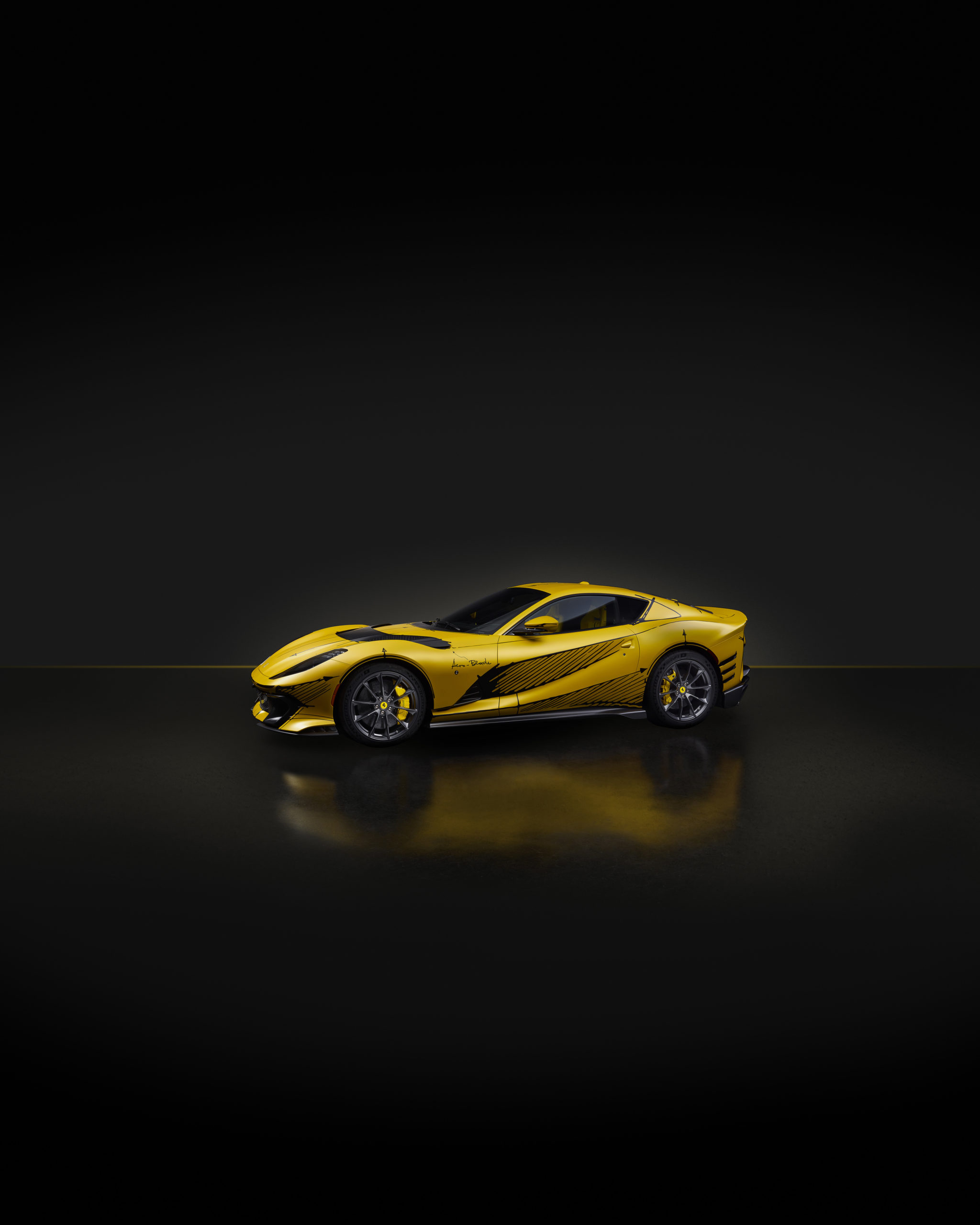 On the car, in matte Giallo Tristrato, the lines composed by the designer who imagined the elegant and sporty forms of the 812 Competizione and its most iconic details have been traced in matte Nero DS Sketch. Notable among them are the carbon fibre blade that cuts across the horizontal plane of the front bonnet acting as an air intake for the engine, the characteristic louvres on the side – a tribute to the best twelve-cylinder Ferrari tradition – as well as the vortex generators on the rear screen devoid of glass, replaced by a concealed rear-view camera.