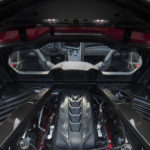 A lightweight, 3.2mm-thick glass panel on the rear hatch allows owners to show off the engine. This panel features a cantilevered trailing edge to evacuate heat from the LT2 engine compartment.
