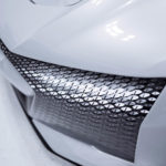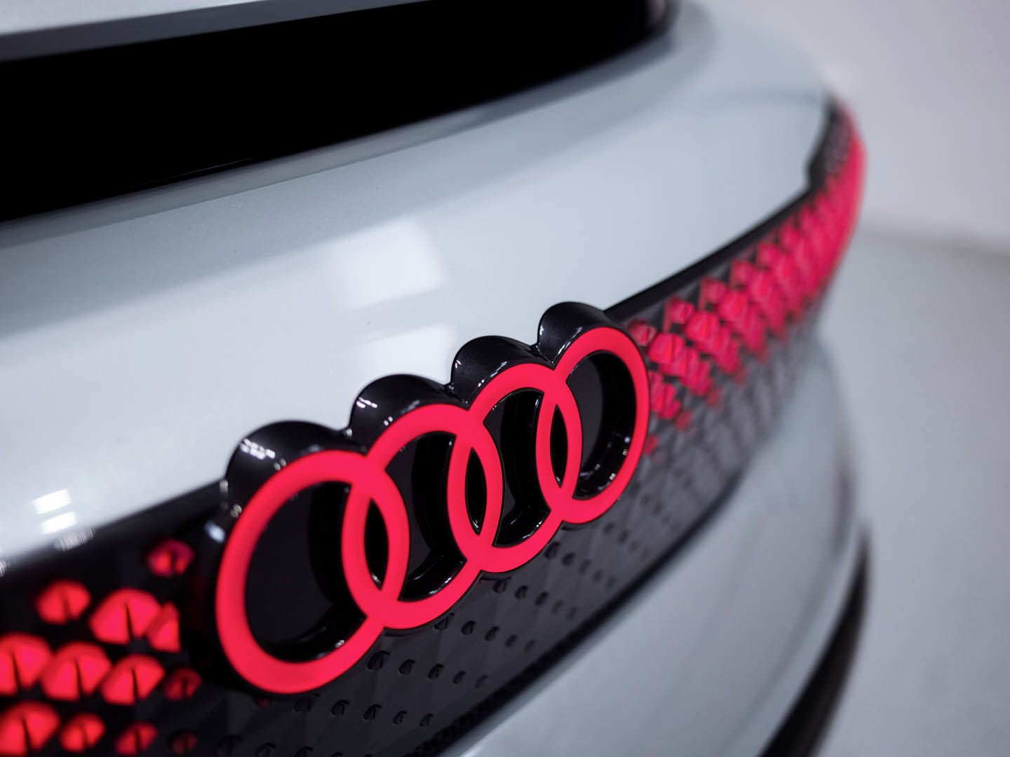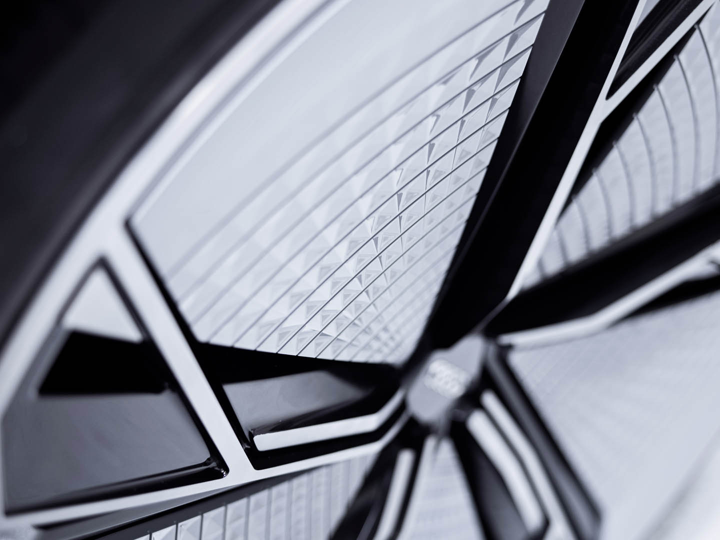 Conventional headlights and lighting units are absent from both the front and rear of this car. Instead there are fully digital display surfaces comprising hundreds of triangular pixel segments. They are three-dimensional recreations of the Audi AI symbol.