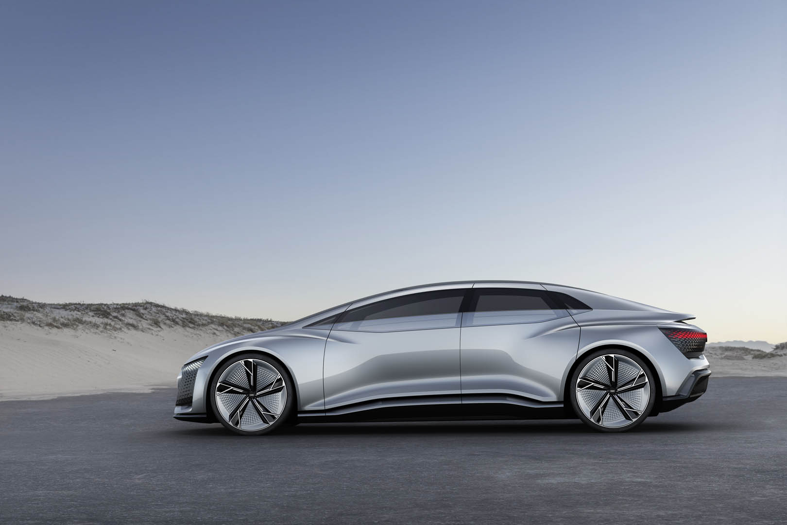 The Audi Aicon looks spectacular from any angle. Its sheer size – an exterior length of 5,444 millimeters (17.9 ft), a width of 2,100 millimeters (6.9 ft) and a height of 1,506 millimeters (4.9 ft) – places it in the automotive top tier, the D segment. The wheelbase measures 3,470 millimeters (11.4 ft). That’s 240 millimeters (9.4 in) more than with the long version of the new Audi A8.