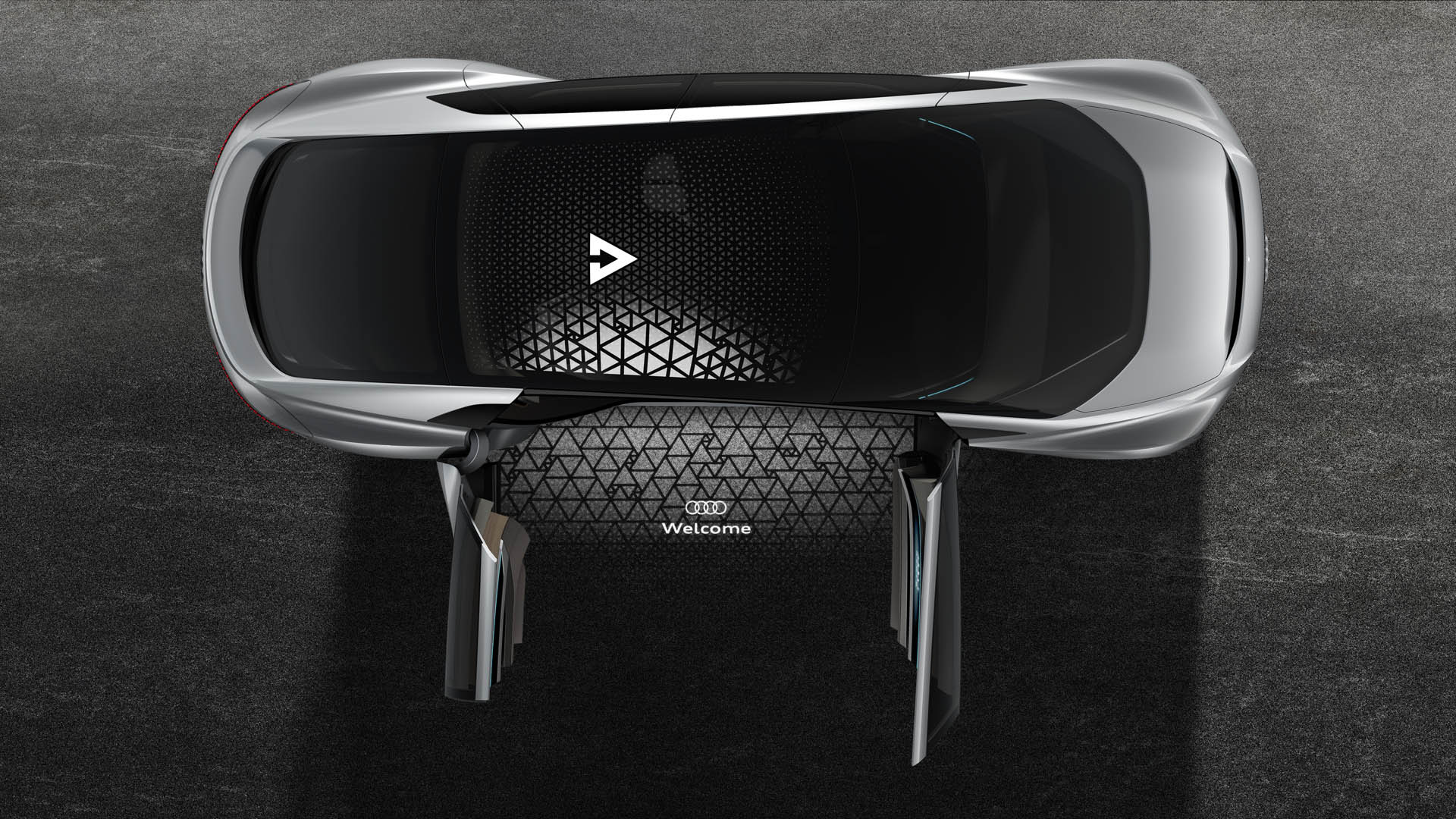 The Audi Aicon features opposed doors that open to the front and rear. There is no B-pillar. The entire breadth of the interior is thus exposed to the passengers as they get in the car. In the interior, the lines of the decorative surfaces and functional elements are markedly horizontal. Becoming lighter from bottom to top, the interior reinforces the impression of unique spaciousness, and the lack of a steering wheel and a classic dashboard creates a sense of openness and expanse.