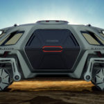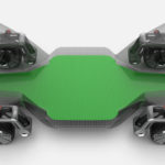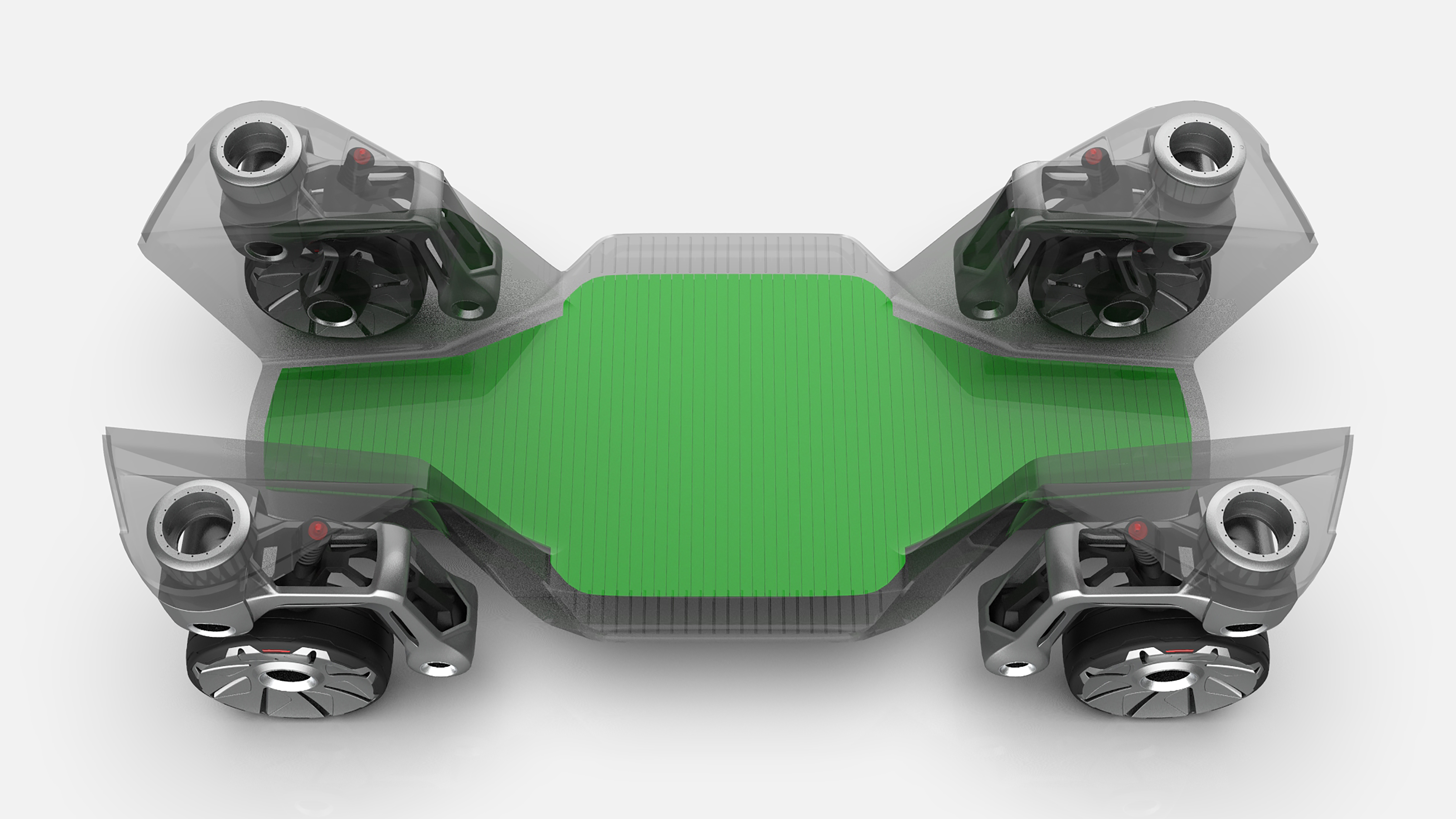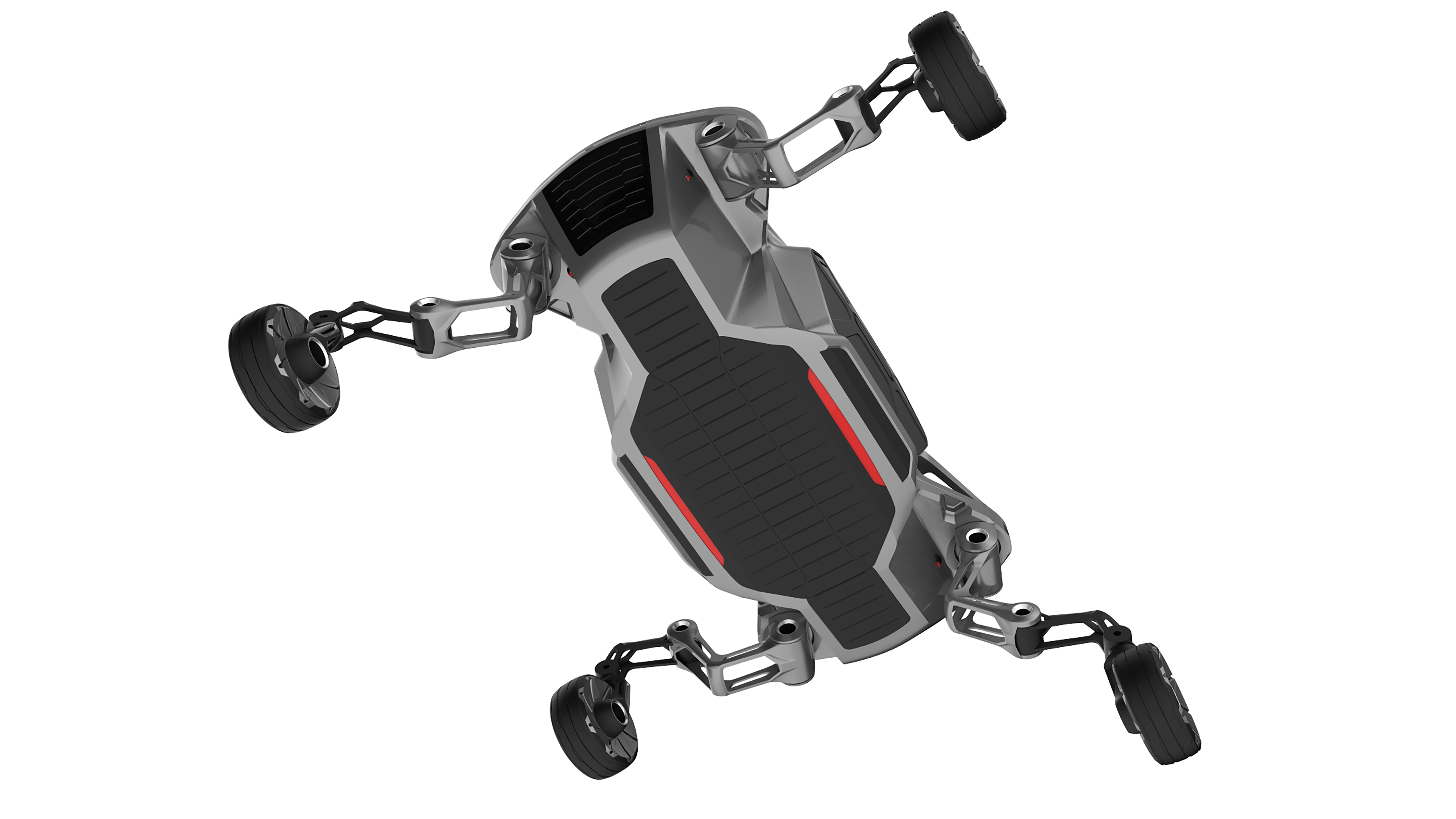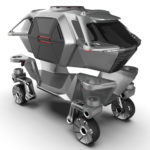 The Elevate concept is based on a modular EV platform with the capability to switch out different bodies for specific situations. The robotic leg architecture has five degrees of freedom plus wheel hub propulsion motors and is enabled by the latest in electric actuator technology. This design is uniquely capable of both mammalian and reptilian walking gaits, allowing it to move in any direction. The legs also fold up into a stowed drive-mode, where power to the joints is cut, and the use of an integrated passive suspension system maximizes battery efficiency. This allows Elevate to drive at highway speeds just like any other vehicle. But no other can climb a five foot wall, step over a five foot gap, walk over diverse terrain, and achieve a 15 foot wide track width, all while keeping its body and passengers completely level. Further, the combination of wheeled motion with articulating legs provides a new paradigm of mobility by enabling faster walking speeds, unique dynamic driving postures and torsional control at the end of each leg.