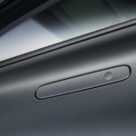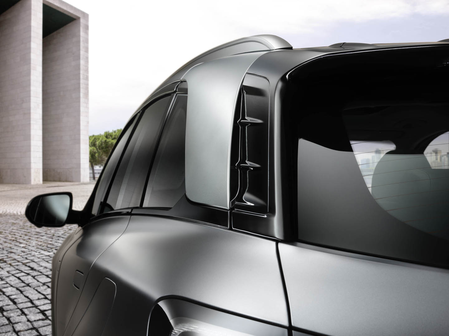 The seamless design continues over the side to the rear. The thin, floating roof is emphasised by the large daylight opening and slim D-pillar that runs into the rear spoiler. The rear features an almost triangular shaped window that wraps to the side and a long, prominent spoiler with an integrated rear wiper creating a distinct look. The triangular design of the rear headlamps combined with the horizontal layout of the rear gives the car a strong stance.