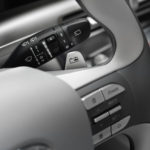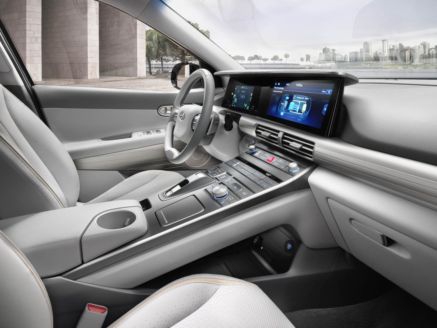 NEXO’s shift by wire function makes it possible to integrate a free floating central console. This solution leaves extra storage space underneath the console for personal items. Physical buttons operate the shift by wire, activate drive modes and change the climate settings; the physical control knob accesses navigation functions. A large lower tray holds the wireless charging and two USB ports.