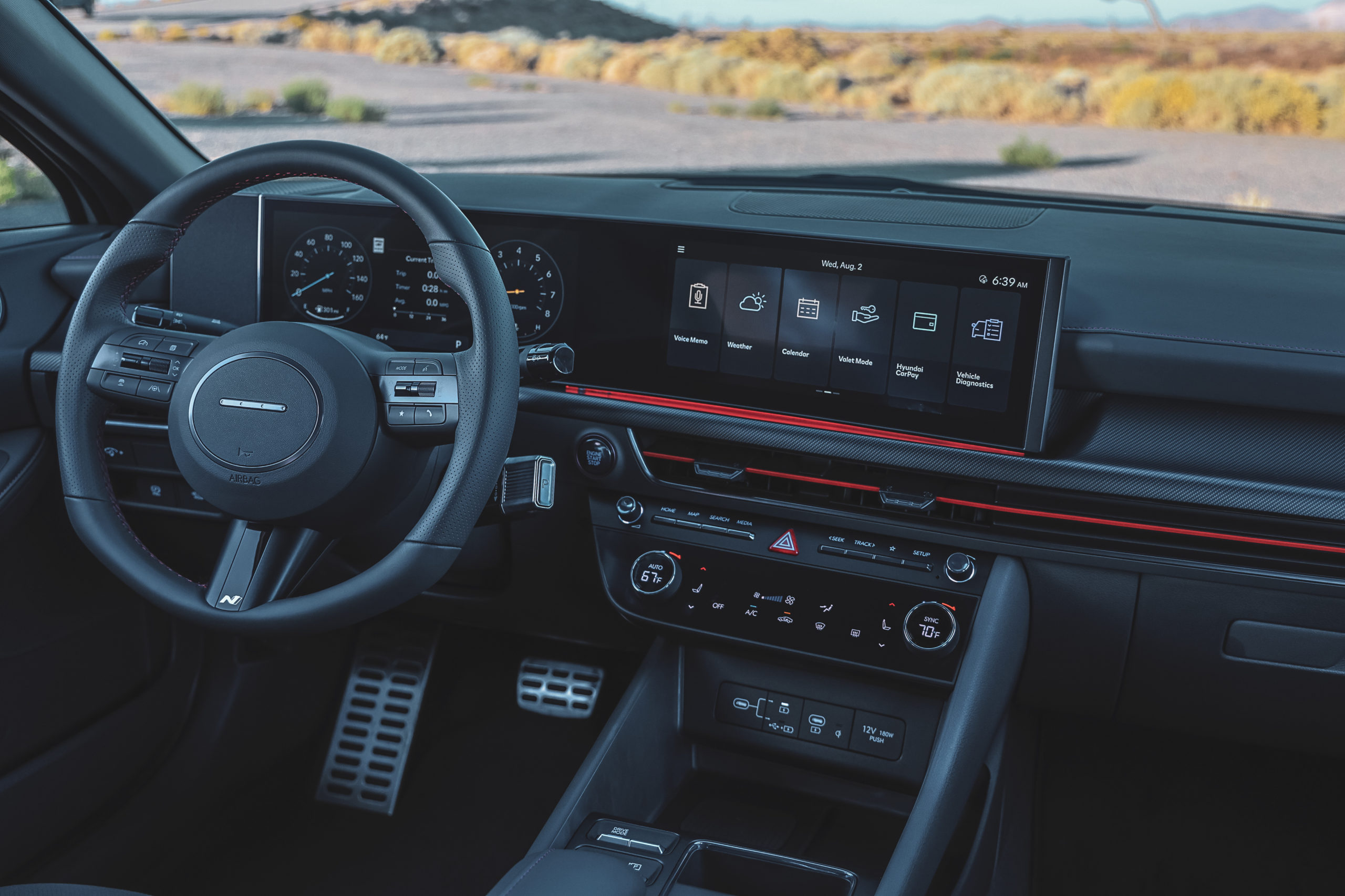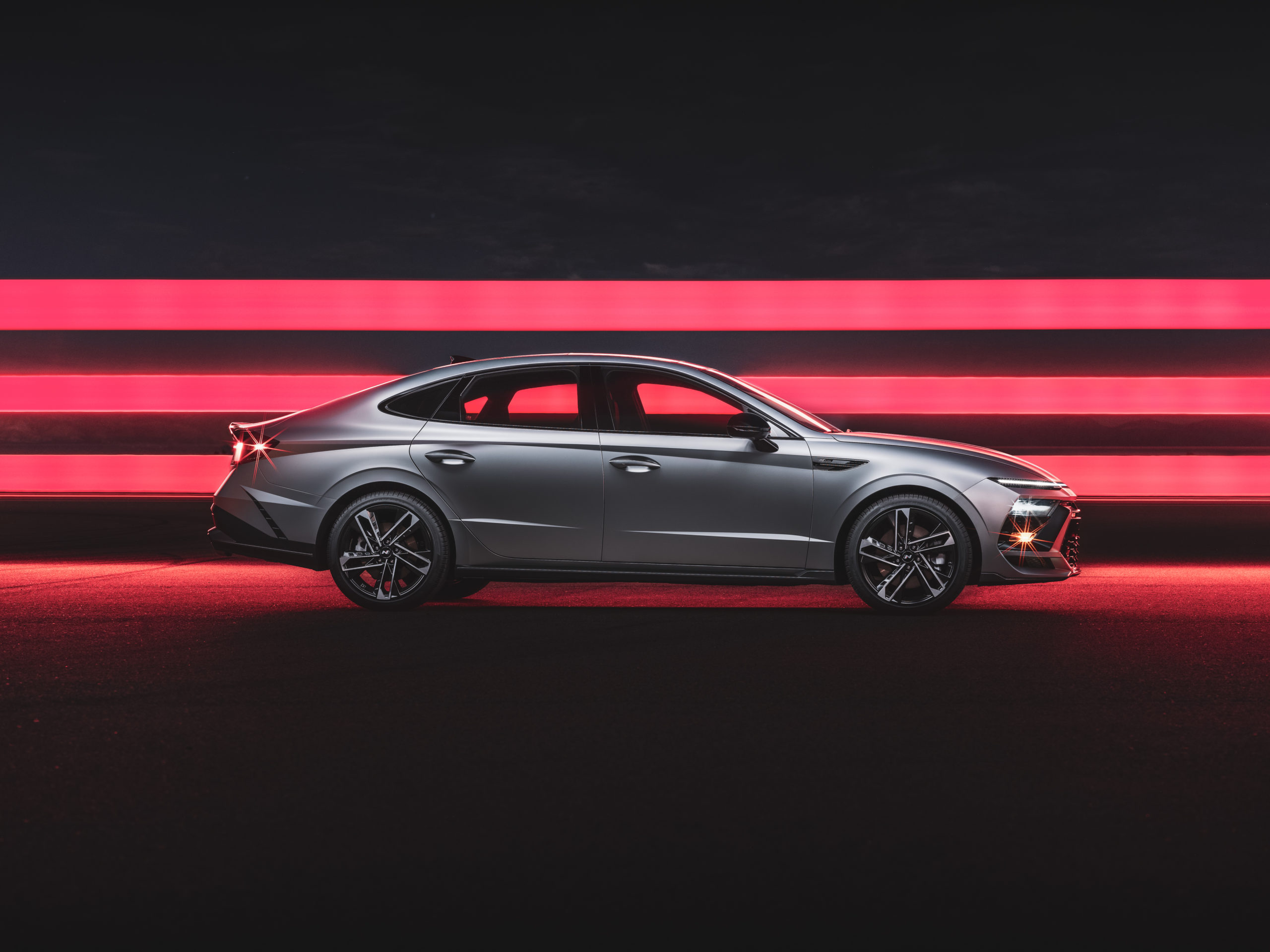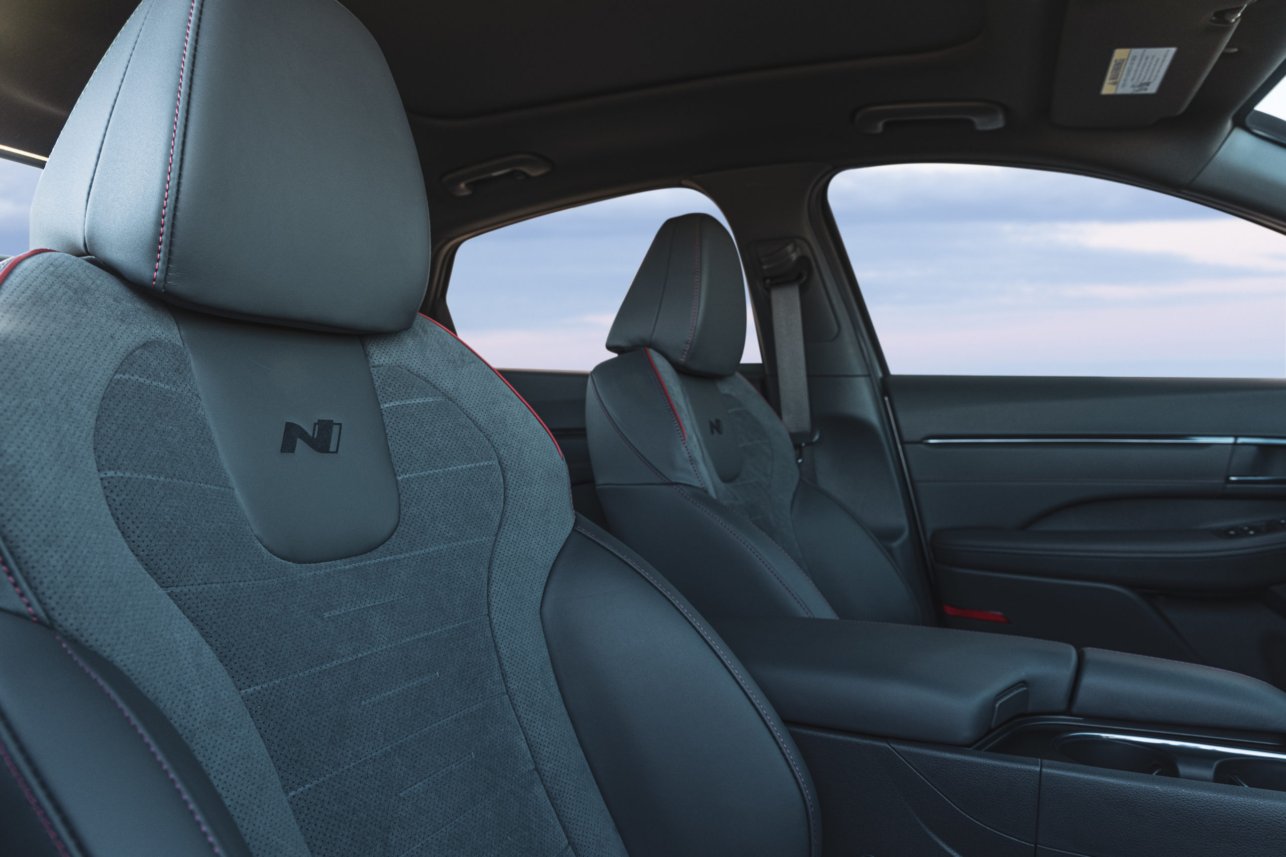 The interior is trimmed in a choice of black, dark gray and greige two-tone, and dark gray and camel two-tone. Dark gray with red stitching and N Line red paint is exclusive to the Sonata N Line model.