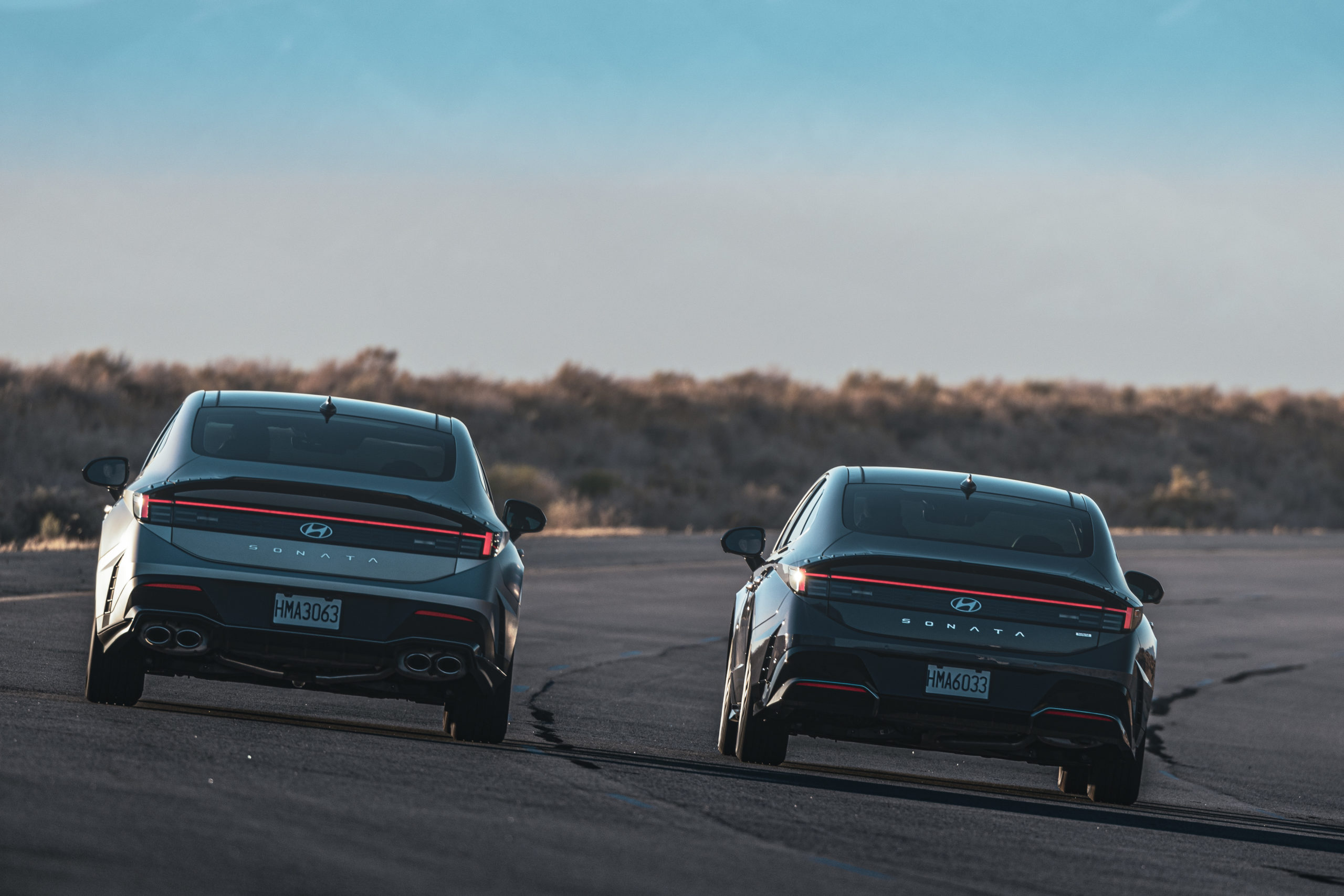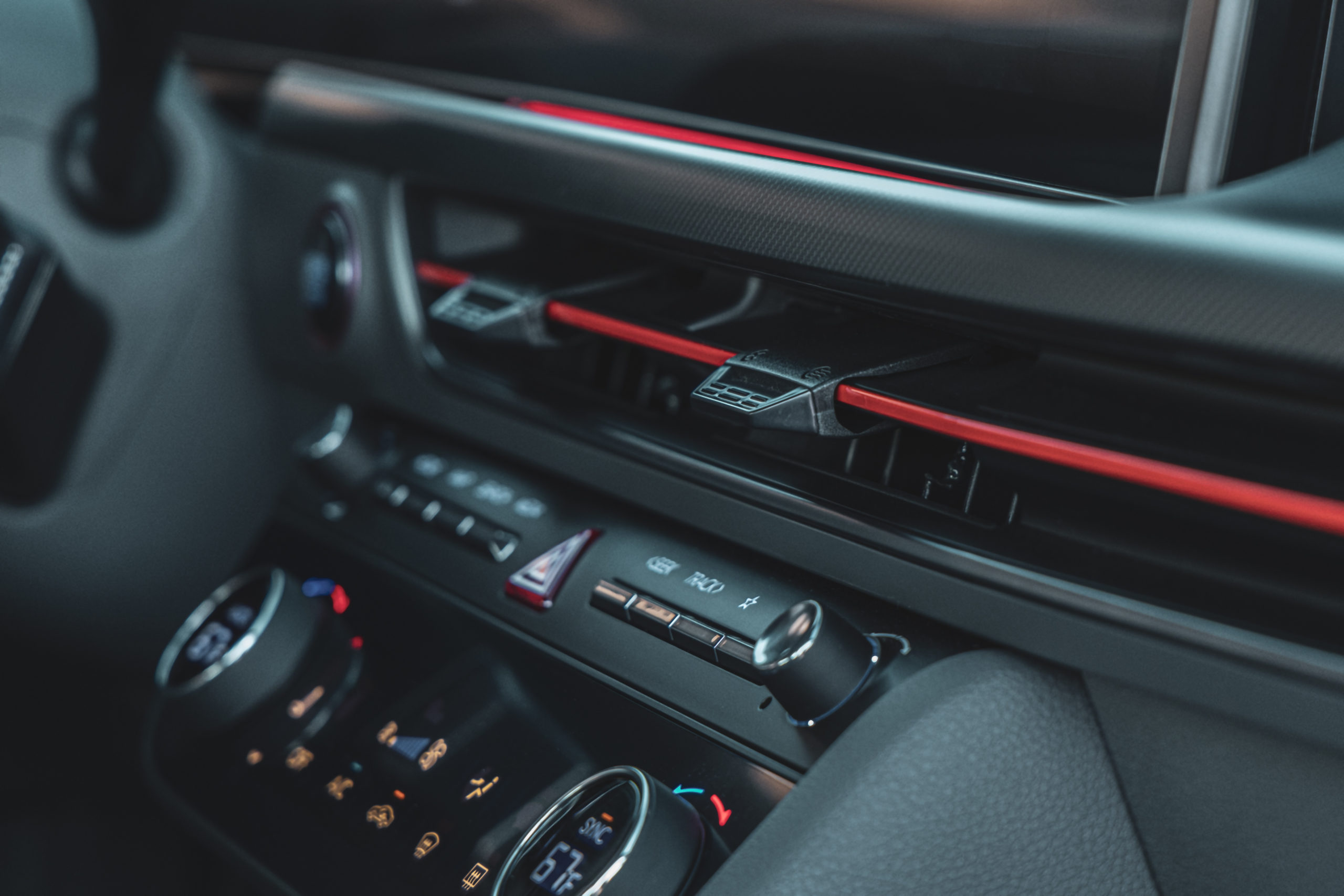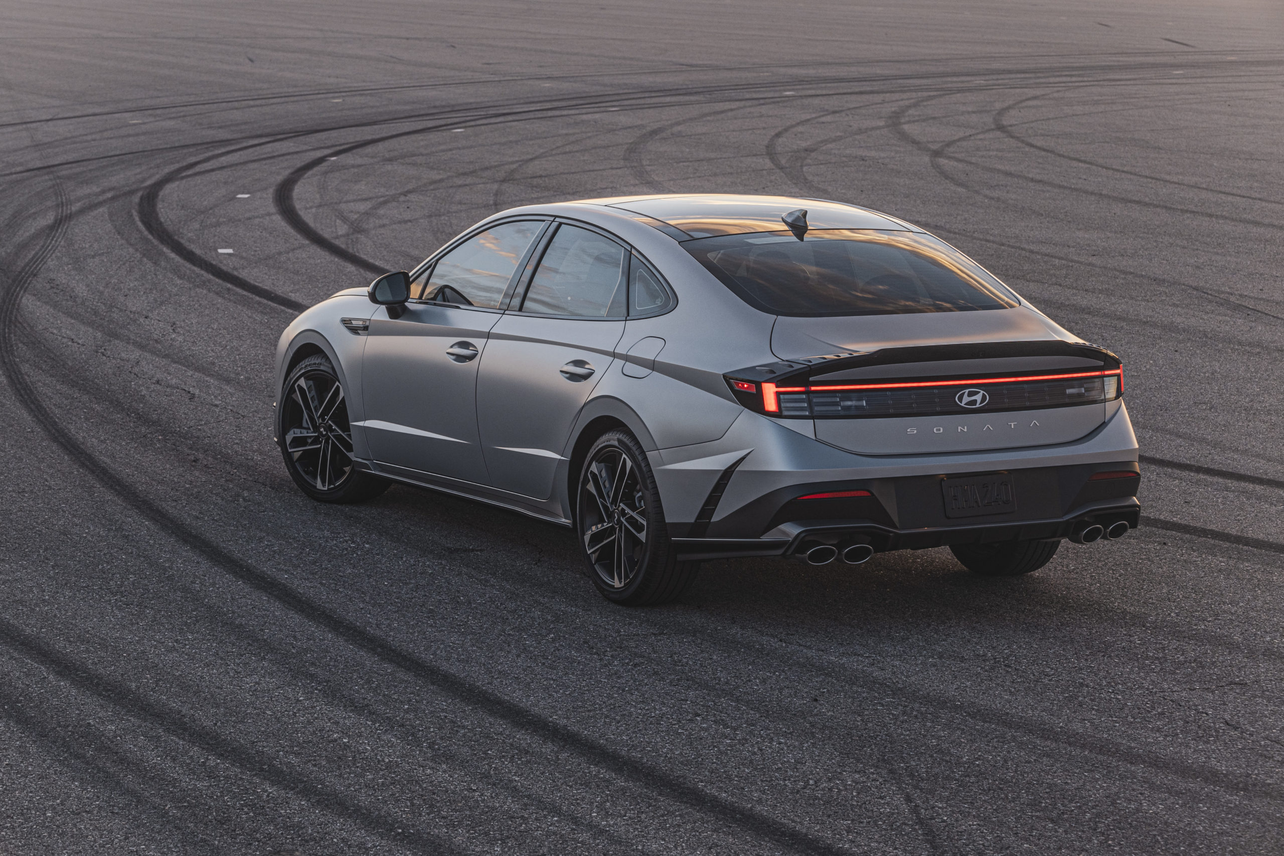 The interior is trimmed in a choice of black, dark gray and greige two-tone, and dark gray and camel two-tone. Dark gray with red stitching and N Line red paint is exclusive to the Sonata N Line model.