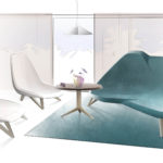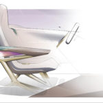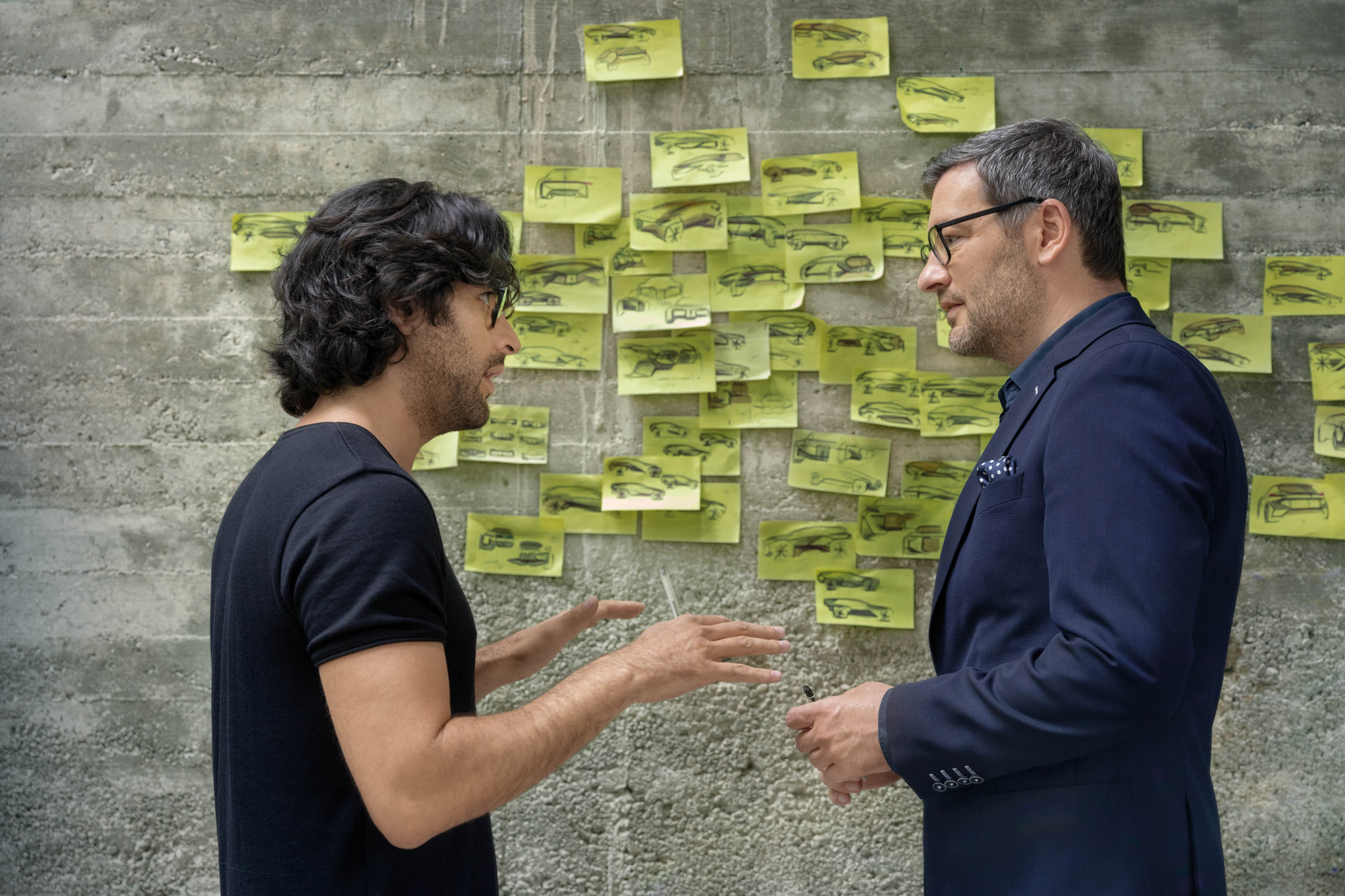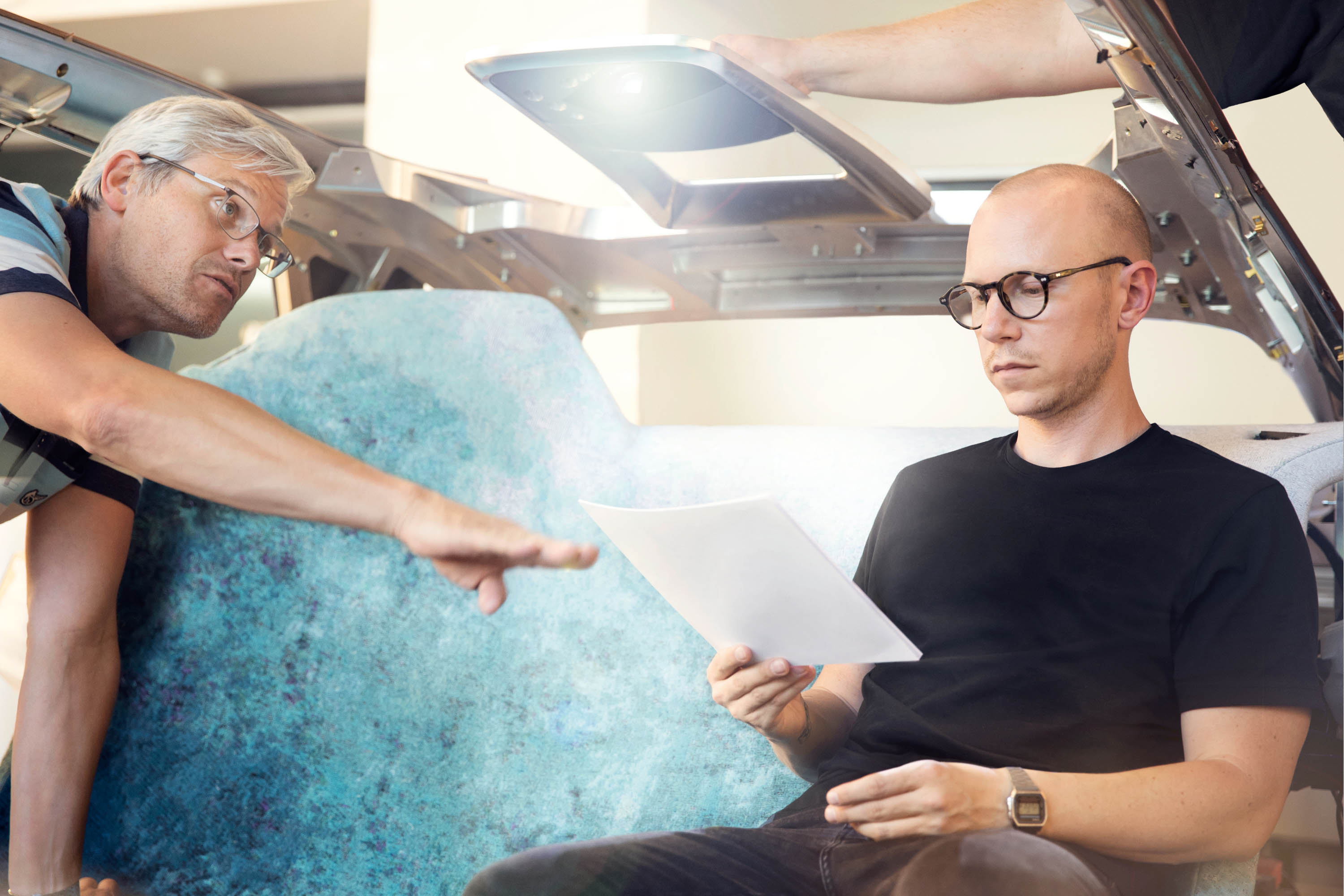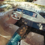 Inside the generously sized cockpit, the driver’s area is defined by the two visible digital display panels and the steering wheel. The flat dashboard with beige cloth covering teams up with touches of wood and a clearly patterned wooden floor to create a pleasant, homely ambience. In “Boost” mode, the steering wheel and displays are positioned clearly towards the driver. When “Ease” mode is engaged, the driver’s immediate environment changes: the steering wheel retracts slightly, creating a more open sense of space. The display panels switch from driving-related content to “Exploration Mode”, which provides the driver and passengers with suggestions of places and events in the surrounding area that could be of interest to them. Plus, the front seat head restraints can be folded back, allowing the people in the front to communicate more effectively with the passengers in the rear.