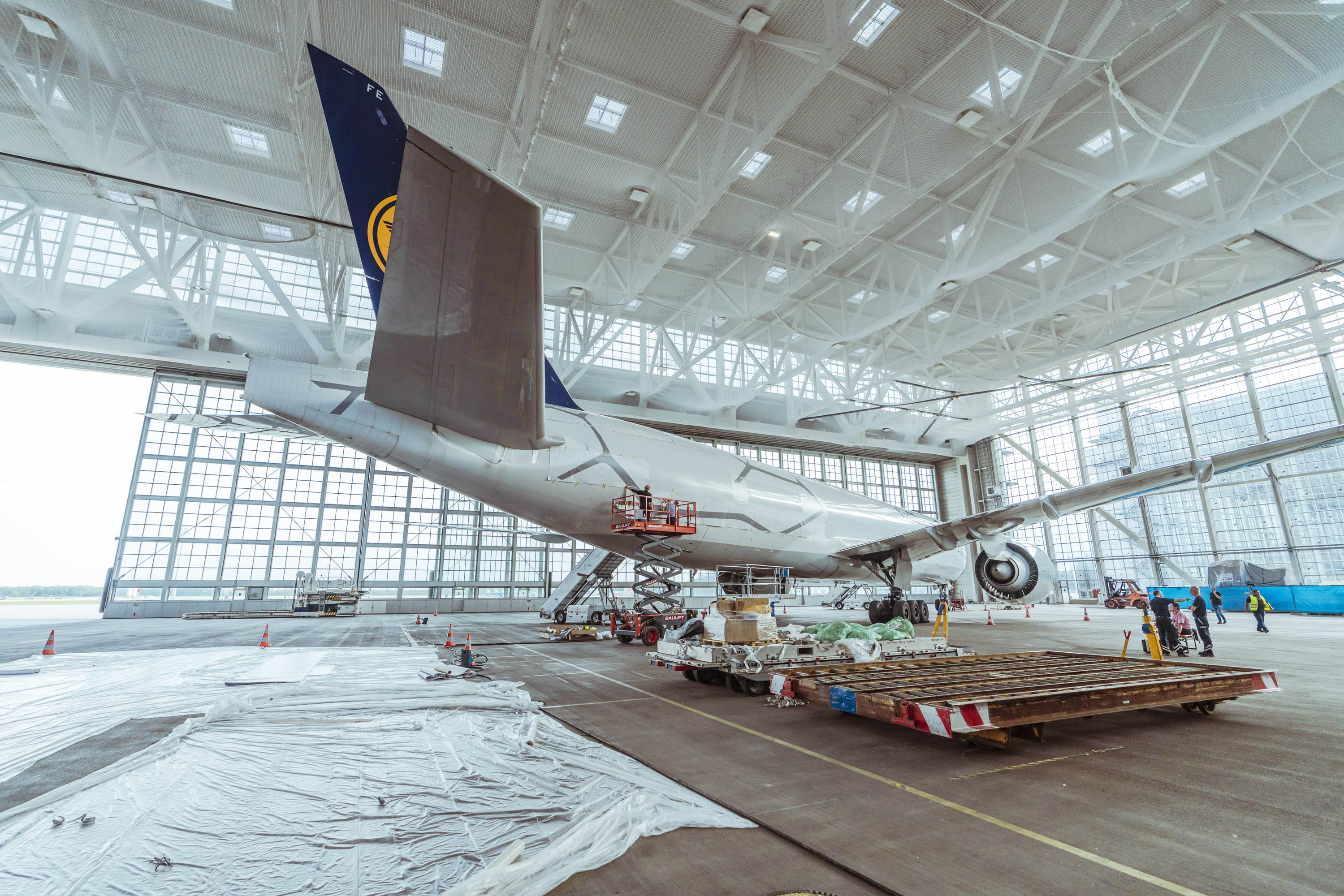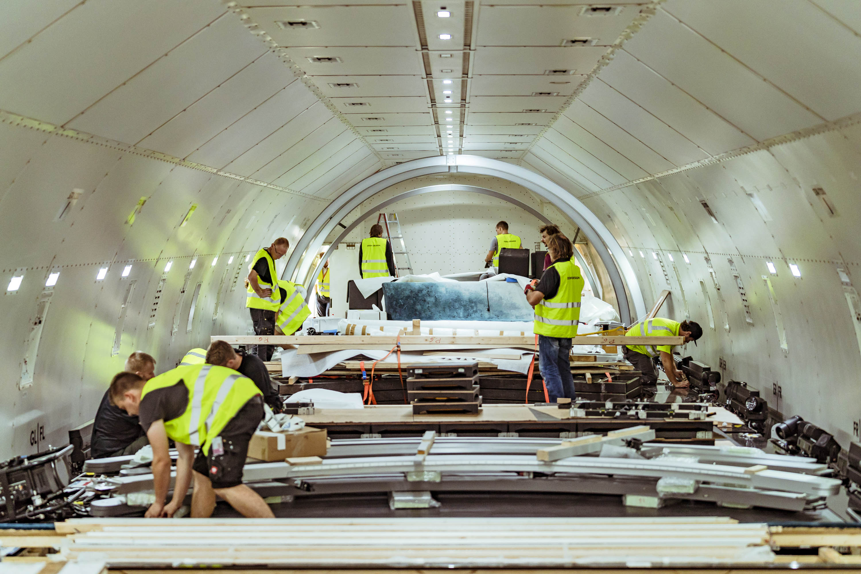 Preparations for the presentation event have involved laying more than 7.5 km of wiring, while 78,000 LEDs in 165 video LED modules and ten 13,000 ANSI lumen projectors create a show inside the Boeing aircraft that appeals to all the senses. Over 120 specialists in exhibition stand construction from Lufthansa Cargo and the BMW Group have played their part in making the project happen.