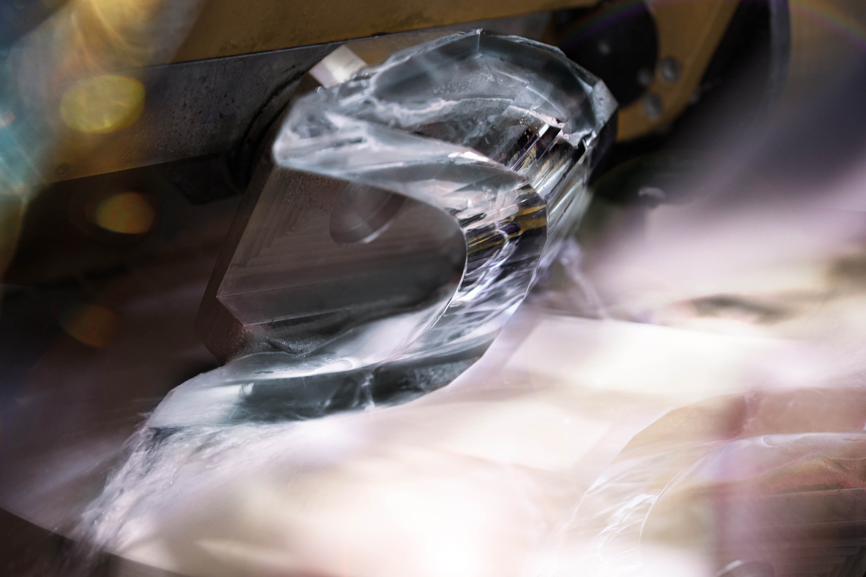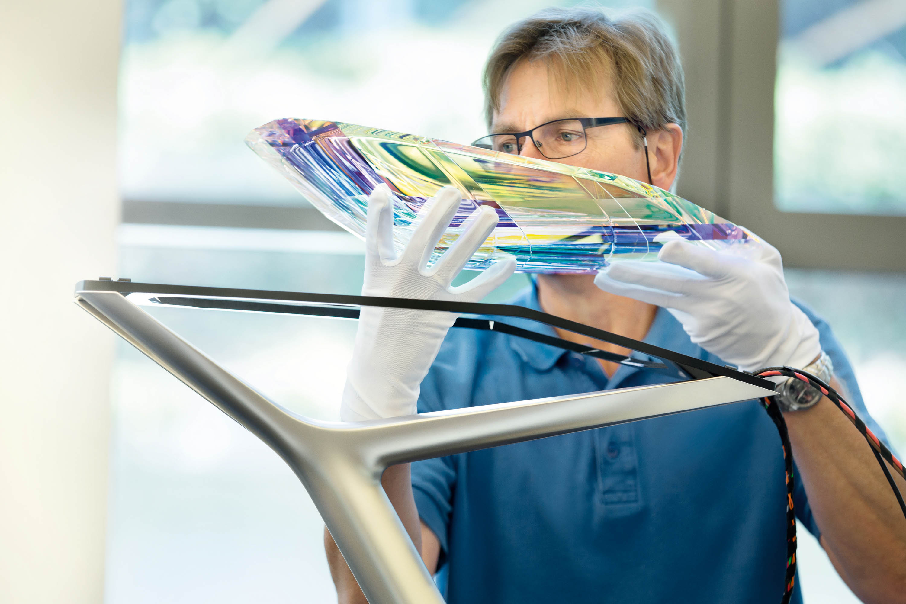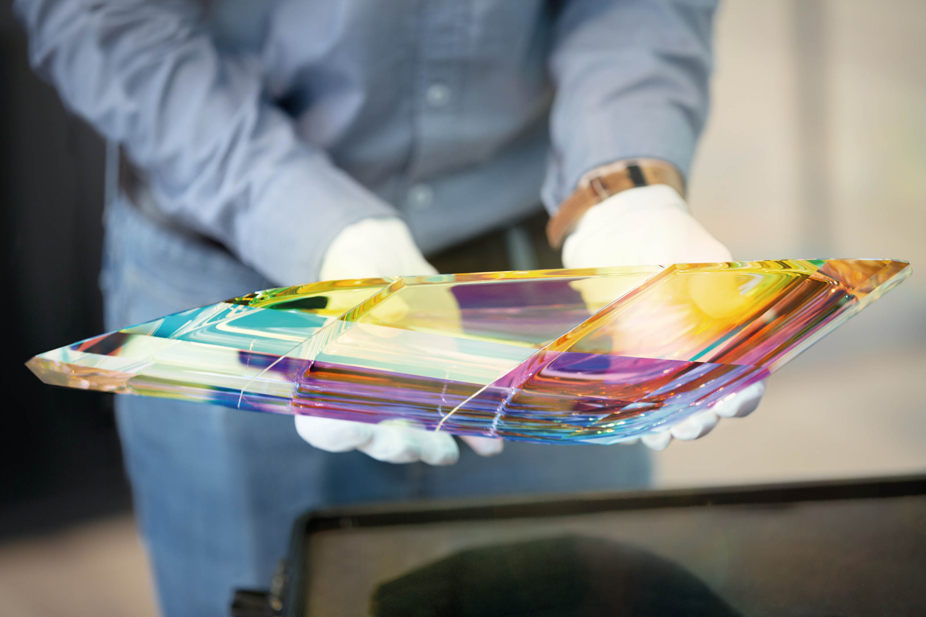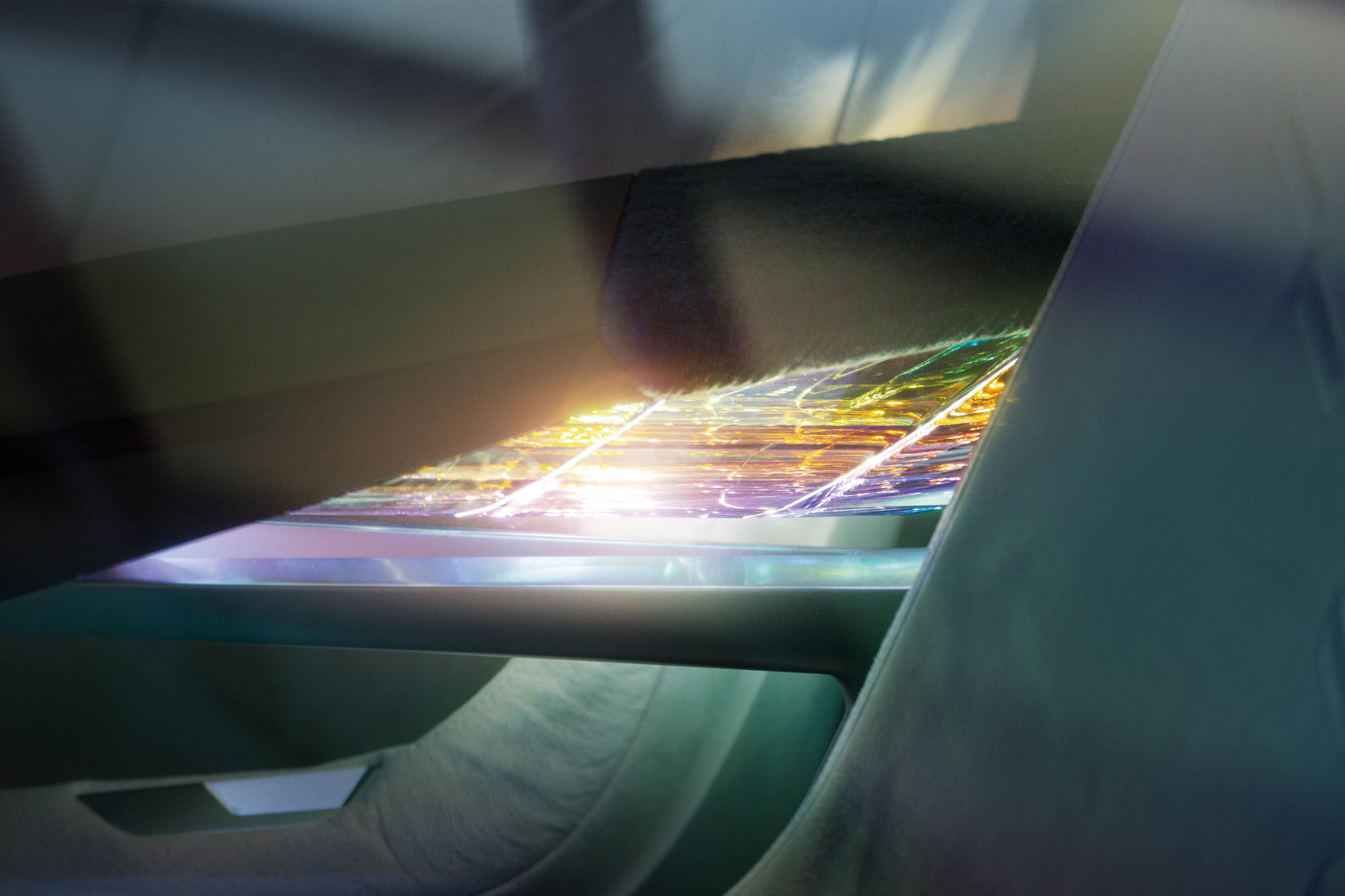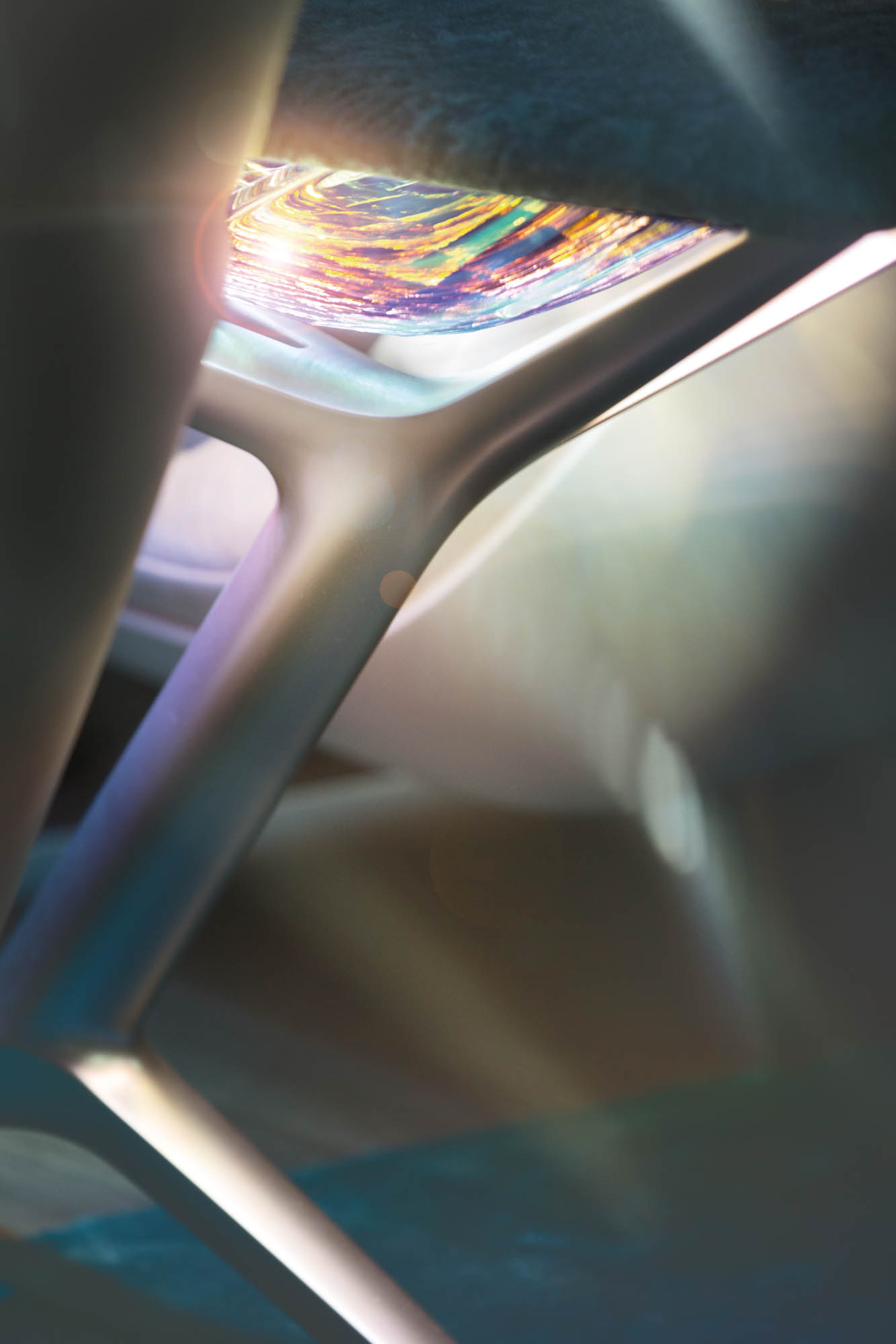The centre console between the front seats has all the makings of a high-quality piece of furniture, thanks to both its design and materials. A matt, open-pore wood finish gives it the appearance of a floating coffee table that continues right through to the rear. Under the fine wooden panel is a shell made from exquisite, illuminated crystal glass sitting atop a delicate, bronze-coloured base. The crystal’s faceting refracts the incoming light, splits it up into a multitude of colours and bathes the interior in light reflections.