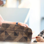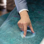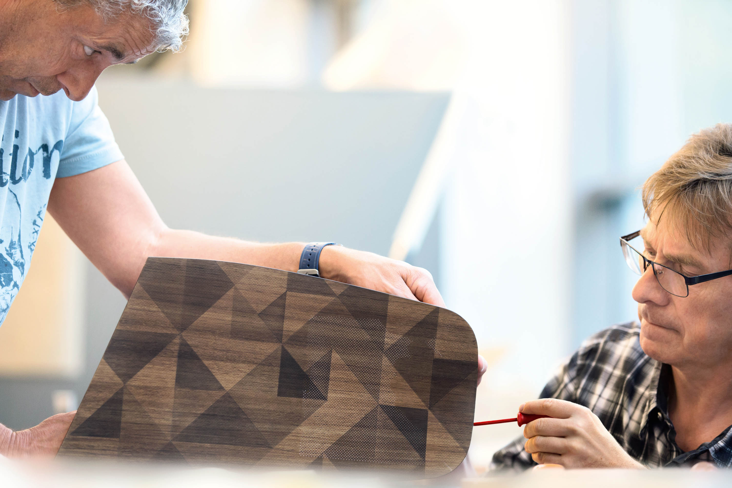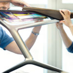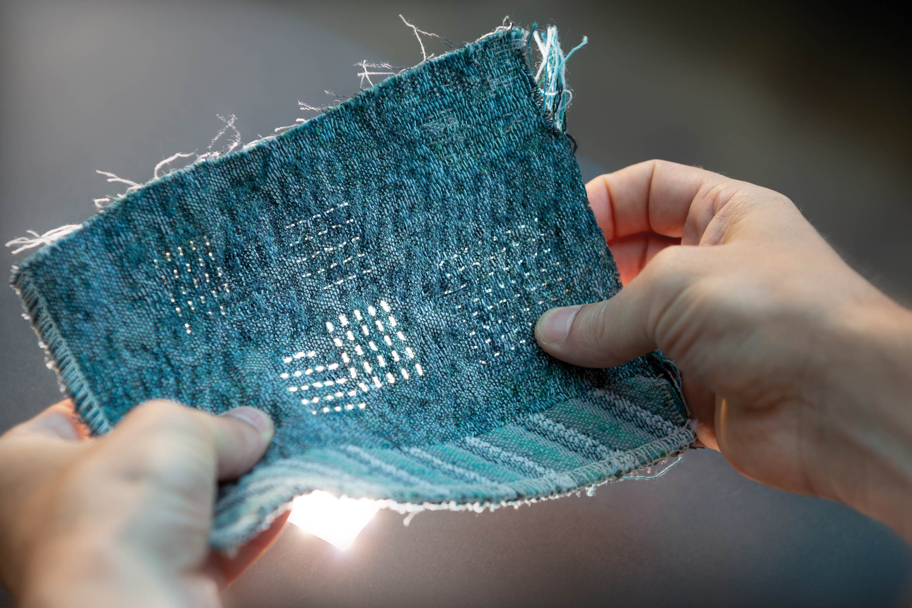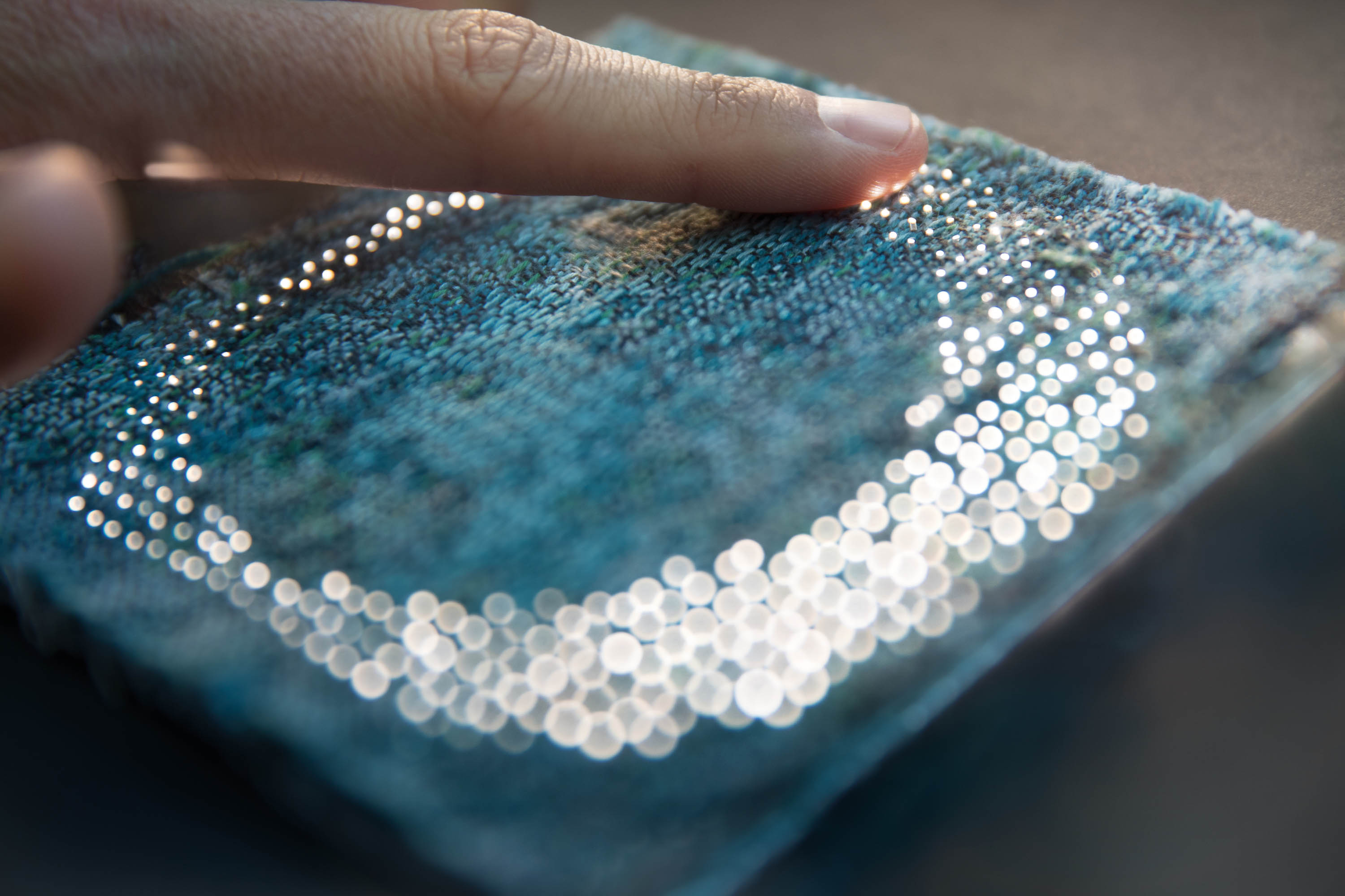 Intelligent Materials. When driving in “Boost” mood the Control Display can be operated in conventional style using its touch functionality. But in “Ease” mode, the centre console’s wooden surface assumes this control function instead. Arm and hand posture is just as relaxed as when using the iDrive Controller: the hand simply lies on the perforated wooden surface and, whenever any inputs are made, points of light resembling a comet’s tail will follow the finger. The Jacquard cloth in the rear also possesses integral control functionality. It comes to life at the touch of a finger and allows music playback to be controlled using various gestures, which are given visual emphasis by LEDs that light up underneath the cloth.