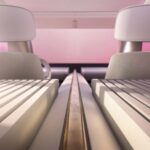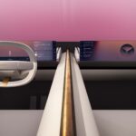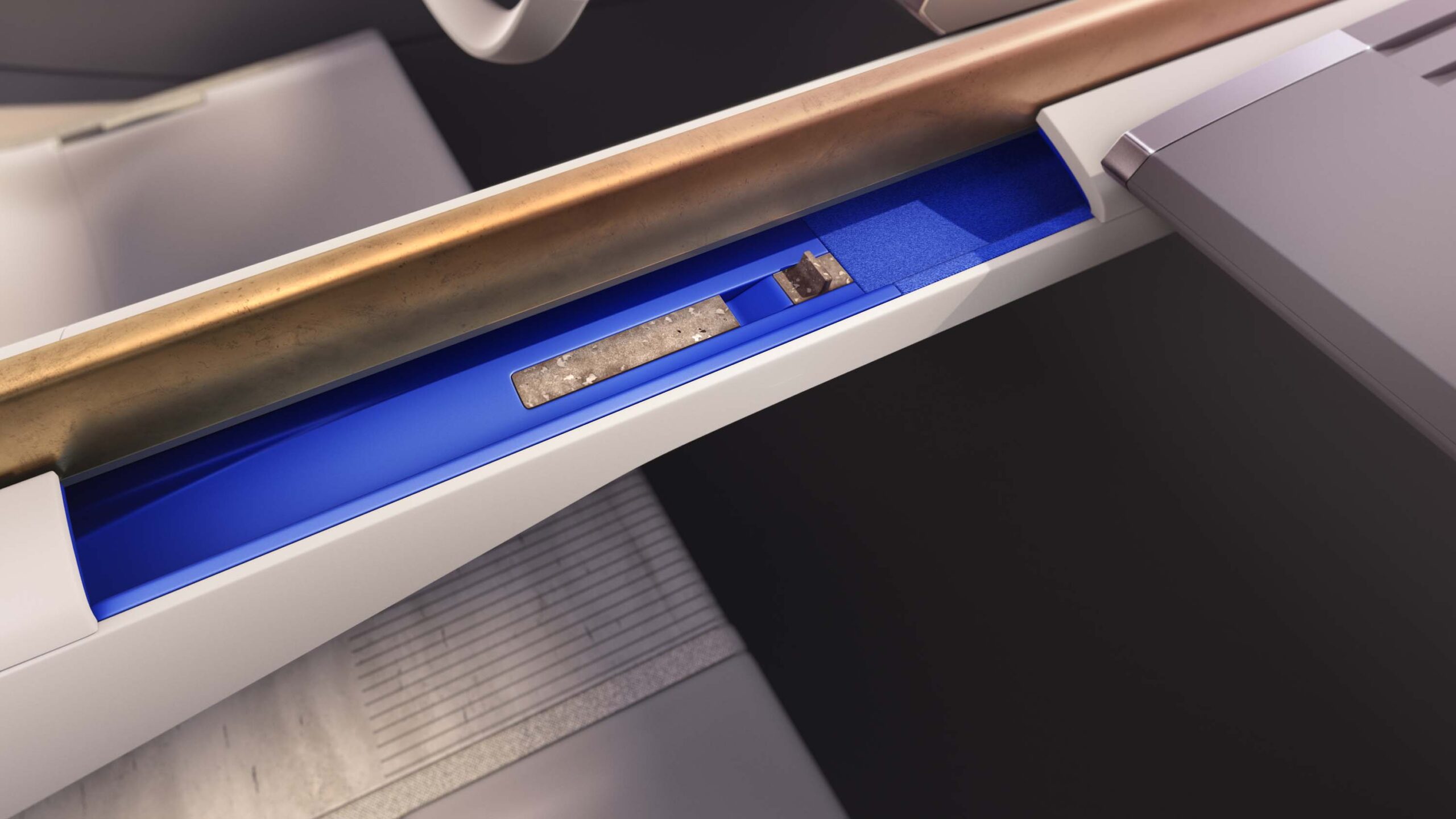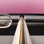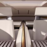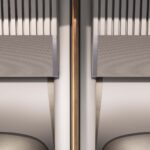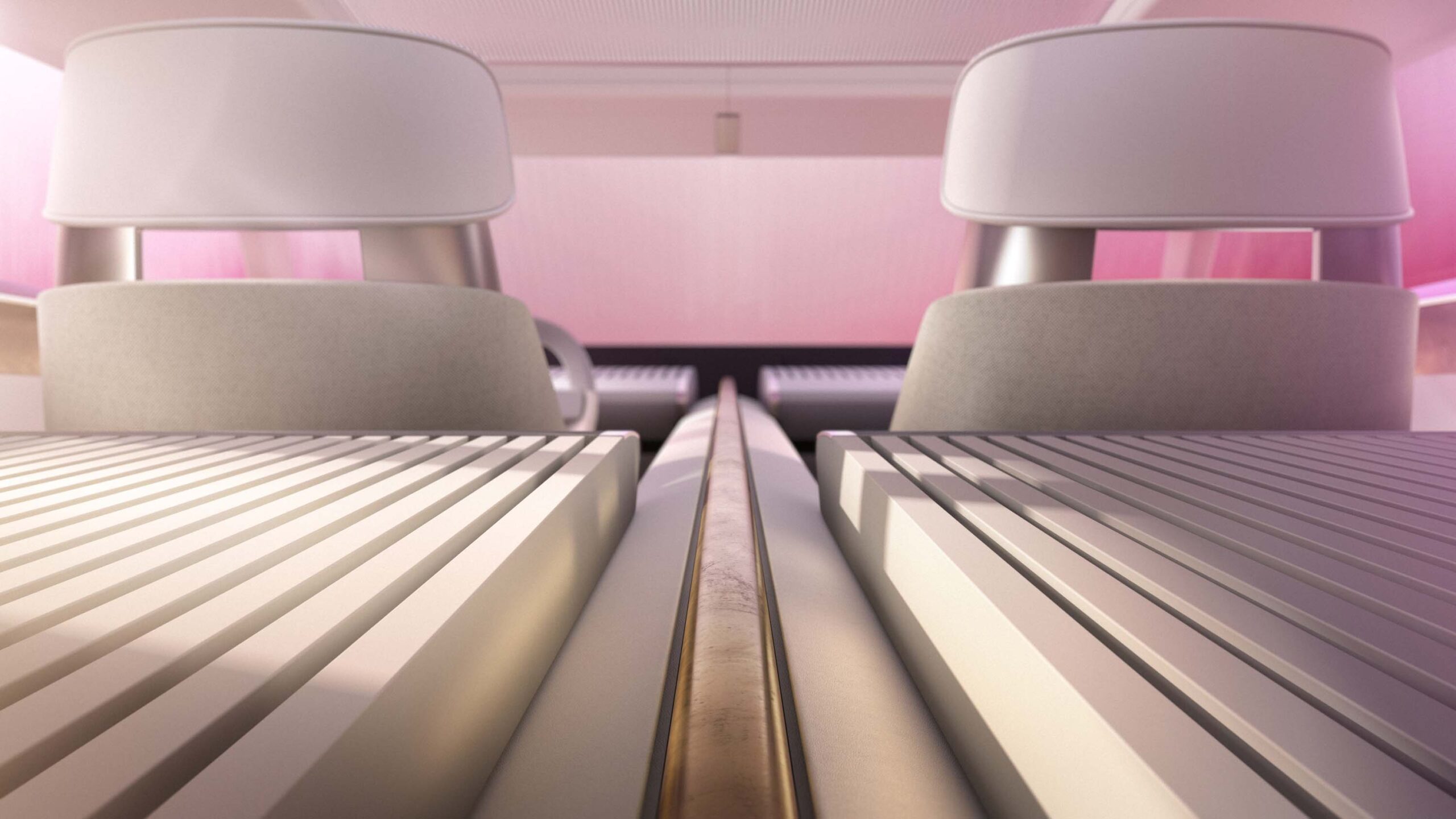 Soothing travertine stone functions as a plinth, supporting the floating seats and central spine. It inspires the rich layered tonal colour palette of the interior. Woven textiles add to the sense of craftsmanship. A tactile wool blend, inspired by handwoven yarns, envelops the two seats, sound bar and flooring.