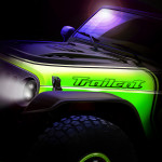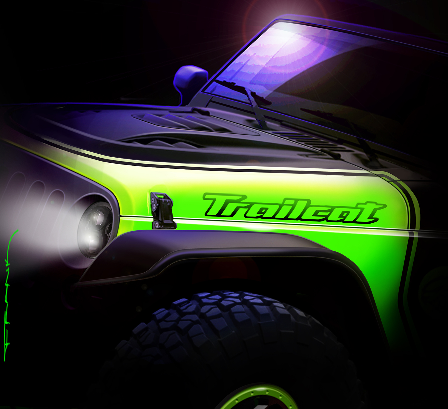 To get the 707-horsepower Hellcat engine into the Trailcat, designers stretched the wheelbase an additional 12 inches while chopping the windshield two inches for a sleeker look. Mopar exterior enhancements include a power-dome vented hood, Satin Black grille, LED headlamps and fog lamps and rock rails.