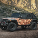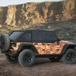 Mopar exterior enhancements include a winch guard, Satin Black grille, LED headlights and fog lights, high top fenders, power-dome vented hood, Mopar off-road rock rails with a step, Big Brake Kit, a concept fast-back soft top, tail light guards and a Mopar fuel filler door. Finishing the Trailstorm’s exterior upgrades are a steel front and rear Rubicon bumper and a Jeep Performance Parts tire carrier. The Trailstorm is wrapped in camouflage allowing it to blend into its surroundings in the Utah desert.