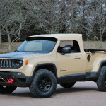 The Comanche’s “Beige Against the Machine” concept exterior paint is accented with a Satin Black hood, a concept lower front fascia, winch, steel rear bumper, soft top and spare tire in the bed. The wheelbase has been stretched an additional six inches versus a production Renegade to accommodate Comanche’s 5-foot bed.