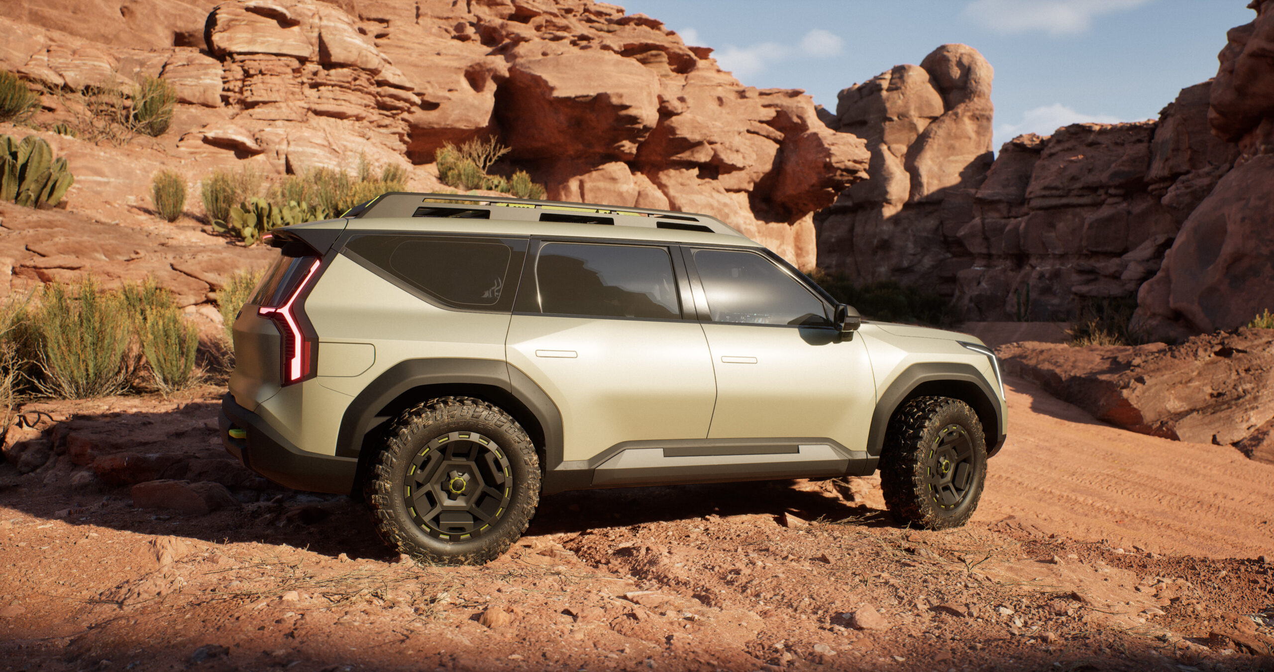 EV9 ADVNTR CONCEPT EV SUV – this truly unique all-electric 3-row SUV is designed to take life well beyond the beaten path.  And conquer it. Built for serious fun, this 2025 EV9 EV SUV has been refined into the most adventurous SUV Kia has ever imagined. With custom front and rear facias for a unique and rugged look – and a reinforced rocker panels for increased capability and character – the EV9 ADVNTR EV SUV also features a 3” lift compared to the standard EV9 and a rugged tire and wheel combination to maximize the vehicle’s off-road capability. A custom roof rack can handle everything from standard luggage containers to bespoke roof-mounted tents that transform the EV9 ADVNTR into a machine perfect for getaways in the great outdoors. Rough and ready, the EV9 ADVNTR EV SUV is Kia’s latest expression of a lifestyle utility vehicle ready for tomorrow’s adventures.