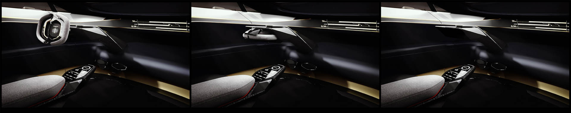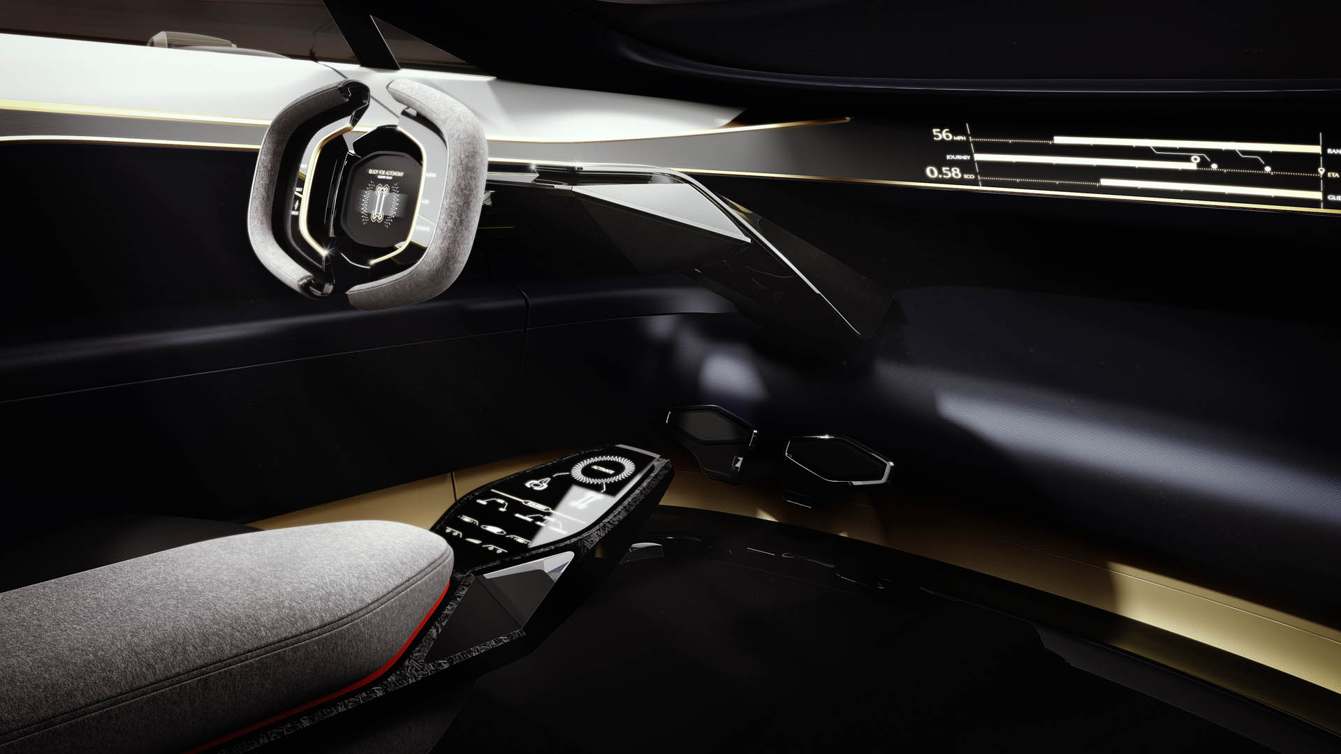‘When we first started working with David we showed him all these ideas we’d had for marquetry and leather on the inside and he said, “Let’s use different materials, materials people won’t expect even in isolation, let alone together.” Which is why the interior of the Lagonda Vision Concept uses not only ultra modern materials like carbon fibre and ceramics but also some of the oldest and finest that of late have rarely been used in the automotive sphere, like cashmeres and silks.’ The result is a cabin that surprises, shocks and fascinates, where silk carpets and hand woven wool upholstery live in perfect harmony with carbon fibre trim and functional ceramic tiles that open and close to alter the ventilation and adjust the volume of the music.